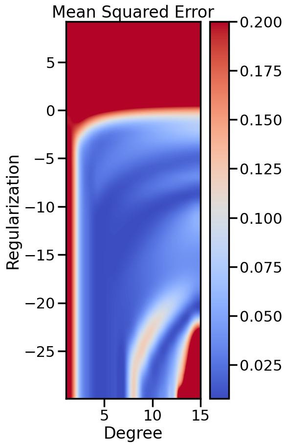 plt.figure(figsize=(5,10))plt.imshow(Zs, cmap=cm.coolwarm, # Allows you to set the color vmin=Zs.min(), vmax=0.2, # The min and max Z-Values (for coloring purposes) extent=[Xs.min(), Xs.max(), # How far on X-Axis you want to plot Ys.min(), Ys.max()], # How far on Y-Axis interpolation='spline16', # How do you want to interpolate values between data? origin='lower')plt.title('Mean Squared Error')plt.xlabel('Degree')plt.ylabel('Regularization')plt.colorbar()