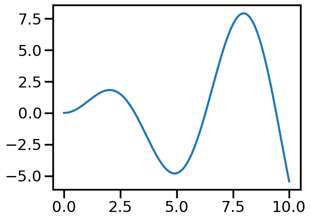 def f(x):"""The function to predict."""return x * np.sin(x)# Try others!#return 5 * np.sinc(x)#return xX = np.atleast_2d(np.linspace(0, 10, 200)).T# Observationsy = f(X).ravel()plt.figure()plt.plot(X,y)plt.show()