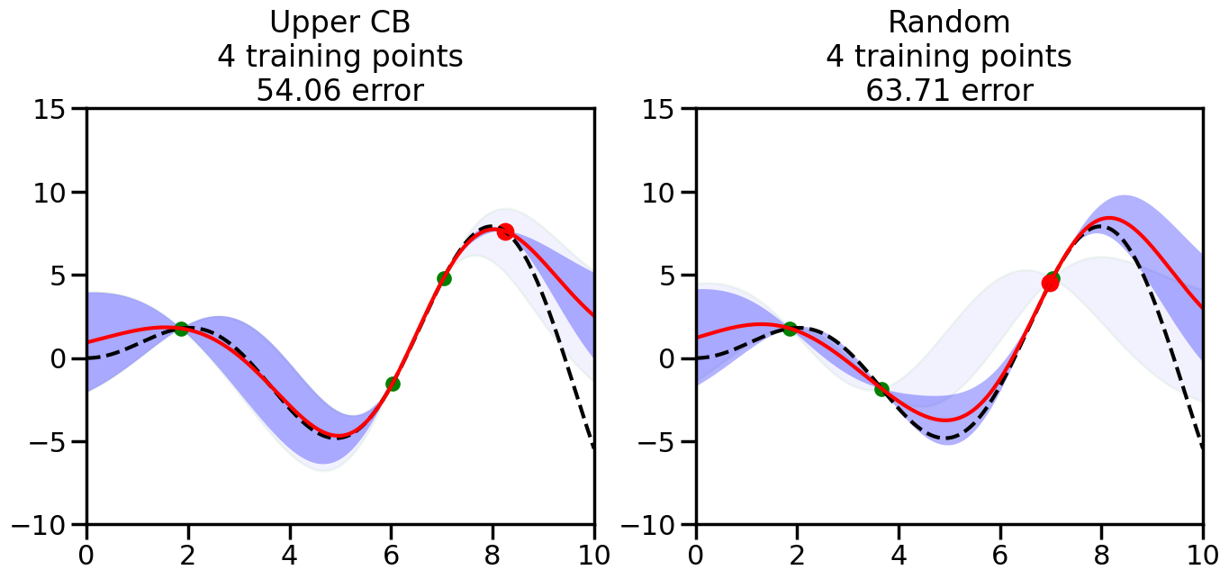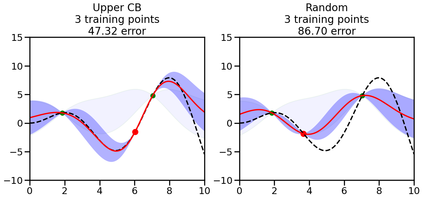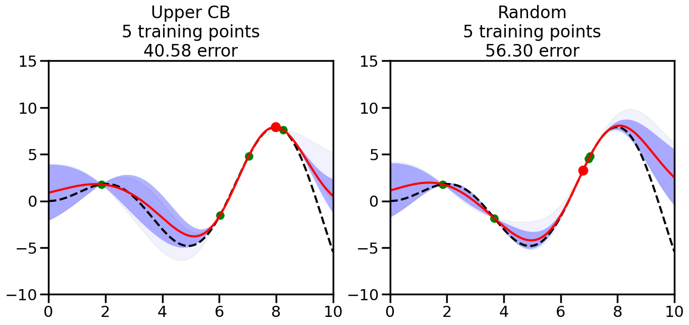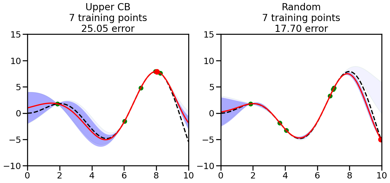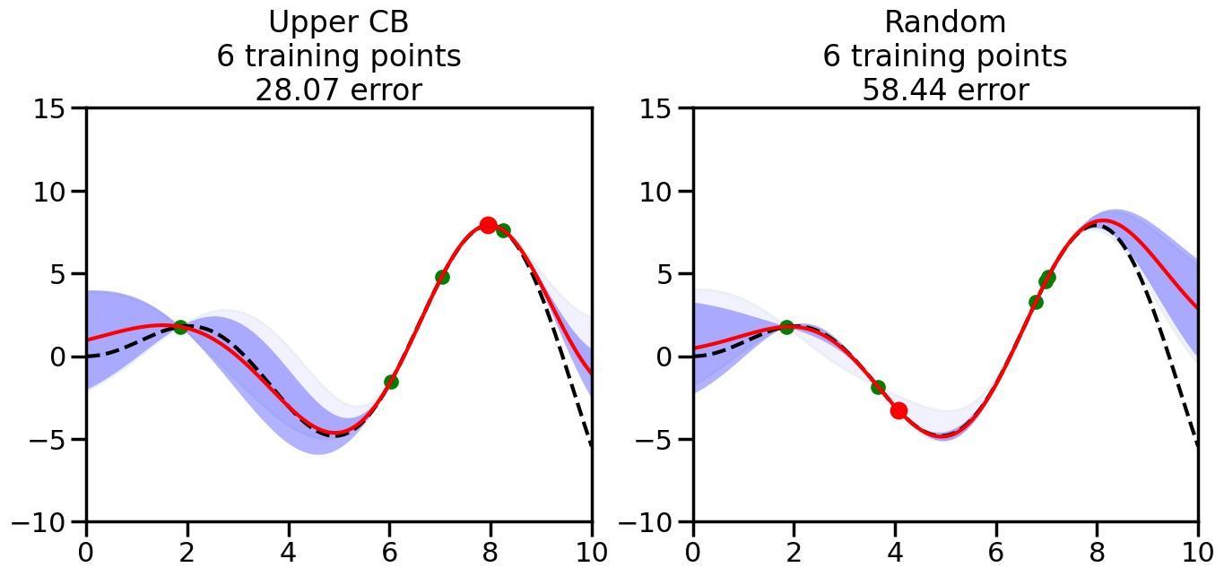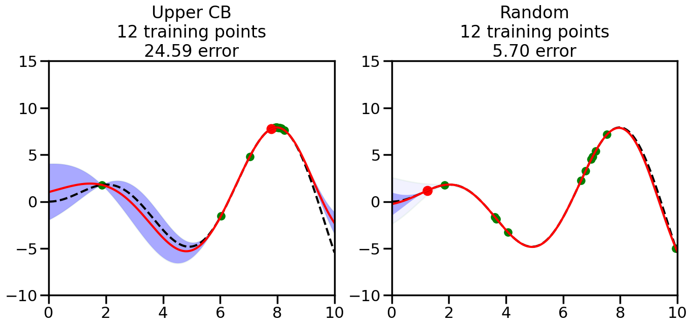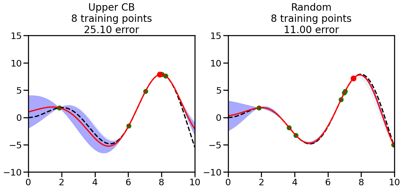 ######################################################### This is just a helper function, no need to worry about# The internals.# We will return to this example in Week 14########################################################from sklearn.gaussian_process import GaussianProcessRegressorfrom sklearn.gaussian_process.kernels import RBF, ConstantKernel as Cnp.random.seed(1)# Mesh the input space for evaluations of the real function, the prediction and# its MSEx = np.atleast_2d(np.linspace(0, 10, 1000)).T# Create a Gaussian Process model#kernel = C(1.0, (1e-3, 1e3)) * RBF(10, (1e-2, 1e2))kernel = C(1.0, (1e-3, 1e3)) * RBF(10, (1e-2, 1e2))#gp = GaussianProcessRegressor(kernel=kernel, n_restarts_optimizer=9)kernel = C(3.0)*RBF(1.5)gp = GaussianProcessRegressor(kernel=kernel,alpha=1e-6,optimizer=None)#gp = GaussianProcess(corr='cubic', theta0=1e-2, thetaL=1e-4, thetaU=1e-1,random_start=100)# Now, ready to begin learning:train_ind ={'Upper CB': np.zeros(len(X),dtype=bool),'Random':np.zeros(len(X),dtype=bool)}options = train_ind.keys()possible_points = np.array(list(range(len(X))))# Possible Initialization options# 1. Select different points randomly#for i in range(2):# for o in options:# ind = np.random.choice(possible_points[~train_ind[o]],1)# train_ind[o][ind] = True# 2. Start with end-points#for o in options:# train_ind[o][0] = True# train_ind[o][-1] = True# 3. Start with same random pointsfor ind in np.random.choice(possible_points,2):for o in options: train_ind[o][ind] =Trueplot_list = np.array([5,10,20,30,40,50,len(X)])for i inrange(10):# As i increases, we increase the number of points plt.figure(figsize=(16,6))for j,o inenumerate(options): plt.subplot(1,2,j+1) gp.fit(X[train_ind[o],:],y[train_ind[o]]) yp,sigma = gp.predict(X[~train_ind[o],:], return_std=True) ucb = yp +1.96*sigmaif o =='Upper CB':#candidates = np.extract(MSE == np.amax(MSE),X[~train_ind[o],:]) candidates = np.extract(ucb == np.amax(ucb),X[~train_ind[o],:]) next_point = np.random.choice(candidates.flatten()) next_ind = np.argwhere(X.flatten() == next_point)elif o =='Random': next_ind = np.random.choice(possible_points[~train_ind[o]],1) train_ind[o][next_ind] =True# Plot intermediate results yp,sigma = gp.predict(x, return_std=True) plt.fill(np.concatenate([x, x[::-1]]), np.concatenate([yp -1.9600* sigma, (yp +1.9600* sigma)[::-1]]),'b', alpha=0.05, ec='g', label='95% confidence interval') n_train = np.count_nonzero(train_ind[o]) gp.fit(X[train_ind[o],:],y[train_ind[o]])# Show progress yp,sigma = gp.predict(x, return_std=True) yt = f(x) error = np.linalg.norm(yp-yt.flatten()) plt.fill(np.concatenate([x, x[::-1]]), np.concatenate([yp -1.9600* sigma, (yp +1.9600* sigma)[::-1]]),'b', alpha=0.3, ec='None', label='95% confidence interval') plt.plot(x,yt,'k--',alpha=1) plt.plot(x,yp,'r-',alpha=1) plt.scatter(X[train_ind[o],:],y[train_ind[o]],color='g',s=100) plt.scatter(X[next_ind,:].flatten(),y[next_ind].flatten(),color='r',s=150) plt.ylim([-10,15]) plt.xlim([0,10]) plt.title("%s\n%d training points\n%.2f error"%(o,n_train,error)) plt.show()