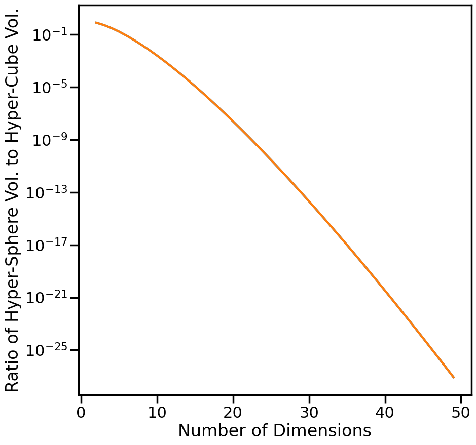 from math import gammaV_sphere =lambda d: np.pi**(d/2.0)V_cube =lambda d: d*2**(d-1)*gamma(d/2.0)volume_ratio =lambda d: V_sphere(d)/V_cube(d)d =range(2,50)ratio = [volume_ratio(i) for i in d]plt.figure(figsize=(10,10))plt.plot(d,ratio)plt.semilogy(d,ratio)plt.ylabel("Ratio of Hyper-Sphere Vol. to Hyper-Cube Vol.")plt.xlabel("Number of Dimensions")plt.show()# TODO: Add distance min/max example