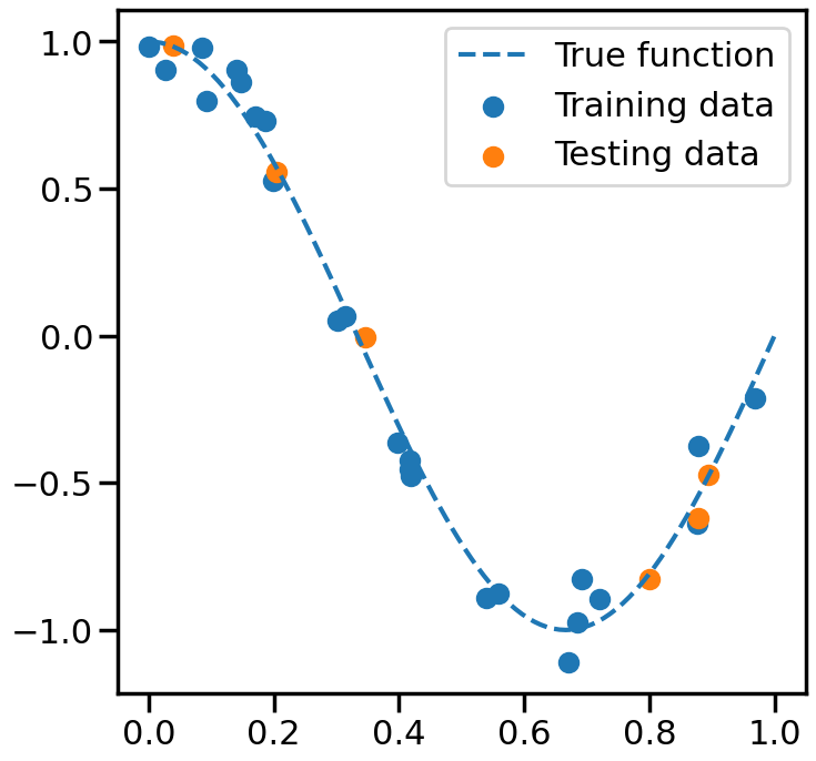 print('X_train\n',X_train,'\n')print('X_test\n',X_test,'\n')print('y_train\n',y_train,'\n')print('y_test\n',y_test,'\n')plt.figure(figsize=(8,8))plt.plot(X_plot, true_fun(X_plot), '--',label="True function")# plot the training and testing points in colorsplt.scatter(X_train,y_train, label="Training data")plt.scatter(X_test,y_test, label="Testing data")plt.legend(loc="best")plt.show()