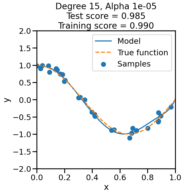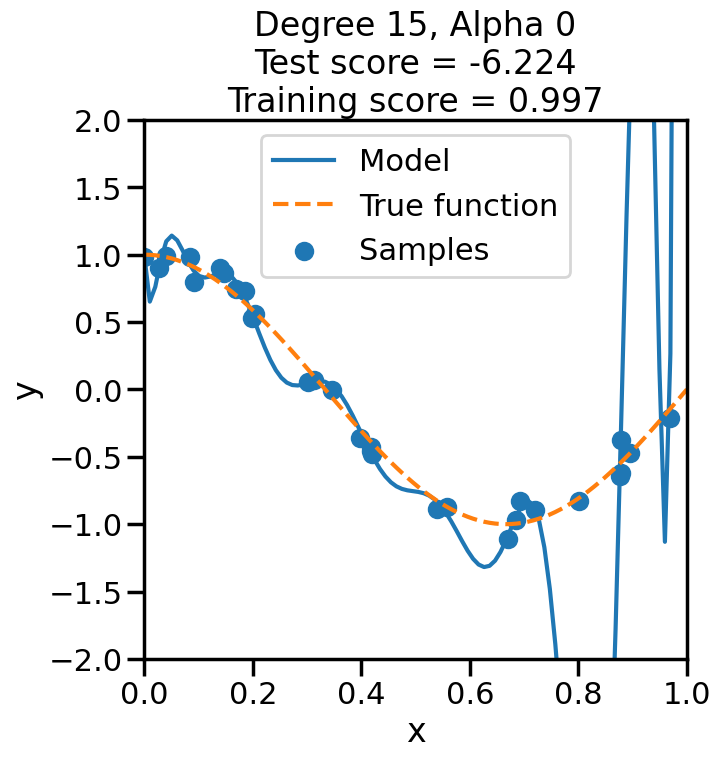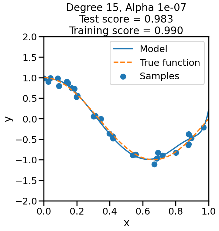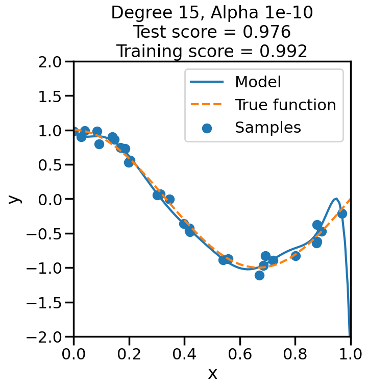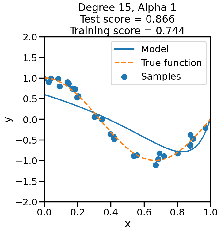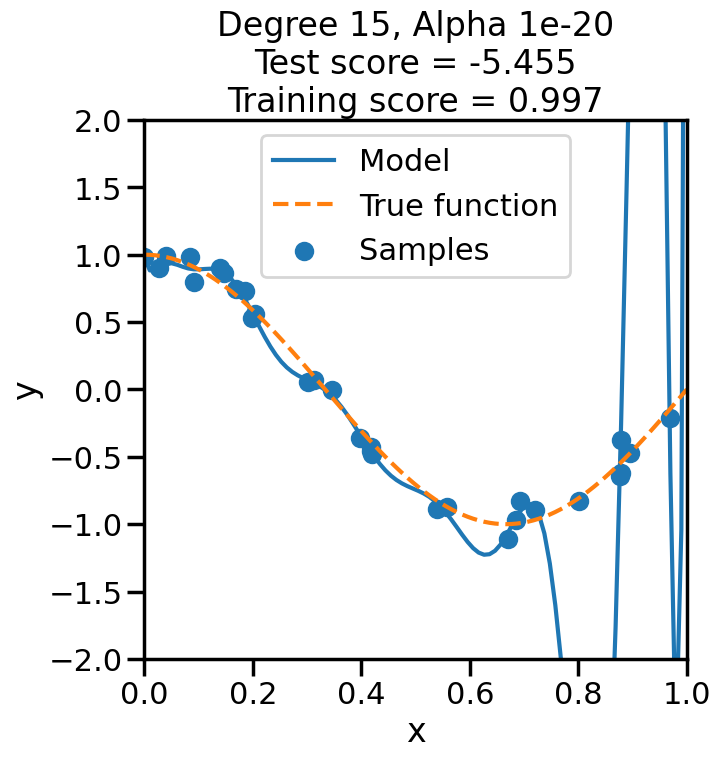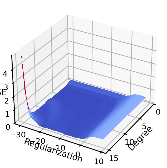 scores = []alphas = np.logspace(start=-13, # Start at 1e-13 stop=4, # Stop at 1e4 num=40) # Split that into 40 piecesdegrees =range(1,16) # This will only go to 15, due to how range worksscores = np.zeros(shape=(len(degrees), # i.e., 15len(alphas))) # i.e., 20for i, degree inenumerate(degrees): # For each degree polynomial_features = PolynomialFeatures(degree=degree, include_bias=False)for j,a inenumerate(alphas): # For each alpha linear_regression = Ridge(alpha=a) pipeline = Pipeline([("polynomial_features", polynomial_features), ("linear_regression", linear_regression)]) cv_scores = model_selection.cross_val_score(pipeline, X[:,np.newaxis], y, scoring="neg_mean_squared_error", cv=20) scores[i][j] =-np.mean(cv_scores)