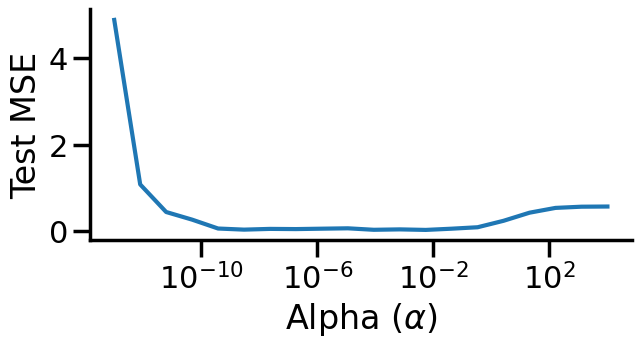 from sklearn import model_selection# Let's plot the behavior of a fixed degree polynomialdegree =15# (i.e., f(x) = w_1*x + w_2*x^2 + ... + w_15*x^15)# but where we change alpha.alphas = np.logspace(start=-13,stop=4,num=20)polynomial_features = PolynomialFeatures(degree=degree, include_bias=False)scores = []for a in alphas: linear_regression = Ridge(alpha=a) pipeline = Pipeline([("polynomial_features", polynomial_features), ("linear_regression", linear_regression)]) cv_scores = model_selection.cross_val_score(pipeline, X[:,np.newaxis], y, scoring="neg_mean_squared_error", cv=20) scores.append(cv_scores)scores = np.array(scores)plt.figure(figsize=(7,3))plt.semilogx(alphas,-np.mean(scores,axis=1),'-')plt.ylabel('Test MSE')plt.xlabel('Alpha ($\\alpha$)')sns.despine()plt.show()