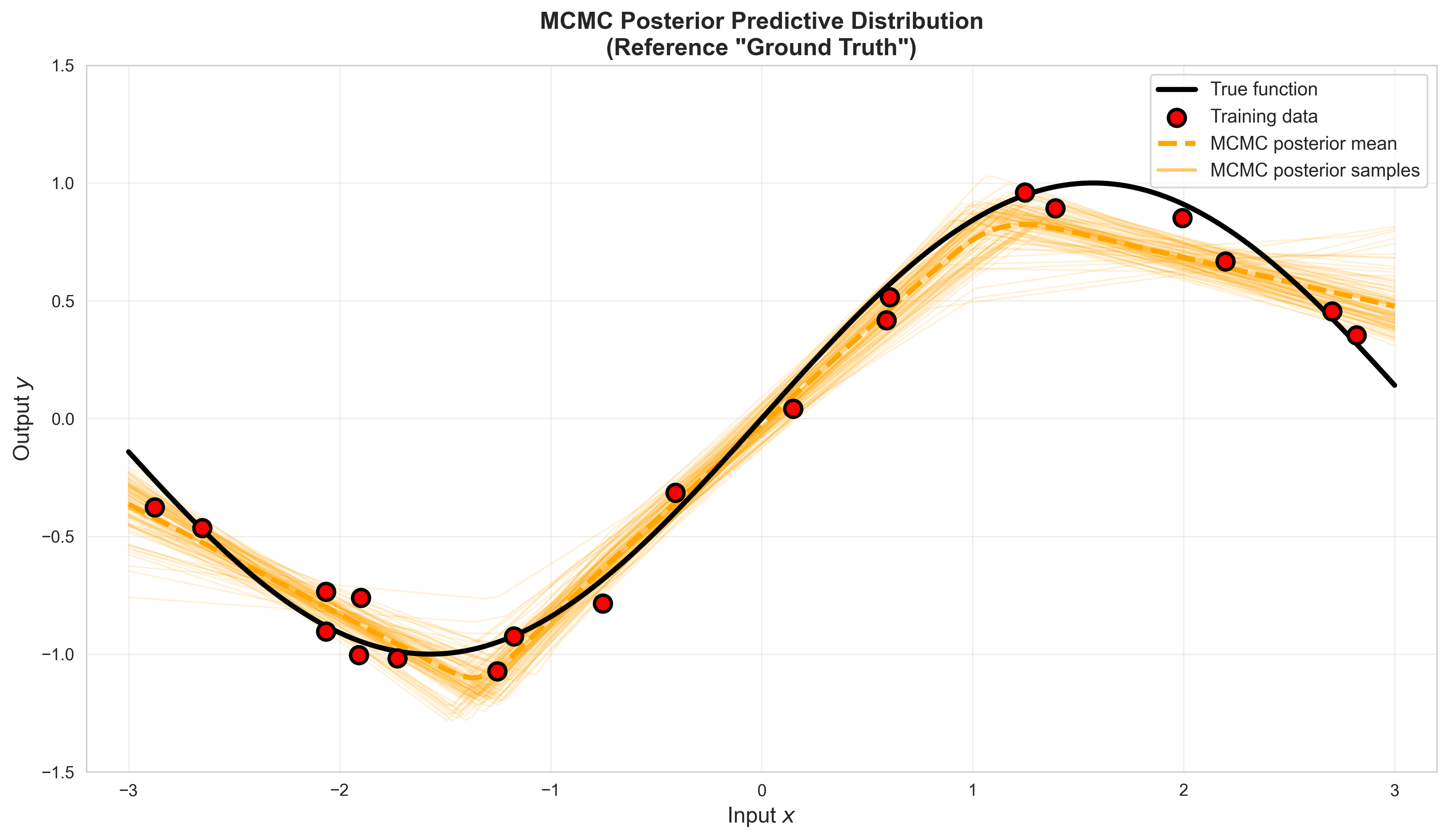 ax.plot(x_test, mcmc_mean, 'orange', linewidth=3, label='MCMC mean', linestyle='--')