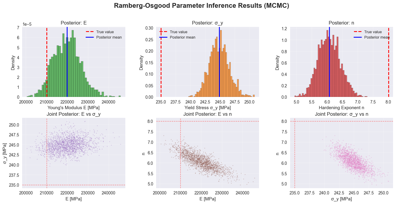 print(f"σ_y (MPa) | {true_sigma_y:10.1f} | {sigma_y_samples.mean():14.1f} | [{np.percentile(sigma_y_samples, 2.5):.1f}, {np.percentile(sigma_y_samples, 97.5):.1f}]")