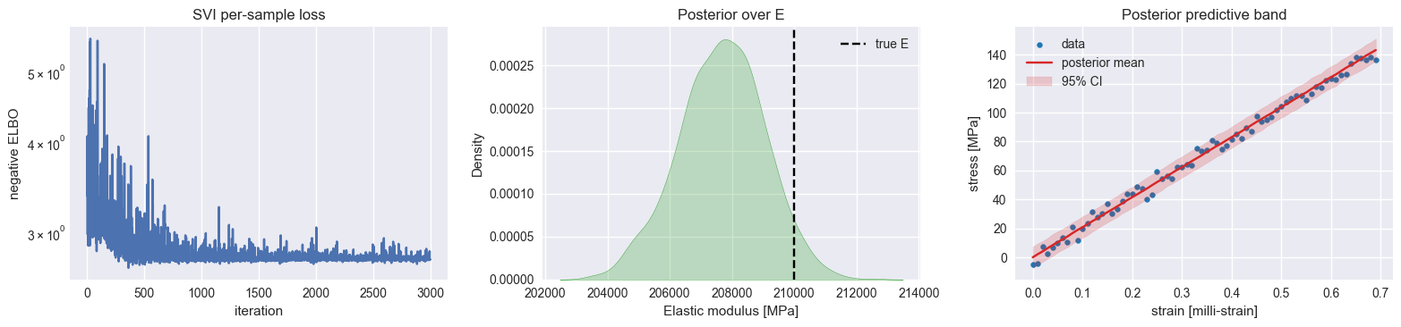 print(f"E (MPa) | {true_E:10.1f} | {E_samples.mean():14.1f} | [{np.percentile(E_samples, 2.5):.1f}, {np.percentile(E_samples, 97.5):.1f}]")