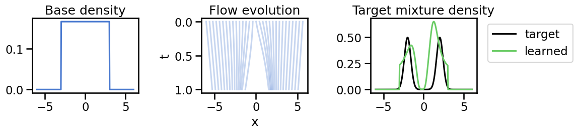 with torch.no_grad(): xs = torch.linspace(-6, 6, 300).unsqueeze(1) t = torch.linspace(0, 1, 20) xt = odeint(lambda t, x: fnet(t, x), xs, t)# Prepare a tensor that requires grad to compute ∂f/∂xxs_grad = xs.clone().detach().requires_grad_(True)f_vals = fnet(0.5, xs_grad)# Plot flow evolutionfig, axes = plt.subplots(1, 3, figsize=(12, 3))axes[0].set_title("Base density")axes[1].set_title("Flow evolution")axes[2].set_title("Target mixture density")# Plot the Base distributionxplot = xs.squeeze().cpu().numpy()p_base = torch.exp(log_prob_base(xs_grad)).squeeze().detach().cpu().numpy()p_target = torch.exp(log_prob_target(xs_grad)).squeeze().detach().cpu().numpy()axes[0].plot(xplot, p_base)# Evolution (trajectories)xt_np = xt.detach().cpu().numpy()for i inrange(0, len(xs), 10): axes[1].plot(xt_np[:, i, 0], t.cpu().numpy(), color="C0", alpha=0.3)axes[1].invert_yaxis()axes[1].set_xlabel("x")axes[1].set_ylabel("t")# Target vs learned# compute df/dx using autograddf_dx = torch.autograd.grad(f_vals, xs_grad, torch.ones_like(f_vals), create_graph=False)[0]p_learned = torch.exp(log_prob_base(xs_grad) - df_dx).squeeze().detach().cpu().numpy()axes[2].plot(xplot, p_target, label="target", color="black")axes[2].plot(xplot, p_learned, label="learned", color="C1")axes[2].legend(loc='upper left', bbox_to_anchor=(1.05, 1))plt.tight_layout()plt.show()