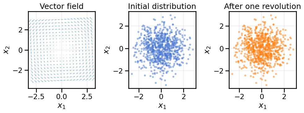 fig, axes = plt.subplots(1, 3, figsize=(10, 4))# Plot the vector field corresponding to the rotationx1 = np.linspace(-3, 3, 20)x2 = np.linspace(-3, 3, 20)X1, X2 = np.meshgrid(x1, x2)U =-X2V = X1axes[0].quiver(X1, X2, U, V, color='tab:blue')axes[0].set_title('Vector field')axes[0].set_xlabel('$x_1$')axes[0].set_ylabel('$x_2$')axes[0].axis('equal')axes[0].grid(True, alpha=0.2)axes[1].scatter(cloud0[:, 0].cpu(), cloud0[:, 1].cpu(), s=10, alpha=0.4)axes[1].set_title('Initial distribution')axes[1].set_xlabel('$x_1$')axes[1].set_ylabel('$x_2$')axes[1].axis('equal')axes[1].grid(True, alpha=0.2)axes[2].scatter(cloudT[:, 0].cpu(), cloudT[:, 1].cpu(), s=10, alpha=0.4, color='tab:orange')axes[2].set_title('After one revolution')axes[2].set_xlabel('$x_1$')axes[2].set_ylabel('$x_2$')axes[2].axis('equal')axes[2].grid(True, alpha=0.2)plt.tight_layout()plt.show()