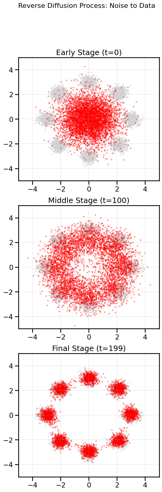 # Pick a random subset of the original data for background visualizationdata_indices = np.random.choice(data.shape[0], size=num_generated_samples, replace=False)data_subset = data[data_indices]# Show samples at three different stages of diffusion: early, middle, and at the end:fig, axes = plt.subplots(3, 1, figsize=(6,18))stages = [0, T//2, T-1]stage_titles = ['Early Stage (t=0)', 'Middle Stage (t=100)', 'Final Stage (t=199)']for ax, stage, title inzip(axes, stages, stage_titles): ax.scatter(data_subset[:, 0], data_subset[:, 1], s=5, color='lightgrey', alpha=0.5) ax.scatter(trajectory[stage][:, 0], trajectory[stage][:, 1], s=5, color="red", alpha=0.3) ax.set_title(title)#ax.axis('equal') ax.set_xlim(-5, 5) ax.set_ylim(-5, 5) ax.grid(True, alpha=0.2)fig.suptitle("Reverse Diffusion Process: Noise to Data", fontsize=16)plt.show()