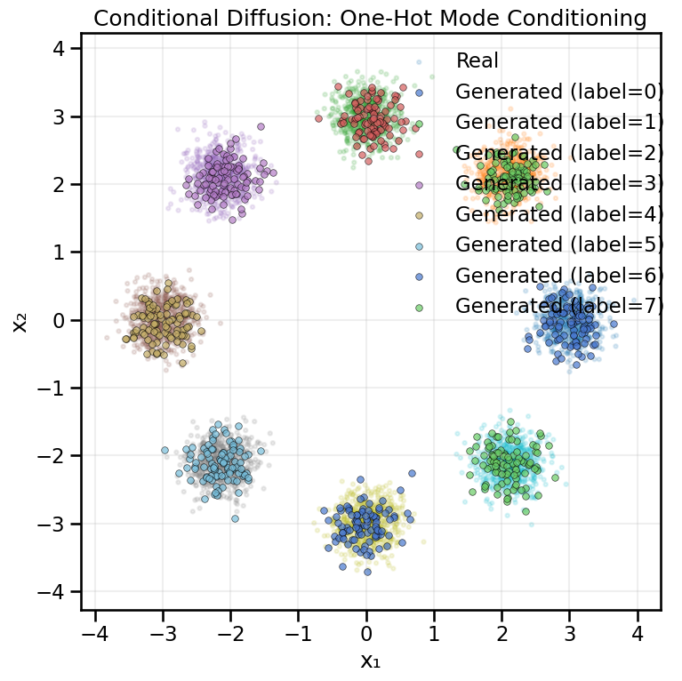 # Generate conditional samples for each modesamples_by_label = {}n_samples_per_mode =100for label inrange(8): y = torch.nn.functional.one_hot( torch.full((n_samples_per_mode,), label, device=device), num_classes=8 ).to(torch.float32) samples = sample_conditional_diffusion(cdiff_onehot, y, alphas_oh, alphas_cumprod_oh, n_samples=n_samples_per_mode, T=200) samples_by_label[label] = samplesplot_conditional_samples_discrete( samples_by_label, data, y_ring, title="Conditional Diffusion: One-Hot Mode Conditioning")