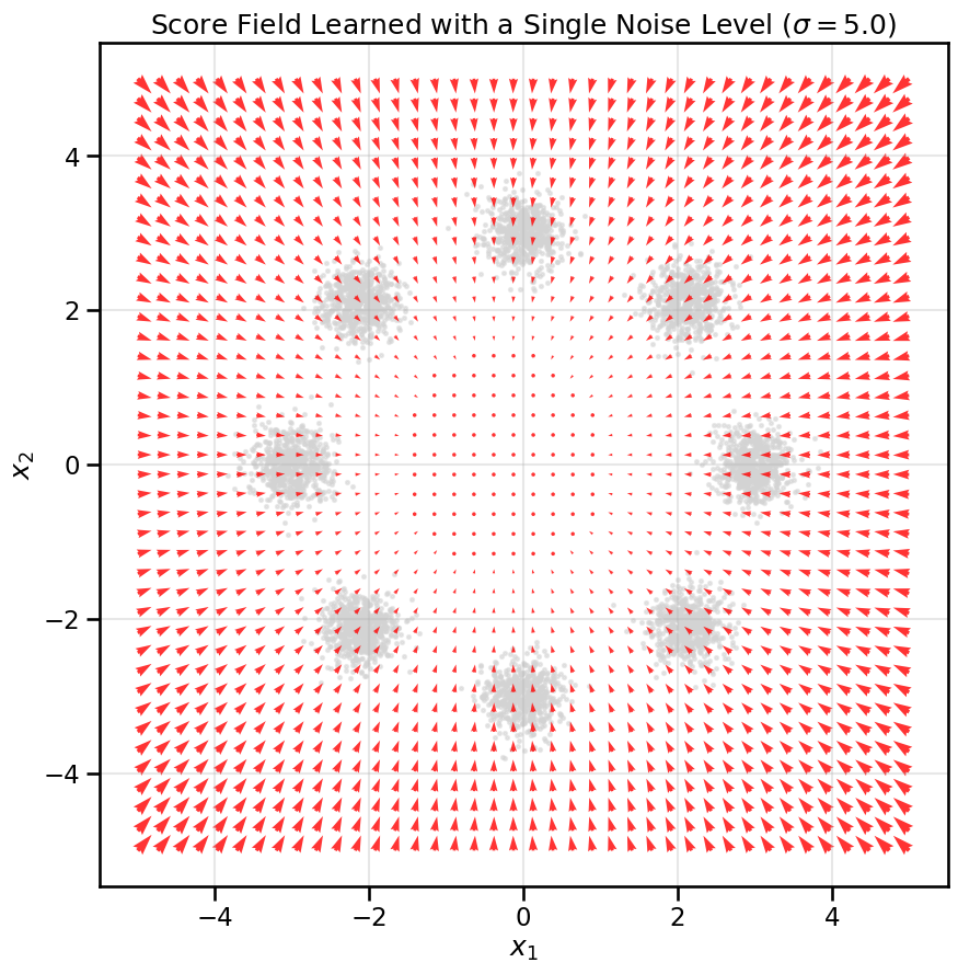 # Create a grid to visualize the score fieldxx, yy = np.meshgrid(np.linspace(-5, 5, 40), np.linspace(-5, 5, 40))grid_points = torch.tensor(np.stack([xx.ravel(), yy.ravel()], axis=1), dtype=torch.float32, device=device)# Get the score at each grid pointscore_net_simple.eval()with torch.no_grad(): scores = score_net_simple(grid_points).cpu().numpy()# Plot the resultsplt.figure(figsize=(10, 10))#sns.kdeplot(x=data[:, 0], y=data[:, 1], cmap="viridis", fill=True, alpha=0.5, levels=20)plt.scatter(data[:, 0], data[:, 1], s=5, color='lightgrey', alpha=0.5)plt.quiver(grid_points[:, 0].cpu(), grid_points[:, 1].cpu(), scores[:, 0], scores[:, 1], color='red', width=0.005, alpha=0.8)plt.title(f"Score Field Learned with a Single Noise Level ($\sigma={noise_level}$)")plt.xlabel('$x_1$')plt.ylabel('$x_2$')plt.axis('equal')plt.grid(True, alpha=0.3)plt.show()