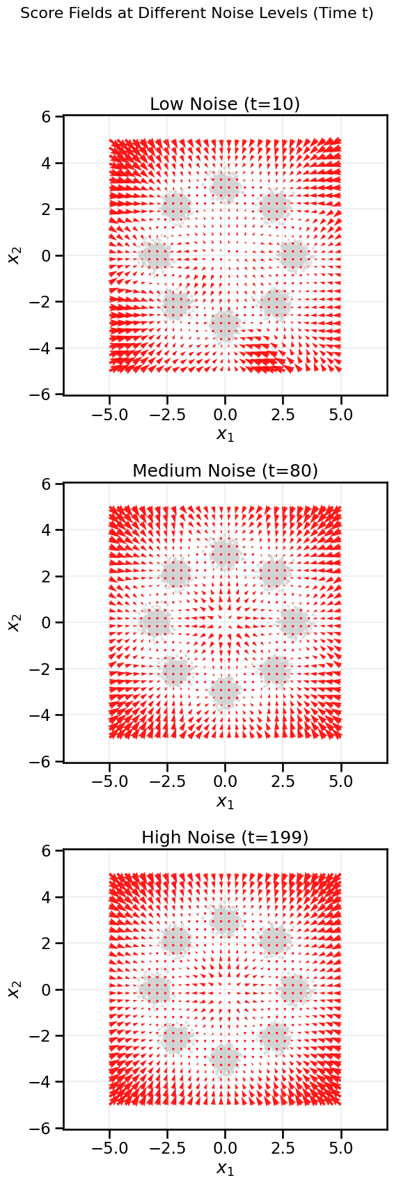 High Noise (t is large): The data is almost pure noise, so the score field will be largely diffuse, with weak gradients pointing towards the center of the distribution.