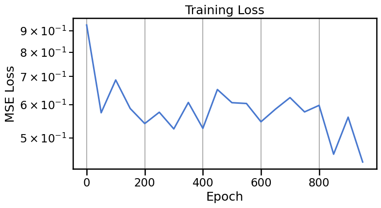 class DiffusionModel(nn.Module):def__init__(self, n_steps=200, time_emb_dim=16, hidden_dim=128):super().__init__()self.time_embed = nn.Embedding(n_steps, time_emb_dim)self.net = nn.Sequential( nn.Linear(2+ time_emb_dim, hidden_dim), nn.ReLU(), nn.Linear(hidden_dim, hidden_dim), nn.ReLU(), nn.Linear(hidden_dim, 2) # Predicts the noise )def forward(self, x, t): t_emb =self.time_embed(t) x_in = torch.cat([x, t_emb], dim=-1)returnself.net(x_in)# Training parametersT =200# Number of diffusion stepslr =1e-3n_epochs =1000batch_size =256# Data#data, _ = create_ring_gaussians(n_samples=10000)loader = make_loader(data, batch_size=batch_size)# Model and optimizermodel = DiffusionModel(n_steps=T).to(device)optimizer = optim.Adam(model.parameters(), lr=lr)alphas, alphas_cumprod = get_alphas(timesteps=T)# Training looplosses = []for epoch inrange(n_epochs):for (x_0,) in loader: x_0 = x_0.to(device)# 1. Sample a random time t t = torch.randint(0, T, (x_0.shape[0],), device=device).long()# 2. Create noisy sample x_t and get the true noise x_t, noise = forward_diffusion_sample(x_0, t, alphas_cumprod, device)# 3. Predict the noise predicted_noise = model(x_t, t)# 4. Calculate the loss loss = nn.functional.mse_loss(predicted_noise, noise) optimizer.zero_grad() loss.backward() optimizer.step()if epoch %50==0: losses.append(loss.item())print(f"Epoch {epoch}, Loss: {loss.item():.4f}")print("Training complete.")# Plot the loss curveplt.figure(figsize=(8, 4))plt.plot(range(0, n_epochs, 50), losses)plt.title("Training Loss")plt.xlabel("Epoch")plt.ylabel("MSE Loss")plt.yscale('log')plt.grid(True)plt.show()