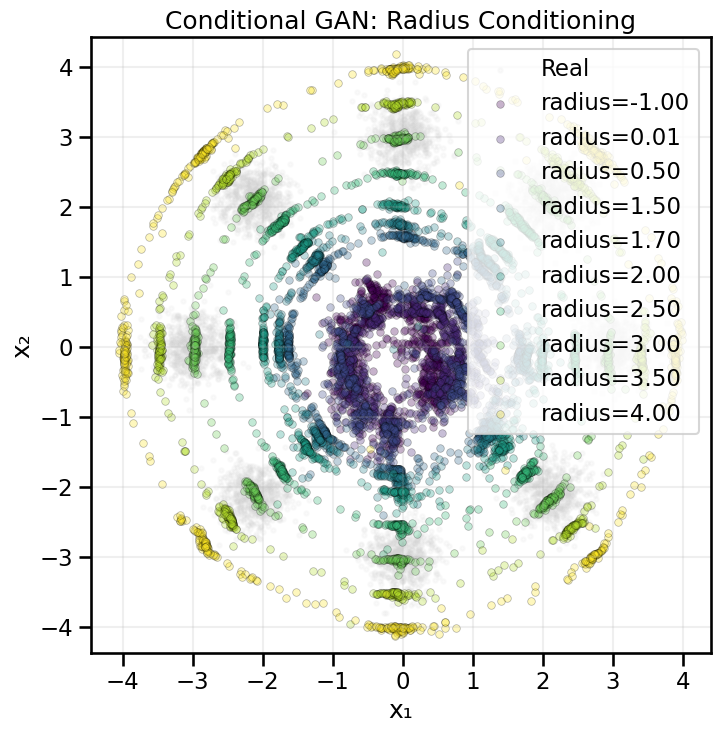Instead of conditioning on discrete labels, we can also condition on continuous scalar values. In this example, we’ll condition the GAN on the radius (distance from the origin) of the generated samples. This allows us to control where on the ring samples are generated.