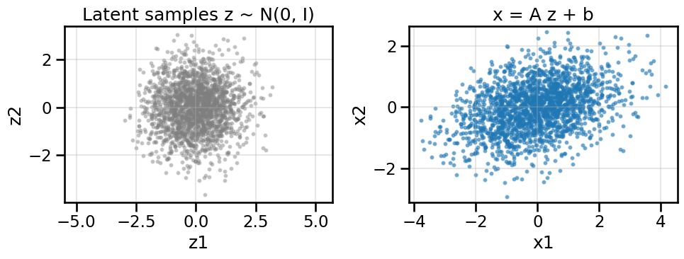 We’ll start with a 2D latent \(z \sim N(0, I)\) (i.e., a standard Gaussian) and inspect how different choices of \(f\) reshape the distribution in data space. In this case, the latent space is 2D and the data space is also 2D, so we can visualize both spaces directly, however, in general, the latent space is often lower-dimensional than the data space.