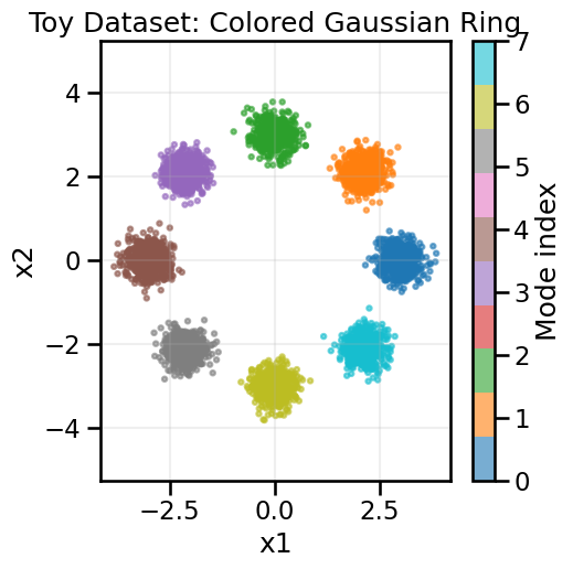 Discrete Conditioning (One-Hot Mode Index): Condition the GAN on which Gaussian mode in our ring dataset the sample should come from.
