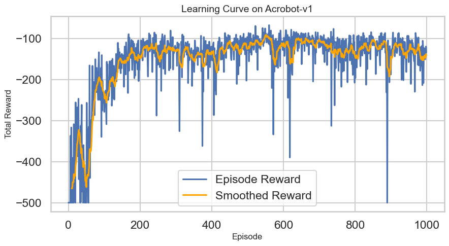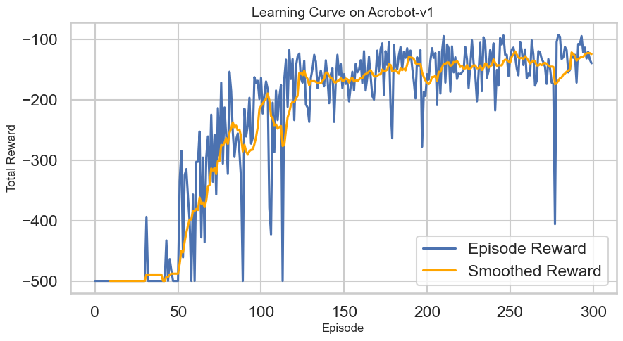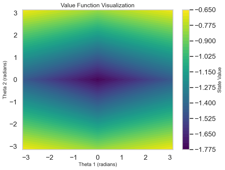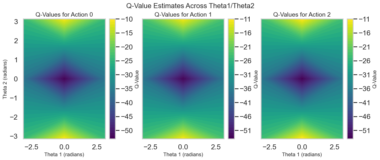 # Plotting the Learning Curvedef plot_learning_curve(rewards: List[float], window: int=10): plt.figure(figsize=(10, 5)) plt.plot(rewards, label='Episode Reward')iflen(rewards) >= window: smoothed_rewards = pd.Series(rewards).rolling(window).mean() plt.plot(smoothed_rewards, label='Smoothed Reward', color='orange') plt.xlabel('Episode') plt.ylabel('Total Reward') plt.title('Learning Curve on Acrobot-v1') plt.legend() plt.show()# Map theta1 and theta2 to the Observation Space of Acrobot-v1 to visualize Q-values and policy# This ignores the angular velocities for simplicity, although those obviously matter in practice.def map_angles_to_state(theta1: float, theta2: float, v1=0.0, v2=0.0) -> np.ndarray:return np.array([math.cos(theta1), math.sin(theta1), math.cos(theta2), math.sin(theta2), v1, v2])# Plot the Q-Value Estimates as a function of the two main angles theta1 and theta2def plot_q_values(agent: DQNAgent, state_dim: int, num_points: int=50, v1: float=0.0, v2: float=0.0):""" Plot Q-value surfaces for each discrete action as a row of subplots. theta1 and theta2 are varied over [-pi, pi]; angular velocities v1, v2 are held fixed. """ theta1_space = np.linspace(-math.pi, math.pi, num_points) theta2_space = np.linspace(-math.pi, math.pi, num_points) n_actions = agent.q_network[-1].out_features# Precompute Q-values for the grid of angles q_values = np.zeros((num_points, num_points, n_actions), dtype=float)for i, theta1 inenumerate(theta1_space):for j, theta2 inenumerate(theta2_space): state = map_angles_to_state(theta1, theta2, v1, v2) state_tensor = torch.FloatTensor(state).unsqueeze(0).to(DEVICE)with torch.no_grad(): q_vals = agent.q_network(state_tensor).cpu().numpy().squeeze() q_values[i, j, :] = q_vals# Create a single-row of subplots, one per action fig, axes = plt.subplots(1, n_actions, figsize=(4* n_actions, 5), sharex=True, sharey=True, constrained_layout=True) axes = np.atleast_1d(axes)for action inrange(n_actions): ax = axes[action]# contourf expects X and Y as 1D arrays for axis ticks when passing Z as (M, N) im = ax.contourf(theta1_space, theta2_space, q_values[:, :, action], levels=50, cmap='viridis') fig.colorbar(im, ax=ax, label='Q-Value') ax.set_xlabel('Theta 1 (radians)') ax.set_ylabel('Theta 2 (radians)') if action ==0elseNone ax.set_title(f'Q-Values for Action {action}') ax.set_aspect('auto') fig.suptitle('Q-Value Estimates Across Theta1/Theta2', fontsize=16) plt.show()# Plot the policy as a function of the two main angles theta1 and theta2def plot_dqn_policy(agent: DQNAgent, state_dim: int, num_points: int=50, v1=0.0, v2=0.0): theta1_space = np.linspace(-math.pi, math.pi, num_points) theta2_space = np.linspace(-math.pi, math.pi, num_points) policy = np.zeros((num_points, num_points))for i, theta1 inenumerate(theta1_space):for j, theta2 inenumerate(theta2_space): state = map_angles_to_state(theta1, theta2, v1, v2) state_tensor = torch.FloatTensor(state).unsqueeze(0).to(DEVICE)with torch.no_grad(): q_vals = agent.q_network(state_tensor) best_action = q_vals.argmax().item() policy[i, j] = best_action plt.figure(figsize=(8, 6)) plt.contourf(theta1_space, theta2_space, policy, levels=agent.q_network[-1].out_features -1, cmap='viridis') plt.colorbar(label='Best Action') plt.xlabel('Theta 1 (radians)') plt.ylabel('Theta 2 (radians)') plt.title('Policy Visualization') plt.show()# Plot the states visted during training as a pairplot of both angles and velocitiesdef plot_visited_states(visited_states: set): df = pd.DataFrame(list(visited_states), columns=['cos_theta1', 'sin_theta1', 'cos_theta2', 'sin_theta2', 'theta1_dot', 'theta2_dot'])# Compute angles from cos and sin df['theta1'] = np.arctan2(df['sin_theta1'], df['cos_theta1']) df['theta2'] = np.arctan2(df['sin_theta2'], df['cos_theta2']) sns.pairplot(df[['theta1', 'theta2', 'theta1_dot', 'theta2_dot']], diag_kind='kde', plot_kws={'alpha': 0.2, 's': 10}) plt.suptitle('Visited States During Training', y=1.02) plt.show()# Interactive plots of the Q-values and policy with sliders for angular velocities:def interactive_q_policy_plots(agent: DQNAgent, state_dim: int):@interact(v1=FloatSlider(min=-10.0, max=10.0, step=0.1, value=0.0), v2=FloatSlider(min=-10.0, max=10.0, step=0.1, value=0.0))def update(v1: float, v2: float): plot_q_values(agent, state_dim, v1=v1, v2=v2) plot_dqn_policy(agent, state_dim, v1=v1, v2=v2)