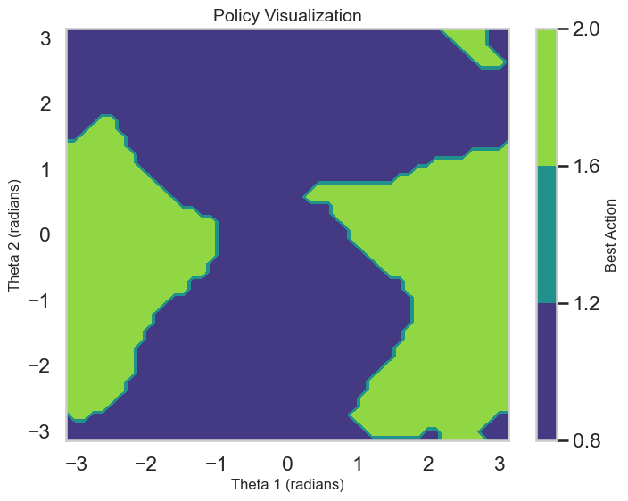 # Plot the policy as a function of the two main angles theta1 and theta2def plot_pg_policy(agent: PolicyGradientAgent, state_dim: int, num_points: int=50, v1=0.0, v2=0.0): theta1_space = np.linspace(-math.pi, math.pi, num_points) theta2_space = np.linspace(-math.pi, math.pi, num_points) policy = np.zeros((num_points, num_points))for i, theta1 inenumerate(theta1_space):for j, theta2 inenumerate(theta2_space): state = map_angles_to_state(theta1, theta2, v1, v2) state_tensor = torch.FloatTensor(state).unsqueeze(0).to(DEVICE)with torch.no_grad(): action_probs = agent.policy_network(state_tensor) best_action = action_probs.argmax().item() policy[i, j] = best_action plt.figure(figsize=(8, 6)) plt.contourf(theta1_space, theta2_space, policy, levels=agent.policy_network[-2].out_features -1, cmap='viridis') plt.colorbar(label='Best Action') plt.xlabel('Theta 1 (radians)') plt.ylabel('Theta 2 (radians)') plt.title('Policy Visualization') plt.show()# Interactive plots of the PG policy with sliders for angular velocities:def interactive_pg_policy_plots(agent: PolicyGradientAgent, state_dim: int):@interact(v1=FloatSlider(min=-5.0, max=5.0, step=0.1, value=0.0), v2=FloatSlider(min=-5.0, max=5.0, step=0.1, value=0.0))def update(v1: float, v2: float): plot_pg_policy(agent, state_dim, v1=v1, v2=v2)
