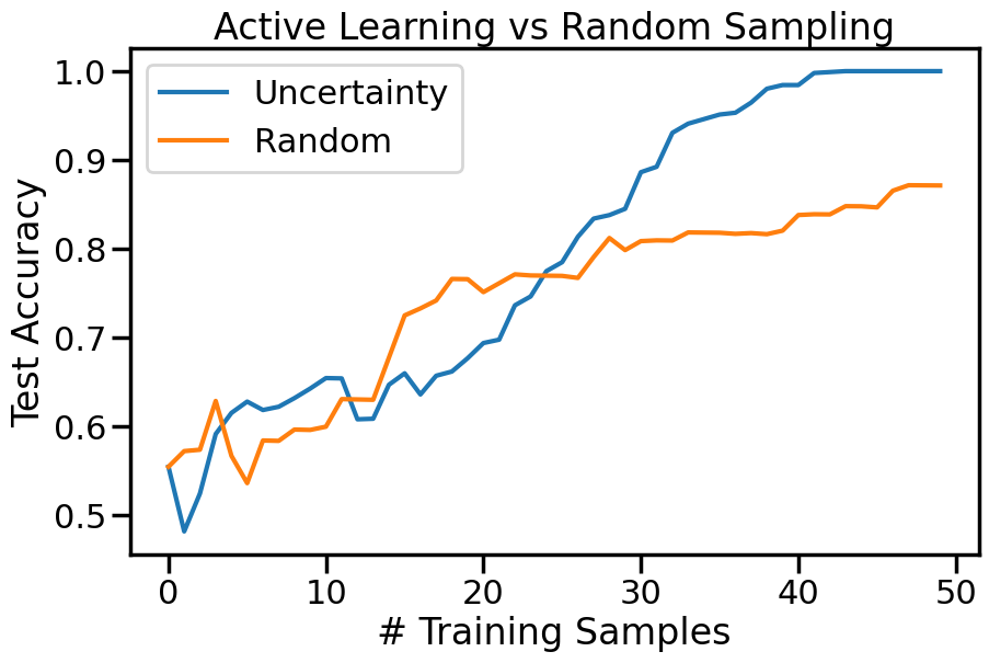 plt.figure(figsize=(10,6))for o in options: # For each sampling option plt.plot(errors[o],label=o)plt.legend()plt.xlabel("# Training Samples")plt.ylabel("Test Accuracy")plt.title("Active Learning vs Random Sampling")plt.show()