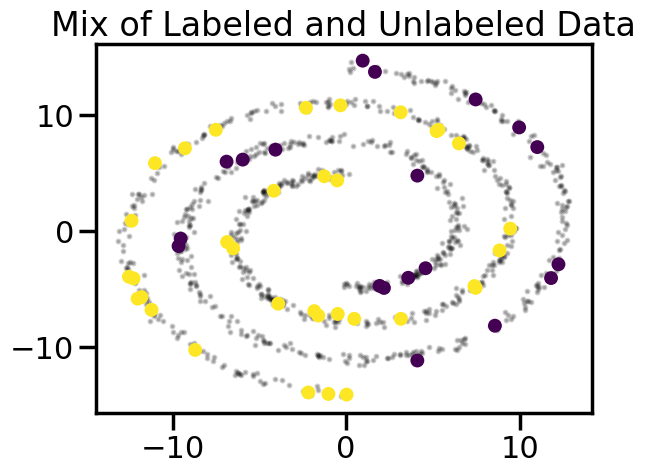 In the below example, we will use Label Spreading to demonstrate semi-supervised learning on the same classification problem we saw above. However, despite whatever specific algorithm we might use, the key idea remains the same: we will use the unlabeled data to act as a kind of similiarity measure between points, and then use that similarity measure to decide to what extent certain labeled points should influence the labels of nearby unlabeled points.