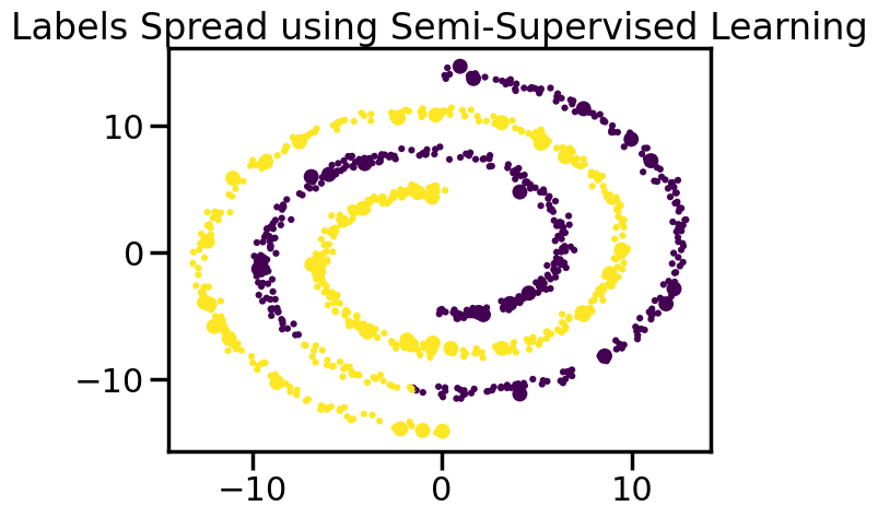 label_prop_model = LabelSpreading(kernel='rbf', gamma=5.0, max_iter=400)labels =-np.ones_like(y)labels[train] = y[train]label_prop_model.fit(X, labels)ll = label_prop_model.transduction_# Plot the resultsplt.figure()plt.scatter(X[:,0],X[:,1],c=ll,lw=0, s=20)plt.scatter(X[train,0],X[train,1],c=y[train],s=100,lw=0)plt.title("Labels Spread using Semi-Supervised Learning")plt.show()