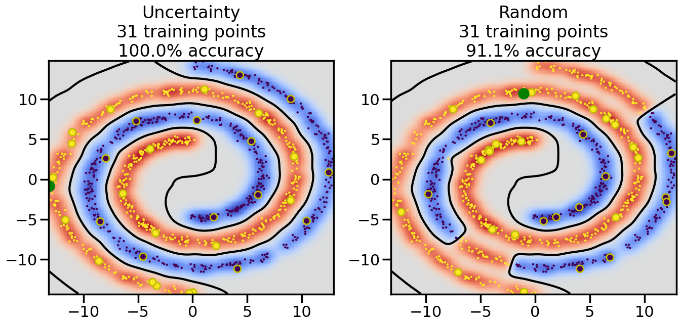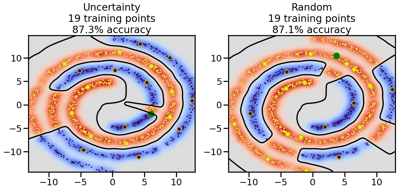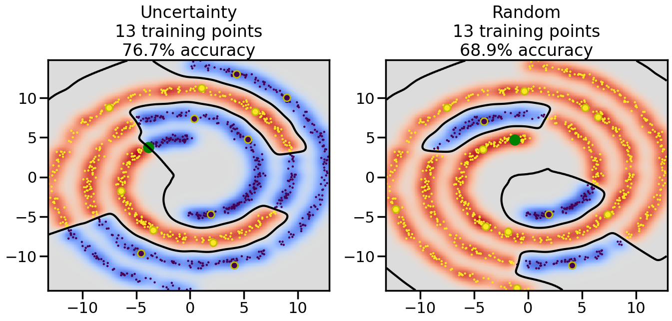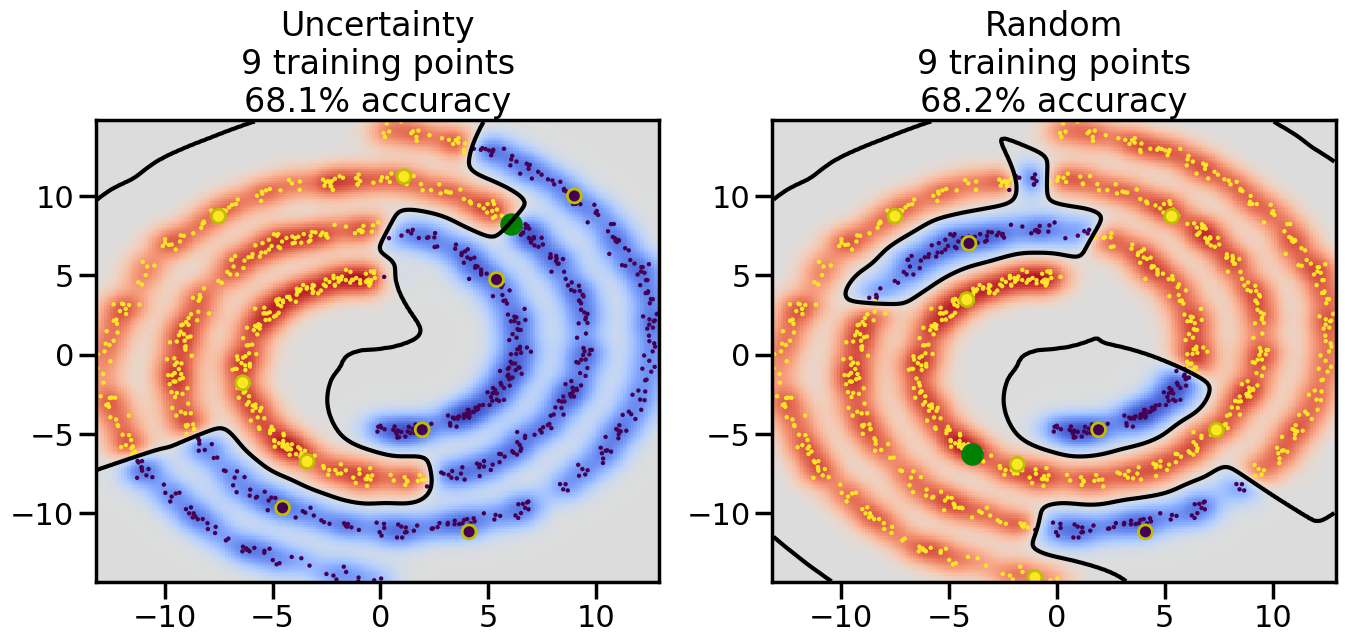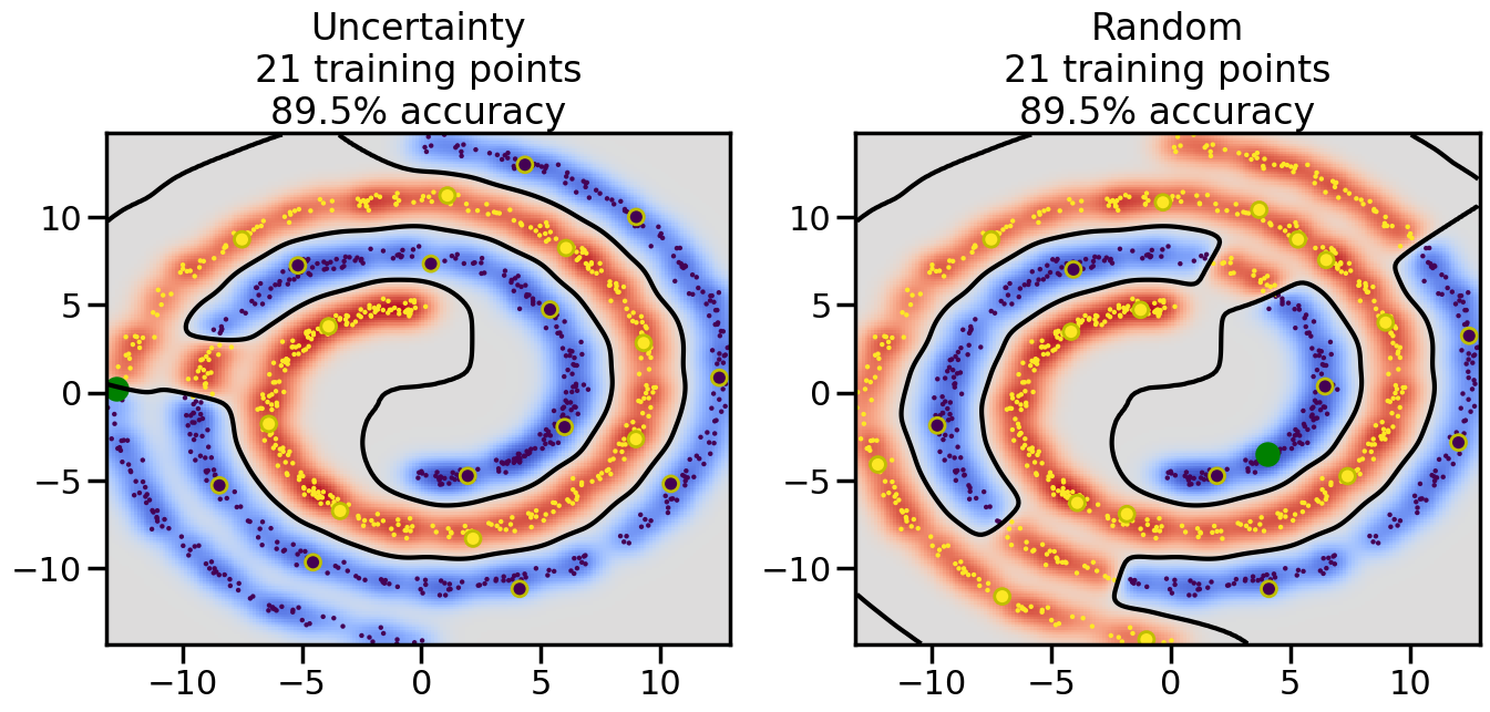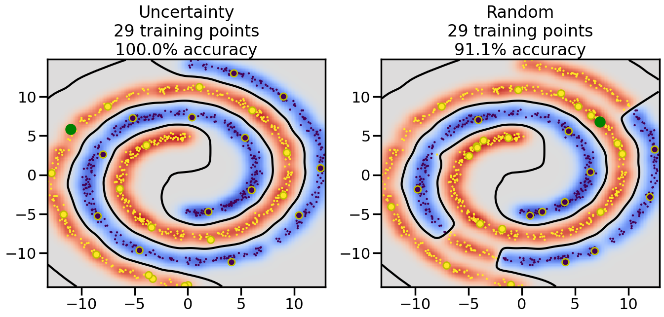 # ------- Try changing the below to modify the classification smoothness -------gamma =0.7# e.g. between 0.1 and 5# --------------------------------------# Reset the random seednp.random.seed(3) # So we all see the same thing# Now, ready to begin learning:train_ind ={'Uncertainty': np.zeros(len(X),dtype=bool),'Random': np.zeros(len(X),dtype=bool)}options = train_ind.keys()possible_points = np.array(list(range(len(X))))# Initializationfor i inrange(3): ind = np.random.choice(possible_points[y==i%2])for o in options: train_ind[o][ind] =True# Classifiersclf = GaussianProcessClassifier(1.0* RBF(length_scale=gamma),optimizer=None)label_prop_model = LabelSpreading(kernel='rbf', gamma=5.0, max_iter=400)# How much data should we collect?num_total_samples =30# Let's store the errors for the models:semi_errors = {'Uncertainty':np.zeros(num_total_samples),'Random':np.zeros(num_total_samples) }for i inrange(num_total_samples):# As i increases, we increase the number of points plt.figure(figsize=(16,6))for j,o inenumerate(options): plt.subplot(1,2,j+1) # Plot intermediate results n_train = np.count_nonzero(train_ind[o])# Do Label Spreading: labels =-np.ones_like(y) labels[train_ind[o]] = y[train_ind[o]] label_prop_model.fit(X, labels) l = label_prop_model.transduction_ clf.fit(X,l) accuracy = clf.score(X[~train_ind[o],:],y[~train_ind[o]])# Plot the decision function x_min = X[:, 0].min() x_max = X[:, 0].max() y_min = X[:, 1].min() y_max = X[:, 1].max() XX, YY = np.mgrid[x_min:x_max:200j, y_min:y_max:200j]#Z = clf.decision_function(np.c_[XX.ravel(), YY.ravel()]) Z = clf.predict_proba(np.c_[XX.ravel(), YY.ravel()])[:,1] -0.5# Put the result into a contour plot Z = Z.reshape(XX.shape) plt.pcolormesh(XX, YY, Z , cmap=plt.get_cmap('coolwarm'),shading='auto') plt.contour(XX, YY, Z, colors=['k', 'k', 'k'], linestyles=['--', '-', '--'], levels=[-.5, 0, .5])# Plot the training points plt.scatter(X[:,0],X[:,1],c=l,lw =0,s=10,alpha=1) plt.scatter(X[train_ind[o],0],X[train_ind[o],1],c=y[train_ind[o]],s=100,lw=2,edgecolor='y')#dists = clf.decision_function(X[~train_ind[o],:]) dists = clf.predict_proba(X[~train_ind[o],:])[:,1] -0.5 dists = np.abs(dists)if o =='Uncertainty': closest_points = np.argwhere(dists == np.amin(dists)).ravel()# Basic Uncertainty sampling---just choose randomly ind = np.random.choice(closest_points) next_point = X[~train_ind[o],:][ind,:].flatten() next_ind = np.argwhere(X == next_point.flatten())[0,0]elif o =='Random': next_ind = np.random.choice(possible_points[~train_ind[o]],1)else:raiseValueError("Invalid option key: {}".format(o)) train_ind[o][next_ind] =True plt.scatter(X[next_ind,0],X[next_ind,1],c='g',s=200) semi_errors[o][i]=accuracy plt.title("%s\n%d training points\n%.1f%% accuracy"%(o,n_train,accuracy*100)) plt.show()