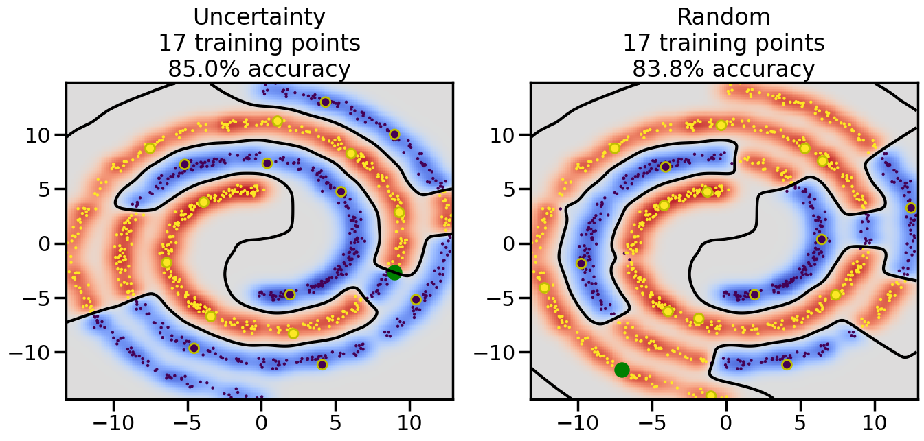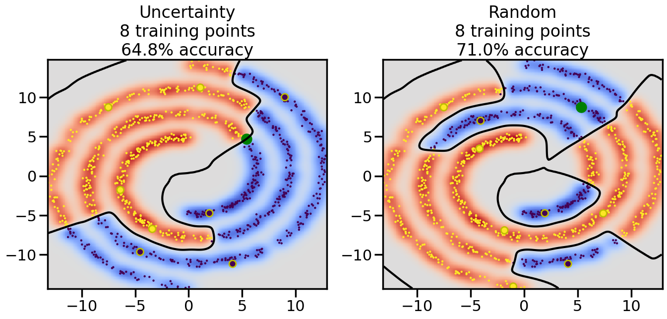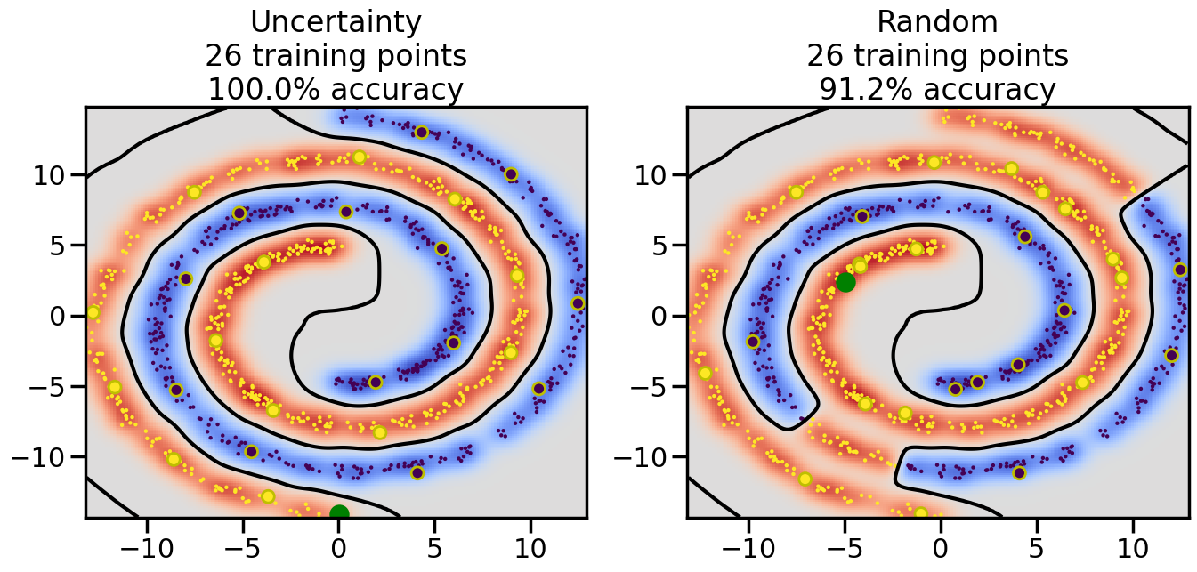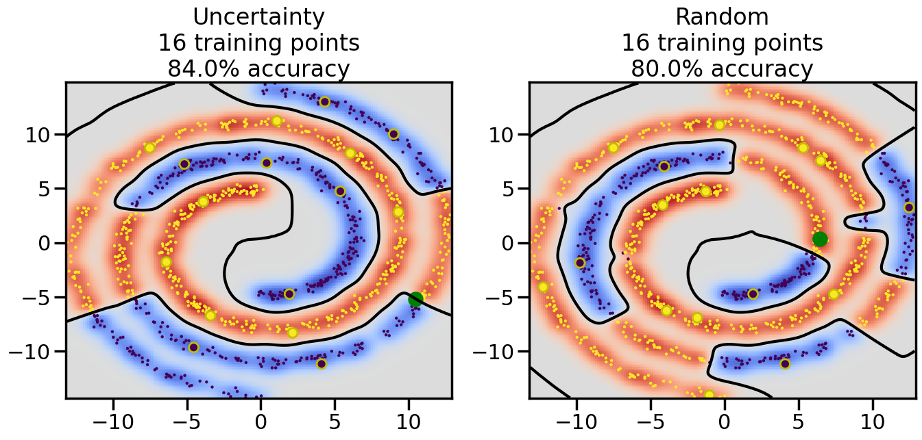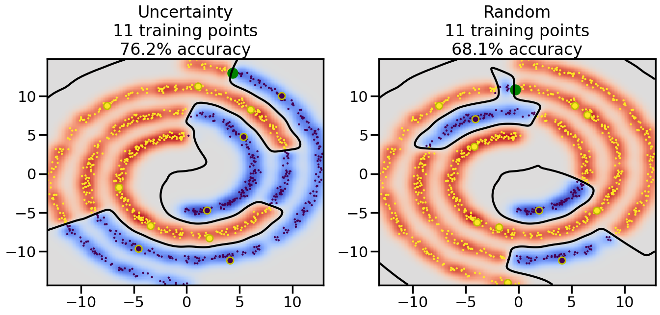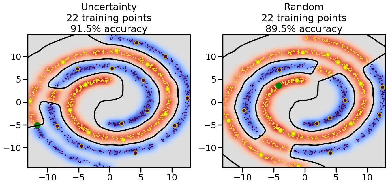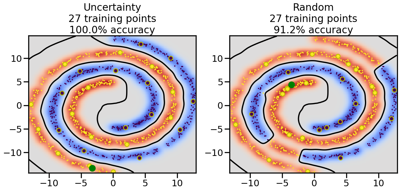 # ------- Try changing the below to modify the classification smoothness -------gamma =0.7# e.g. between 0.1 and 5# --------------------------------------# Reset the random seednp.random.seed(3) # So we all see the same thing# Now, ready to begin learning:train_ind ={'Uncertainty': np.zeros(len(X),dtype=bool),'Random': np.zeros(len(X),dtype=bool)}options = train_ind.keys()possible_points = np.array(list(range(len(X))))# Initializationfor i inrange(3): ind = np.random.choice(possible_points[y==i%2])for o in options: train_ind[o][ind] =True# Classifiersclf = GaussianProcessClassifier(1.0* RBF(length_scale=gamma),optimizer=None)label_prop_model = LabelSpreading(kernel='rbf', gamma=5.0, max_iter=400)# How much data should we collect?num_total_samples =30# Let's store the errors for the models:semi_errors = {'Uncertainty':np.zeros(num_total_samples),'Random':np.zeros(num_total_samples) }for i inrange(num_total_samples):# As i increases, we increase the number of points plt.figure(figsize=(16,6))for j,o inenumerate(options): plt.subplot(1,2,j+1) # Plot intermediate results n_train = np.count_nonzero(train_ind[o])# Do Label Spreading: labels =-np.ones_like(y) labels[train_ind[o]] = y[train_ind[o]] label_prop_model.fit(X, labels) l = label_prop_model.transduction_ clf.fit(X,l) accuracy = clf.score(X[~train_ind[o],:],y[~train_ind[o]])# Plot the decision function x_min = X[:, 0].min() x_max = X[:, 0].max() y_min = X[:, 1].min() y_max = X[:, 1].max() XX, YY = np.mgrid[x_min:x_max:200j, y_min:y_max:200j]#Z = clf.decision_function(np.c_[XX.ravel(), YY.ravel()]) Z = clf.predict_proba(np.c_[XX.ravel(), YY.ravel()])[:,1] -0.5# Put the result into a contour plot Z = Z.reshape(XX.shape) plt.pcolormesh(XX, YY, Z , cmap=plt.get_cmap('coolwarm'),shading='auto') plt.contour(XX, YY, Z, colors=['k', 'k', 'k'], linestyles=['--', '-', '--'], levels=[-.5, 0, .5])# Plot the training points plt.scatter(X[:,0],X[:,1],c=l,lw =0,s=10,alpha=1) plt.scatter(X[train_ind[o],0],X[train_ind[o],1],c=y[train_ind[o]],s=100,lw=2,edgecolor='y')#dists = clf.decision_function(X[~train_ind[o],:]) dists = clf.predict_proba(X[~train_ind[o],:])[:,1] -0.5 dists = np.abs(dists)if o =='Uncertainty': closest_points = np.argwhere(dists == np.amin(dists)).ravel()# Basic Uncertainty sampling---just choose randomly ind = np.random.choice(closest_points) next_point = X[~train_ind[o],:][ind,:].flatten() next_ind = np.argwhere(X == next_point.flatten())[0,0]elif o =='Random': next_ind = np.random.choice(possible_points[~train_ind[o]],1)else:raiseValueError("Invalid option key: {}".format(o)) train_ind[o][next_ind] =True plt.scatter(X[next_ind,0],X[next_ind,1],c='g',s=200) semi_errors[o][i]=accuracy plt.title("%s\n%d training points\n%.1f%% accuracy"%(o,n_train,accuracy*100)) plt.show()