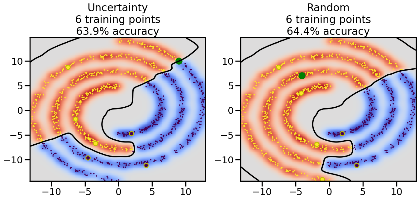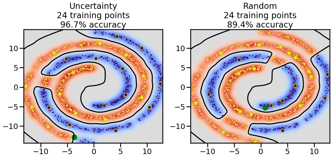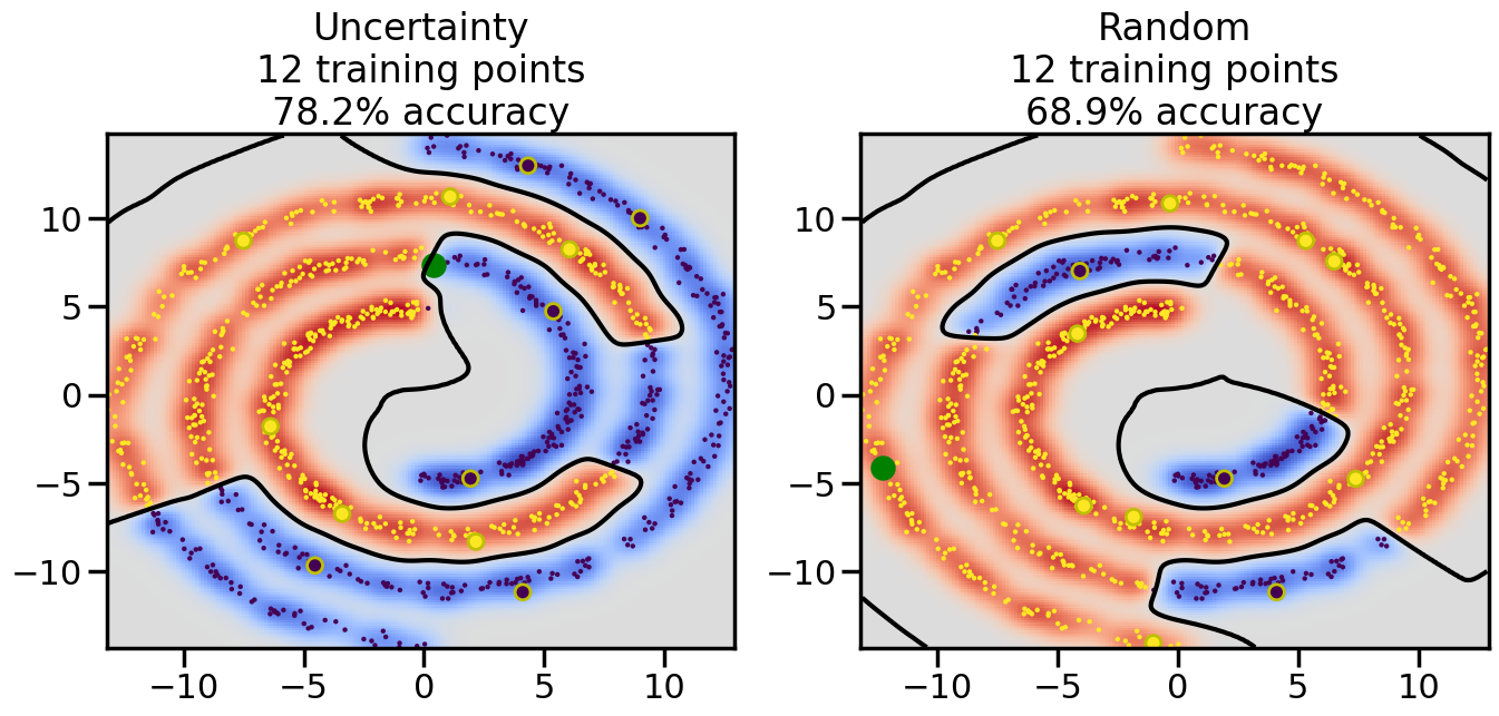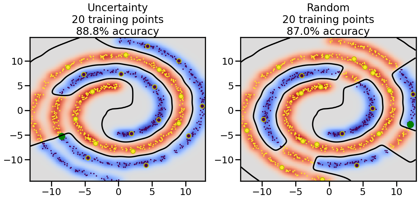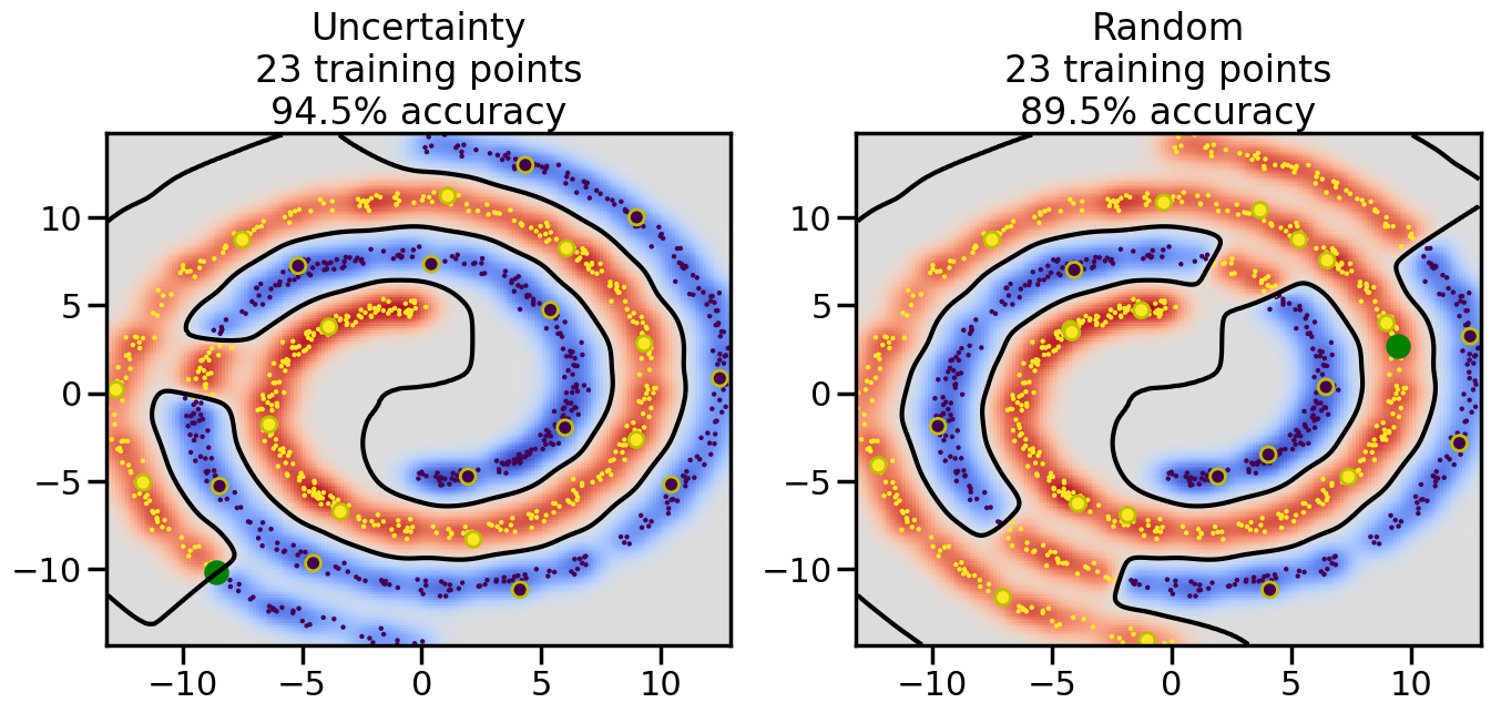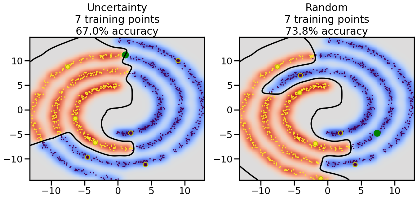# ------- Try changing the below to modify the classification smoothness -------gamma =0.7# e.g. between 0.1 and 5# --------------------------------------# Reset the random seednp.random.seed(3) # So we all see the same thing# Now, ready to begin learning:train_ind ={'Uncertainty': np.zeros(len(X),dtype=bool),'Random': np.zeros(len(X),dtype=bool)}options = train_ind.keys()possible_points = np.array(list(range(len(X))))# Initializationfor i inrange(3): ind = np.random.choice(possible_points[y==i%2])for o in options: train_ind[o][ind] =True# Classifiersclf = GaussianProcessClassifier(1.0* RBF(length_scale=gamma),optimizer=None)label_prop_model = LabelSpreading(kernel='rbf', gamma=5.0, max_iter=400)# How much data should we collect?num_total_samples =30# Let's store the errors for the models:semi_errors = {'Uncertainty':np.zeros(num_total_samples),'Random':np.zeros(num_total_samples) }for i inrange(num_total_samples):# As i increases, we increase the number of points plt.figure(figsize=(16,6))for j,o inenumerate(options): plt.subplot(1,2,j+1) # Plot intermediate results n_train = np.count_nonzero(train_ind[o])# Do Label Spreading: labels =-np.ones_like(y) labels[train_ind[o]] = y[train_ind[o]] label_prop_model.fit(X, labels) l = label_prop_model.transduction_ clf.fit(X,l) accuracy = clf.score(X[~train_ind[o],:],y[~train_ind[o]])# Plot the decision function x_min = X[:, 0].min() x_max = X[:, 0].max() y_min = X[:, 1].min() y_max = X[:, 1].max() XX, YY = np.mgrid[x_min:x_max:200j, y_min:y_max:200j]#Z = clf.decision_function(np.c_[XX.ravel(), YY.ravel()]) Z = clf.predict_proba(np.c_[XX.ravel(), YY.ravel()])[:,1] -0.5# Put the result into a contour plot Z = Z.reshape(XX.shape) plt.pcolormesh(XX, YY, Z , cmap=plt.get_cmap('coolwarm'),shading='auto') plt.contour(XX, YY, Z, colors=['k', 'k', 'k'], linestyles=['--', '-', '--'], levels=[-.5, 0, .5])# Plot the training points plt.scatter(X[:,0],X[:,1],c=l,lw =0,s=10,alpha=1) plt.scatter(X[train_ind[o],0],X[train_ind[o],1],c=y[train_ind[o]],s=100,lw=2,edgecolor='y')#dists = clf.decision_function(X[~train_ind[o],:]) dists = clf.predict_proba(X[~train_ind[o],:])[:,1] -0.5 dists = np.abs(dists)if o =='Uncertainty': closest_points = np.argwhere(dists == np.amin(dists)).ravel()# Basic Uncertainty sampling---just choose randomly ind = np.random.choice(closest_points) next_point = X[~train_ind[o],:][ind,:].flatten() next_ind = np.argwhere(X == next_point.flatten())[0,0]elif o =='Random': next_ind = np.random.choice(possible_points[~train_ind[o]],1)else:raiseValueError("Invalid option key: {}".format(o)) train_ind[o][next_ind] =True plt.scatter(X[next_ind,0],X[next_ind,1],c='g',s=200) semi_errors[o][i]=accuracy plt.title("%s\n%d training points\n%.1f%% accuracy"%(o,n_train,accuracy*100)) plt.show()