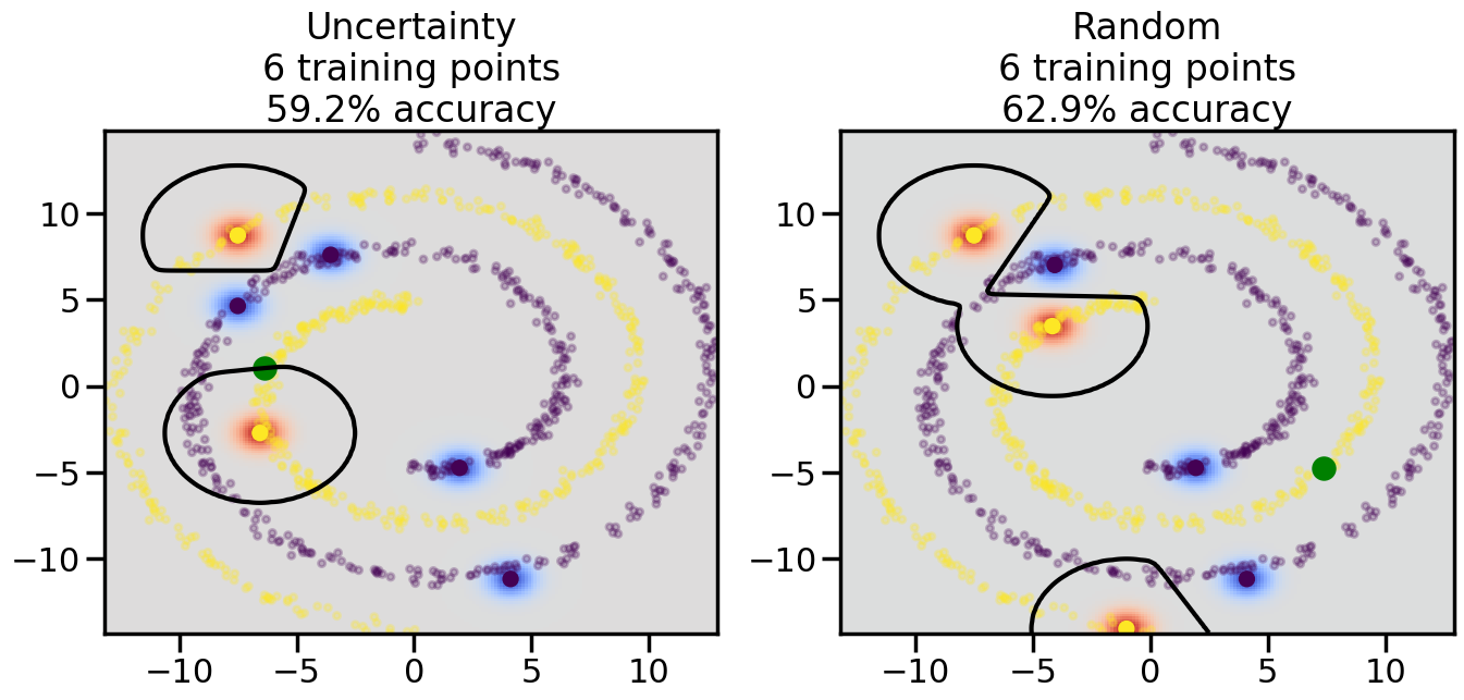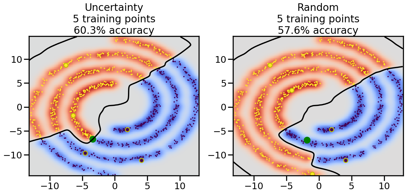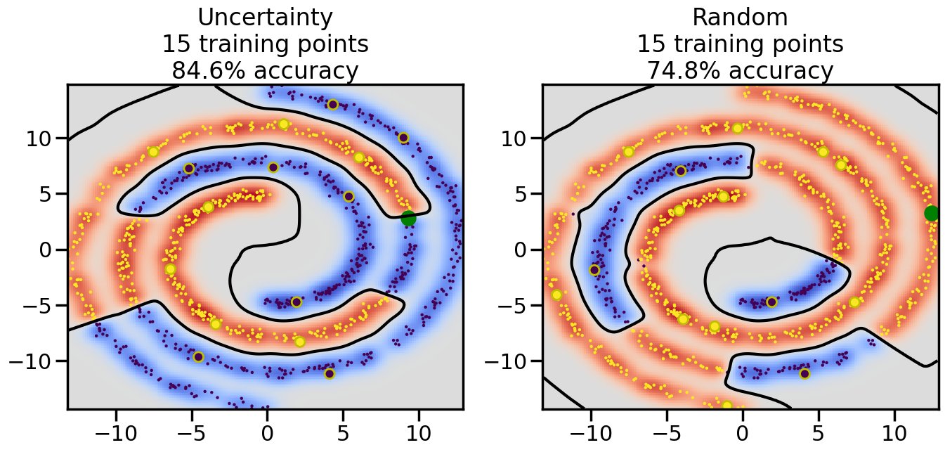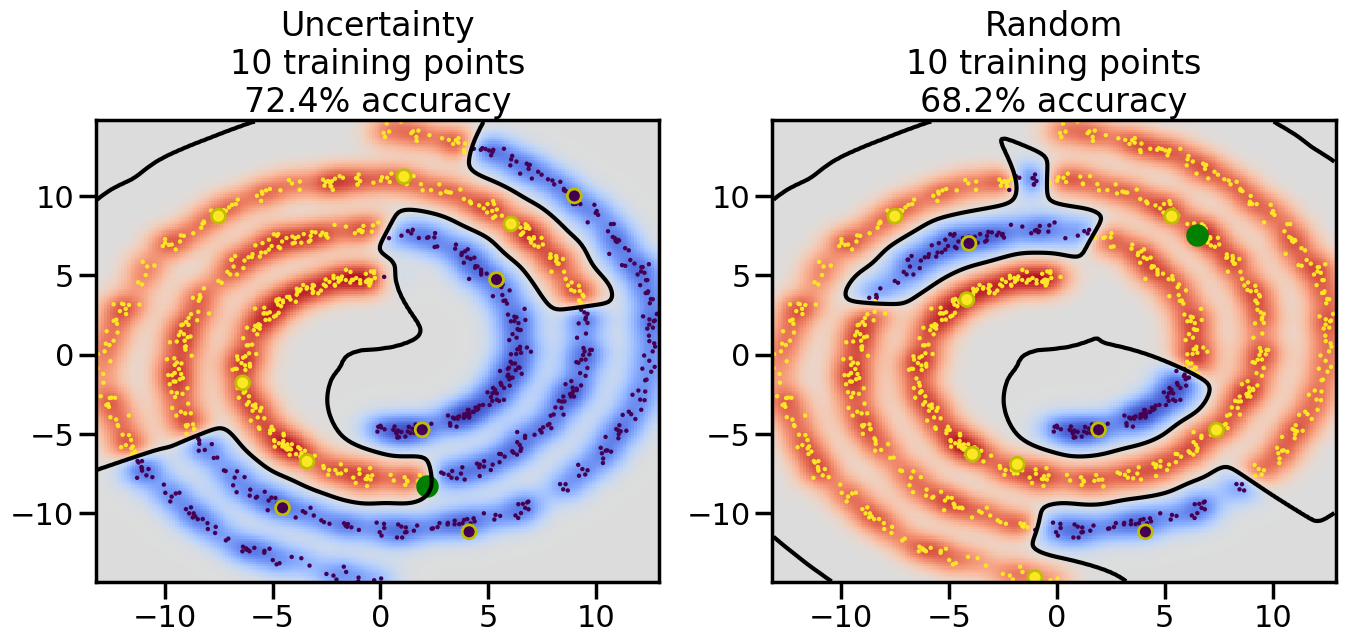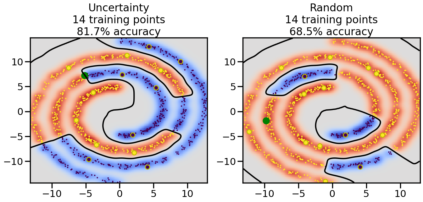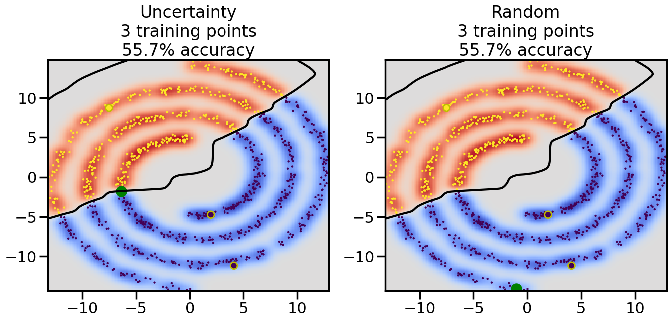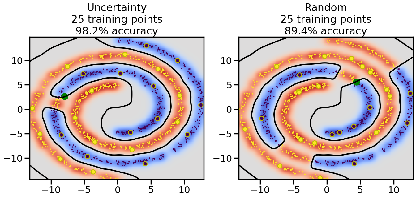 # ------- Try changing the below to modify the classification smoothness -------gamma =0.7# e.g. between 0.1 and 5# --------------------------------------# Reset the random seednp.random.seed(3) # So we all see the same thing# Now, ready to begin learning:train_ind ={'Uncertainty': np.zeros(len(X),dtype=bool),'Random': np.zeros(len(X),dtype=bool)}options = train_ind.keys()possible_points = np.array(list(range(len(X))))# Initializationfor i inrange(3): ind = np.random.choice(possible_points[y==i%2])for o in options: train_ind[o][ind] =True# Classifiersclf = GaussianProcessClassifier(1.0* RBF(length_scale=gamma),optimizer=None)label_prop_model = LabelSpreading(kernel='rbf', gamma=5.0, max_iter=400)# How much data should we collect?num_total_samples =30# Let's store the errors for the models:semi_errors = {'Uncertainty':np.zeros(num_total_samples),'Random':np.zeros(num_total_samples) }for i inrange(num_total_samples):# As i increases, we increase the number of points plt.figure(figsize=(16,6))for j,o inenumerate(options): plt.subplot(1,2,j+1) # Plot intermediate results n_train = np.count_nonzero(train_ind[o])# Do Label Spreading: labels =-np.ones_like(y) labels[train_ind[o]] = y[train_ind[o]] label_prop_model.fit(X, labels) l = label_prop_model.transduction_ clf.fit(X,l) accuracy = clf.score(X[~train_ind[o],:],y[~train_ind[o]])# Plot the decision function x_min = X[:, 0].min() x_max = X[:, 0].max() y_min = X[:, 1].min() y_max = X[:, 1].max() XX, YY = np.mgrid[x_min:x_max:200j, y_min:y_max:200j]#Z = clf.decision_function(np.c_[XX.ravel(), YY.ravel()]) Z = clf.predict_proba(np.c_[XX.ravel(), YY.ravel()])[:,1] -0.5# Put the result into a contour plot Z = Z.reshape(XX.shape) plt.pcolormesh(XX, YY, Z , cmap=plt.get_cmap('coolwarm'),shading='auto') plt.contour(XX, YY, Z, colors=['k', 'k', 'k'], linestyles=['--', '-', '--'], levels=[-.5, 0, .5])# Plot the training points plt.scatter(X[:,0],X[:,1],c=l,lw =0,s=10,alpha=1) plt.scatter(X[train_ind[o],0],X[train_ind[o],1],c=y[train_ind[o]],s=100,lw=2,edgecolor='y')#dists = clf.decision_function(X[~train_ind[o],:]) dists = clf.predict_proba(X[~train_ind[o],:])[:,1] -0.5 dists = np.abs(dists)if o =='Uncertainty': closest_points = np.argwhere(dists == np.amin(dists)).ravel()# Basic Uncertainty sampling---just choose randomly ind = np.random.choice(closest_points) next_point = X[~train_ind[o],:][ind,:].flatten() next_ind = np.argwhere(X == next_point.flatten())[0,0]elif o =='Random': next_ind = np.random.choice(possible_points[~train_ind[o]],1)else:raiseValueError("Invalid option key: {}".format(o)) train_ind[o][next_ind] =True plt.scatter(X[next_ind,0],X[next_ind,1],c='g',s=200) semi_errors[o][i]=accuracy plt.title("%s\n%d training points\n%.1f%% accuracy"%(o,n_train,accuracy*100)) plt.show()