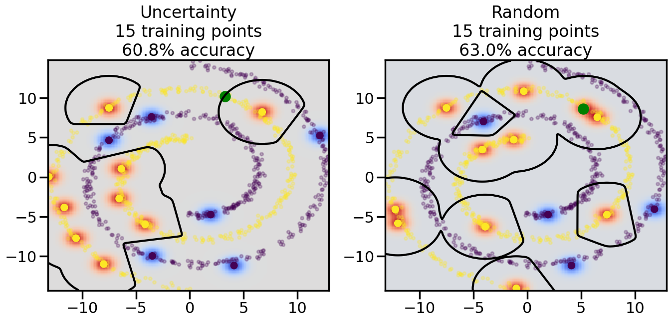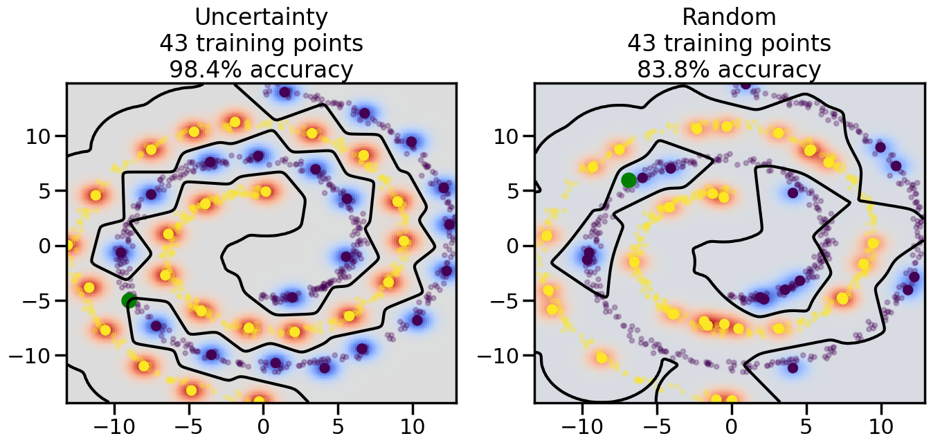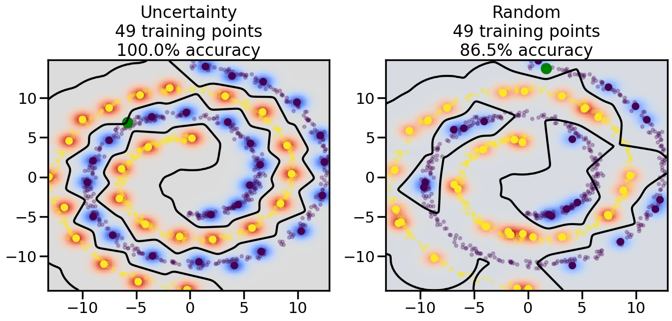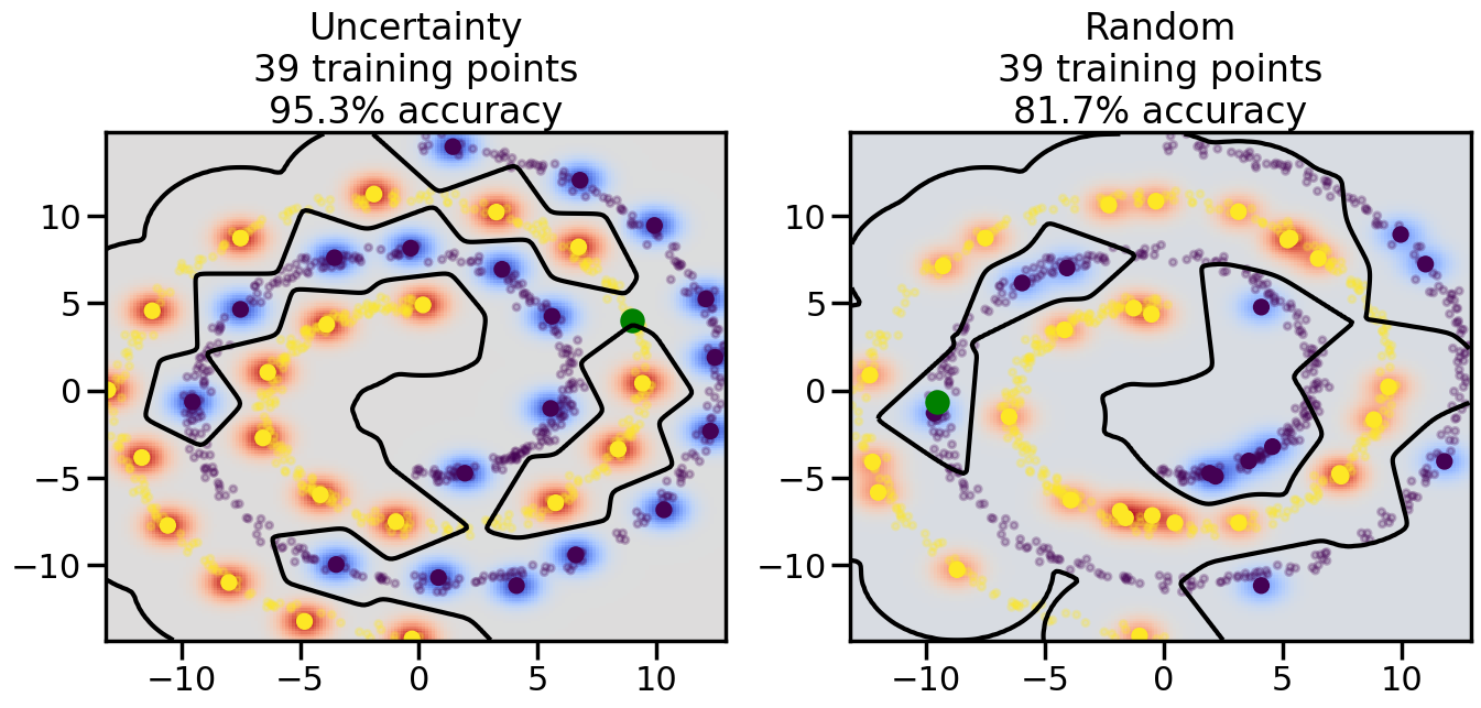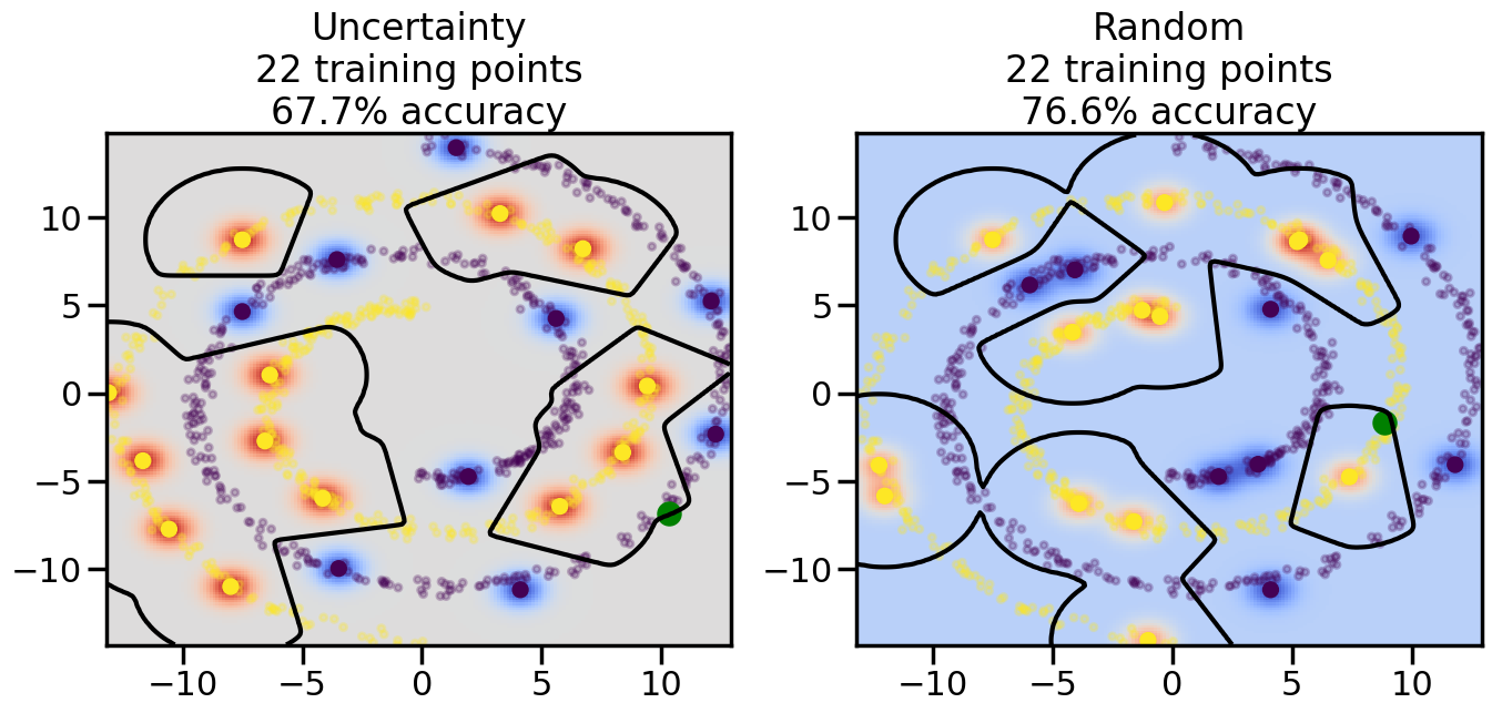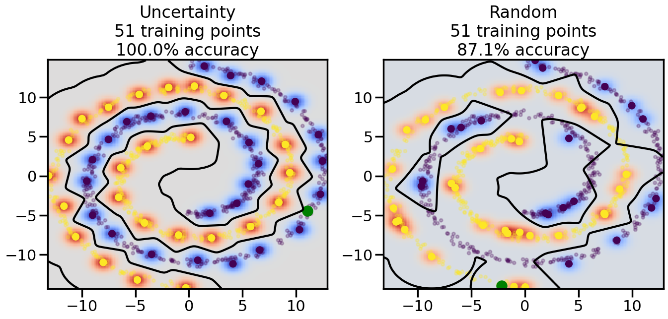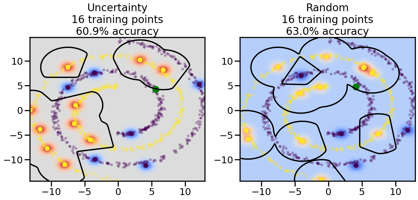 # ------- Try changing the below -------gamma =0.7# e.g. between 0.1 and 5# --------------------------------------#np.random.seed(3)# Now, ready to begin learning:train_ind ={'Uncertainty': np.zeros(len(X),dtype=bool),'Random':np.zeros(len(X),dtype=bool)}options = train_ind.keys()possible_points = np.array(list(range(len(X))))# Initialization options# 1. Select different points randomlyfor i inrange(3): ind = np.random.choice(possible_points[y==i%2])for o in options: train_ind[o][ind] =True# Trying different classifiers#clf = svm.SVC(kernel='rbf',gamma=gamma)clf = GaussianProcessClassifier(1.0* RBF(length_scale=gamma),optimizer=None)# How much data should we collect?num_total_samples =50# Let's store the errors for the models:errors = {'Uncertainty':np.zeros(num_total_samples),'Random':np.zeros(num_total_samples)}for i inrange(num_total_samples):# As i increases, we increase the number of points plt.figure(figsize=(16,6))for j,o inenumerate(options): plt.subplot(1,2,j+1) # Get data on original model (before we select next point) n_train = np.count_nonzero(train_ind[o]) clf.fit(X[train_ind[o],:],y[train_ind[o]]) accuracy = clf.score(X[~train_ind[o],:],y[~train_ind[o]])# Plot the decision function x_min = X[:, 0].min() x_max = X[:, 0].max() y_min = X[:, 1].min() y_max = X[:, 1].max() XX, YY = np.mgrid[x_min:x_max:200j, y_min:y_max:200j]#Z = clf.decision_function(np.c_[XX.ravel(), YY.ravel()]) Z = clf.predict_proba(np.c_[XX.ravel(), YY.ravel()])[:,1] -0.5# Put the result into a color plot Z = Z.reshape(XX.shape) plt.pcolormesh(XX, YY, Z, cmap=plt.get_cmap('coolwarm'),shading='auto') plt.contour(XX, YY, Z, colors=['k', 'k', 'k'], linestyles=['--', '-', '--'], levels=[-.5, 0, .5])# Plot the training points plt.scatter(X[:,0],X[:,1],c=y,s=20,alpha=0.25) plt.scatter(X[train_ind[o],0],X[train_ind[o],1], c=y[train_ind[o]],s=100,lw=1)#clf.fit(X[train_ind[o],:],y[train_ind[o]])#yp,MSE = clf.predict(X[~train_ind[o],:])# Calculate distance to decision boundary# (We're less certain at the boundary)#dists = clf.decision_function(X[~train_ind[o],:]) dists = clf.predict_proba(X[~train_ind[o],:])[:,1] -0.5 dists = np.abs(dists) # Want absolute distance from boundaryif o =='Uncertainty':# Basic Uncertainty sampling# Compute closest points and then pick randomly among# the closet points closest_points = np.argwhere(dists == np.amin(dists)).ravel() ind = np.random.choice(closest_points) next_point = X[~train_ind[o],:][ind,:].flatten() next_ind = np.argwhere(X == next_point.flatten())[0,0]elif o =='Random': next_ind = np.random.choice(possible_points[~train_ind[o]],1)elif o =='Density':# Multiply distances by similarity score# TBDpasselse:raise Error train_ind[o][next_ind] =True# Plot the selected point in green plt.scatter(X[next_ind,0],X[next_ind,1],c='g',s=200) errors[o][i]=accuracy plt.title("%s\n%d training points\n%.1f%% accuracy"%(o,n_train,accuracy*100)) plt.show()
