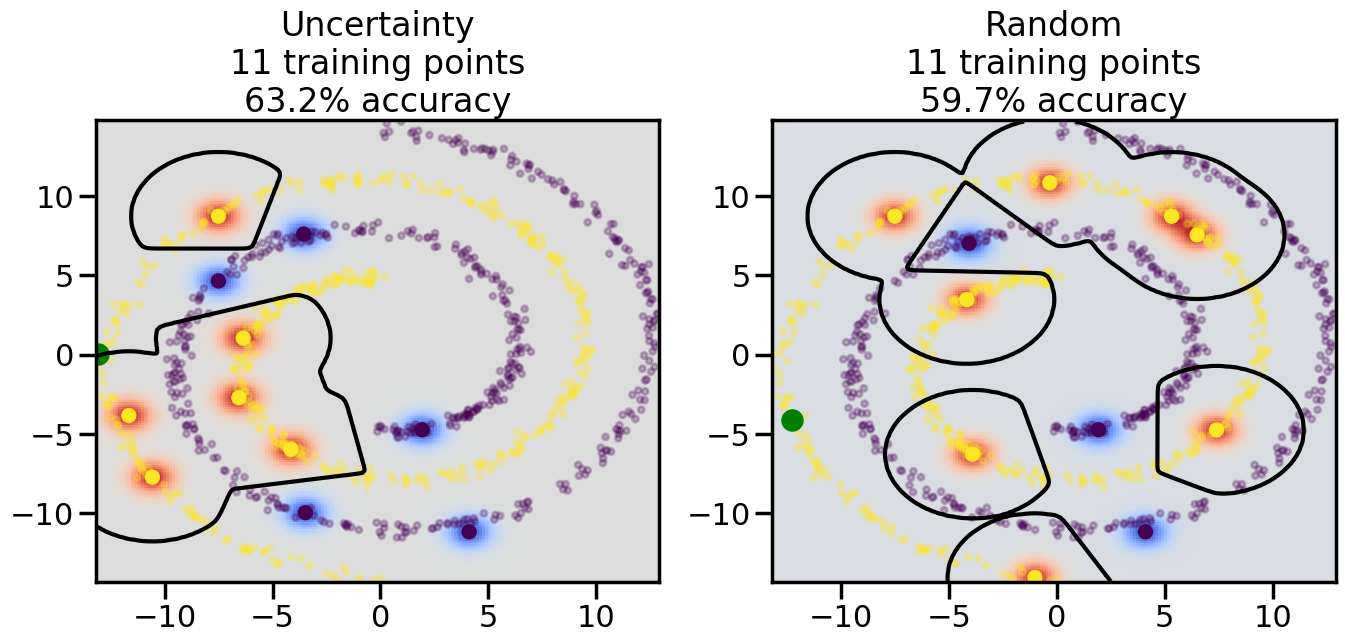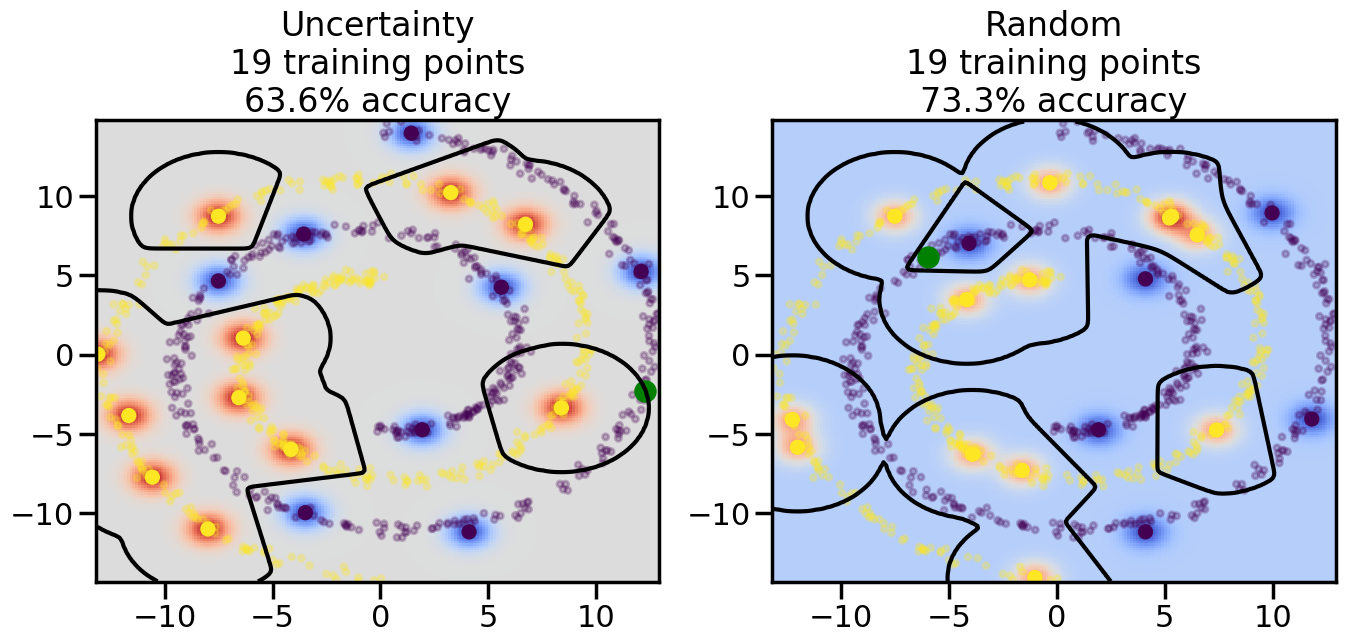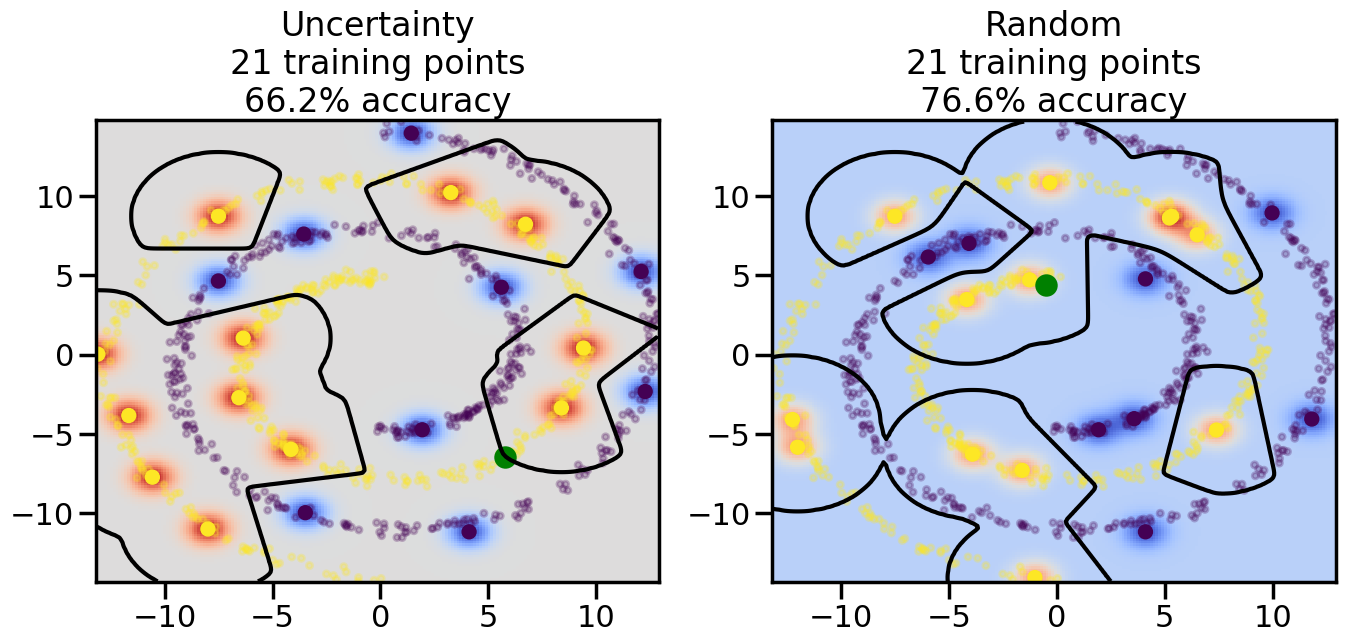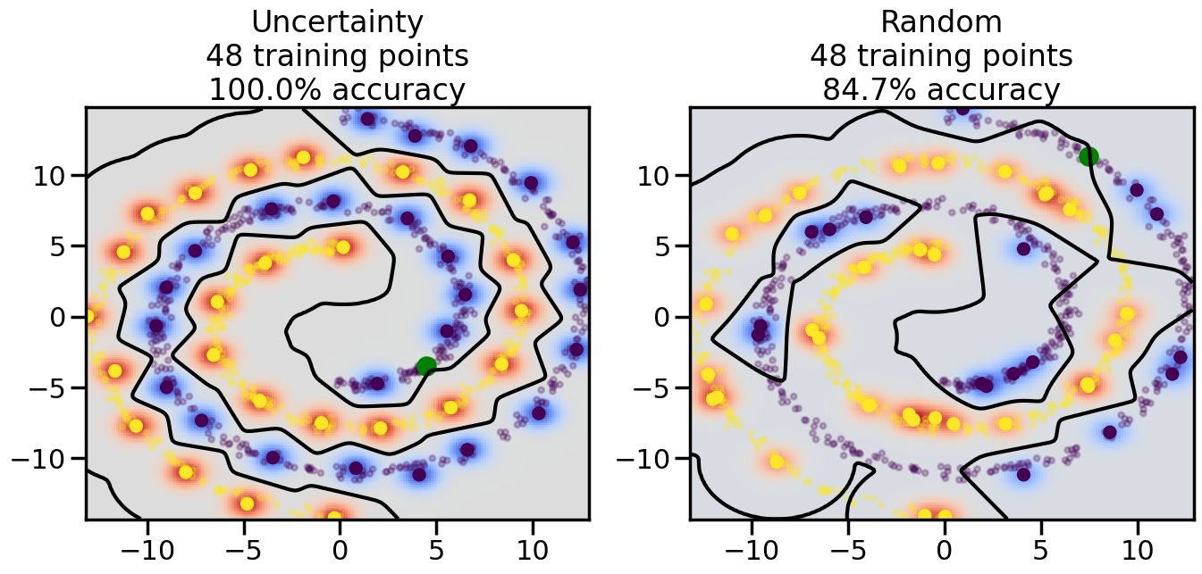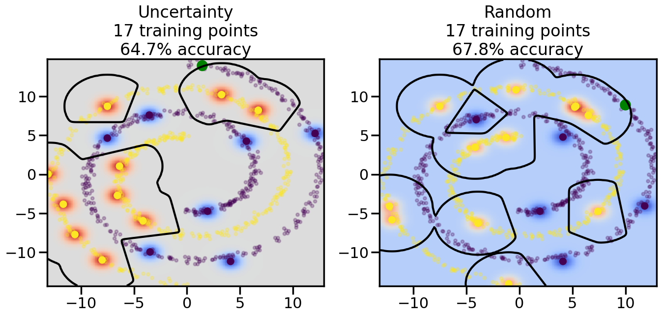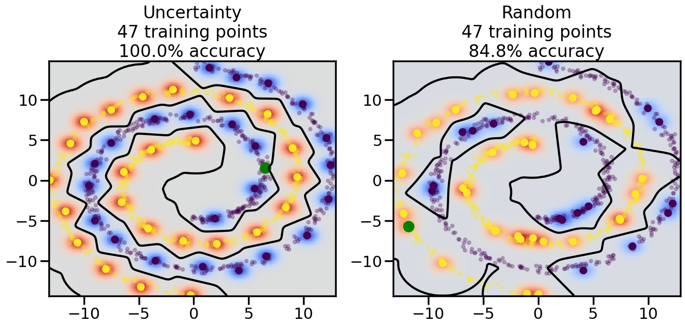 # ------- Try changing the below -------gamma =0.7# e.g. between 0.1 and 5# --------------------------------------#np.random.seed(3)# Now, ready to begin learning:train_ind ={'Uncertainty': np.zeros(len(X),dtype=bool),'Random':np.zeros(len(X),dtype=bool)}options = train_ind.keys()possible_points = np.array(list(range(len(X))))# Initialization options# 1. Select different points randomlyfor i inrange(3): ind = np.random.choice(possible_points[y==i%2])for o in options: train_ind[o][ind] =True# Trying different classifiers#clf = svm.SVC(kernel='rbf',gamma=gamma)clf = GaussianProcessClassifier(1.0* RBF(length_scale=gamma),optimizer=None)# How much data should we collect?num_total_samples =50# Let's store the errors for the models:errors = {'Uncertainty':np.zeros(num_total_samples),'Random':np.zeros(num_total_samples)}for i inrange(num_total_samples):# As i increases, we increase the number of points plt.figure(figsize=(16,6))for j,o inenumerate(options): plt.subplot(1,2,j+1) # Get data on original model (before we select next point) n_train = np.count_nonzero(train_ind[o]) clf.fit(X[train_ind[o],:],y[train_ind[o]]) accuracy = clf.score(X[~train_ind[o],:],y[~train_ind[o]])# Plot the decision function x_min = X[:, 0].min() x_max = X[:, 0].max() y_min = X[:, 1].min() y_max = X[:, 1].max() XX, YY = np.mgrid[x_min:x_max:200j, y_min:y_max:200j]#Z = clf.decision_function(np.c_[XX.ravel(), YY.ravel()]) Z = clf.predict_proba(np.c_[XX.ravel(), YY.ravel()])[:,1] -0.5# Put the result into a color plot Z = Z.reshape(XX.shape) plt.pcolormesh(XX, YY, Z, cmap=plt.get_cmap('coolwarm'),shading='auto') plt.contour(XX, YY, Z, colors=['k', 'k', 'k'], linestyles=['--', '-', '--'], levels=[-.5, 0, .5])# Plot the training points plt.scatter(X[:,0],X[:,1],c=y,s=20,alpha=0.25) plt.scatter(X[train_ind[o],0],X[train_ind[o],1], c=y[train_ind[o]],s=100,lw=1)#clf.fit(X[train_ind[o],:],y[train_ind[o]])#yp,MSE = clf.predict(X[~train_ind[o],:])# Calculate distance to decision boundary# (We're less certain at the boundary)#dists = clf.decision_function(X[~train_ind[o],:]) dists = clf.predict_proba(X[~train_ind[o],:])[:,1] -0.5 dists = np.abs(dists) # Want absolute distance from boundaryif o =='Uncertainty':# Basic Uncertainty sampling# Compute closest points and then pick randomly among# the closet points closest_points = np.argwhere(dists == np.amin(dists)).ravel() ind = np.random.choice(closest_points) next_point = X[~train_ind[o],:][ind,:].flatten() next_ind = np.argwhere(X == next_point.flatten())[0,0]elif o =='Random': next_ind = np.random.choice(possible_points[~train_ind[o]],1)elif o =='Density':# Multiply distances by similarity score# TBDpasselse:raise Error train_ind[o][next_ind] =True# Plot the selected point in green plt.scatter(X[next_ind,0],X[next_ind,1],c='g',s=200) errors[o][i]=accuracy plt.title("%s\n%d training points\n%.1f%% accuracy"%(o,n_train,accuracy*100)) plt.show()