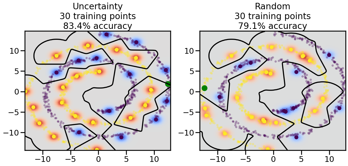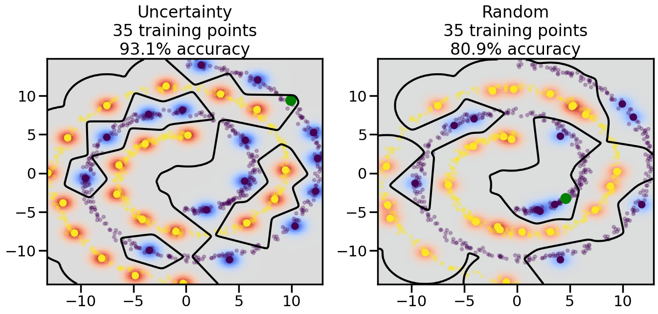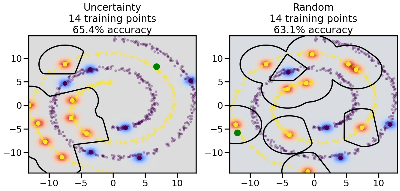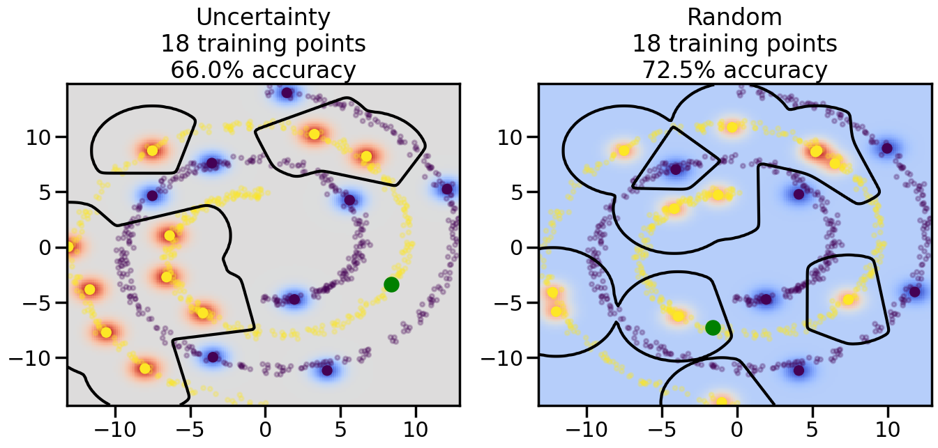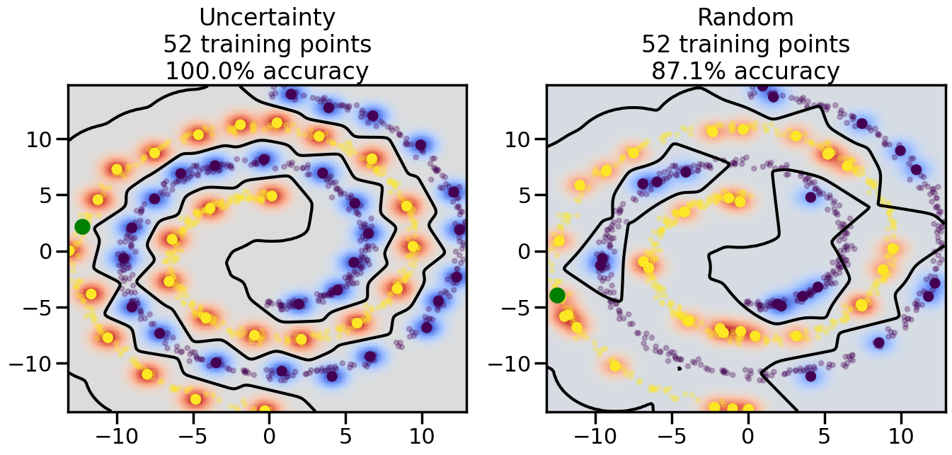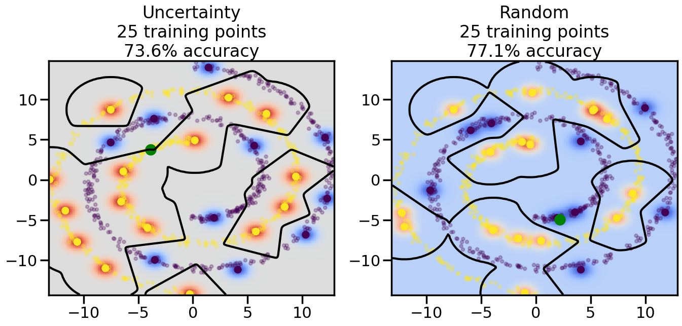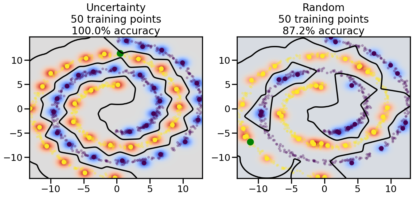 # ------- Try changing the below -------gamma =0.7# e.g. between 0.1 and 5# --------------------------------------#np.random.seed(3)# Now, ready to begin learning:train_ind ={'Uncertainty': np.zeros(len(X),dtype=bool),'Random':np.zeros(len(X),dtype=bool)}options = train_ind.keys()possible_points = np.array(list(range(len(X))))# Initialization options# 1. Select different points randomlyfor i inrange(3): ind = np.random.choice(possible_points[y==i%2])for o in options: train_ind[o][ind] =True# Trying different classifiers#clf = svm.SVC(kernel='rbf',gamma=gamma)clf = GaussianProcessClassifier(1.0* RBF(length_scale=gamma),optimizer=None)# How much data should we collect?num_total_samples =50# Let's store the errors for the models:errors = {'Uncertainty':np.zeros(num_total_samples),'Random':np.zeros(num_total_samples)}for i inrange(num_total_samples):# As i increases, we increase the number of points plt.figure(figsize=(16,6))for j,o inenumerate(options): plt.subplot(1,2,j+1) # Get data on original model (before we select next point) n_train = np.count_nonzero(train_ind[o]) clf.fit(X[train_ind[o],:],y[train_ind[o]]) accuracy = clf.score(X[~train_ind[o],:],y[~train_ind[o]])# Plot the decision function x_min = X[:, 0].min() x_max = X[:, 0].max() y_min = X[:, 1].min() y_max = X[:, 1].max() XX, YY = np.mgrid[x_min:x_max:200j, y_min:y_max:200j]#Z = clf.decision_function(np.c_[XX.ravel(), YY.ravel()]) Z = clf.predict_proba(np.c_[XX.ravel(), YY.ravel()])[:,1] -0.5# Put the result into a color plot Z = Z.reshape(XX.shape) plt.pcolormesh(XX, YY, Z, cmap=plt.get_cmap('coolwarm'),shading='auto') plt.contour(XX, YY, Z, colors=['k', 'k', 'k'], linestyles=['--', '-', '--'], levels=[-.5, 0, .5])# Plot the training points plt.scatter(X[:,0],X[:,1],c=y,s=20,alpha=0.25) plt.scatter(X[train_ind[o],0],X[train_ind[o],1], c=y[train_ind[o]],s=100,lw=1)#clf.fit(X[train_ind[o],:],y[train_ind[o]])#yp,MSE = clf.predict(X[~train_ind[o],:])# Calculate distance to decision boundary# (We're less certain at the boundary)#dists = clf.decision_function(X[~train_ind[o],:]) dists = clf.predict_proba(X[~train_ind[o],:])[:,1] -0.5 dists = np.abs(dists) # Want absolute distance from boundaryif o =='Uncertainty':# Basic Uncertainty sampling# Compute closest points and then pick randomly among# the closet points closest_points = np.argwhere(dists == np.amin(dists)).ravel() ind = np.random.choice(closest_points) next_point = X[~train_ind[o],:][ind,:].flatten() next_ind = np.argwhere(X == next_point.flatten())[0,0]elif o =='Random': next_ind = np.random.choice(possible_points[~train_ind[o]],1)elif o =='Density':# Multiply distances by similarity score# TBDpasselse:raise Error train_ind[o][next_ind] =True# Plot the selected point in green plt.scatter(X[next_ind,0],X[next_ind,1],c='g',s=200) errors[o][i]=accuracy plt.title("%s\n%d training points\n%.1f%% accuracy"%(o,n_train,accuracy*100)) plt.show()