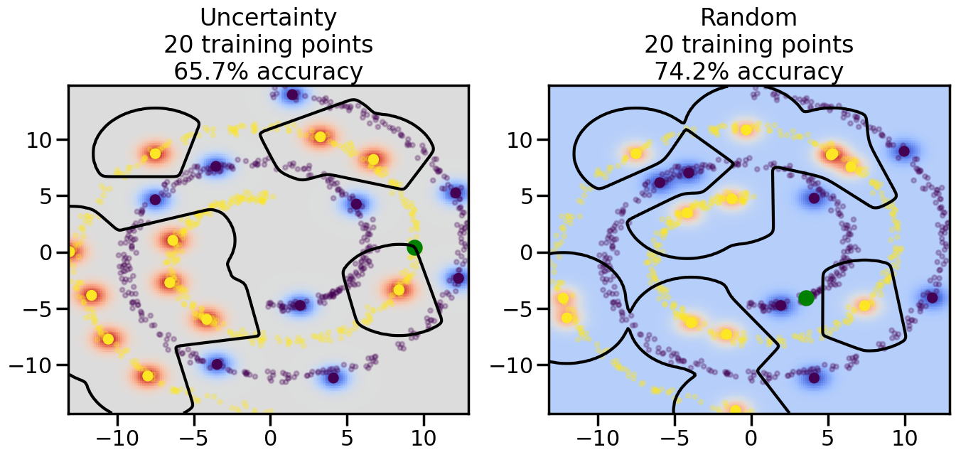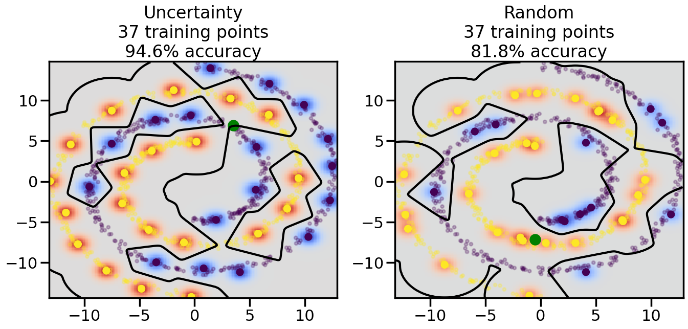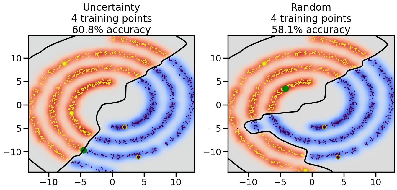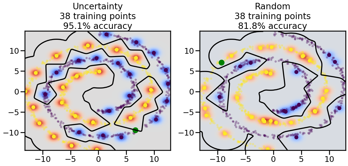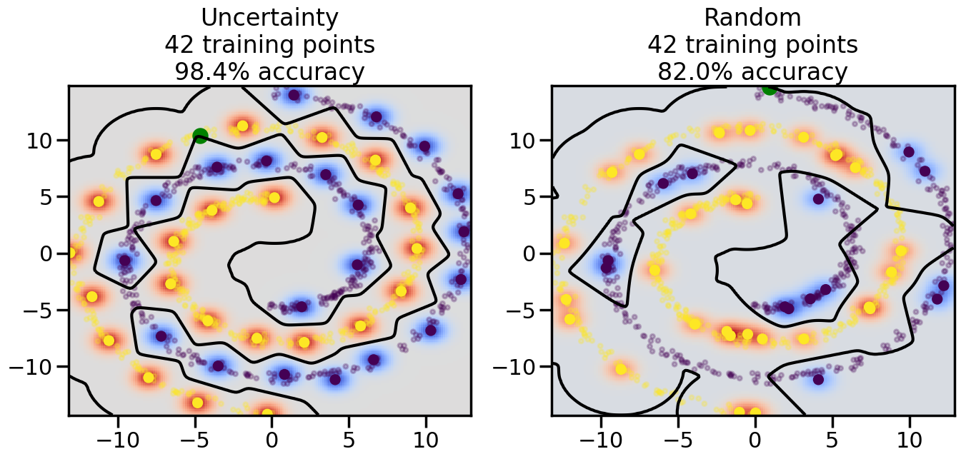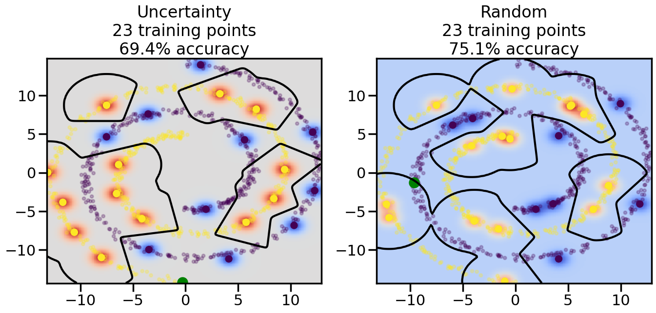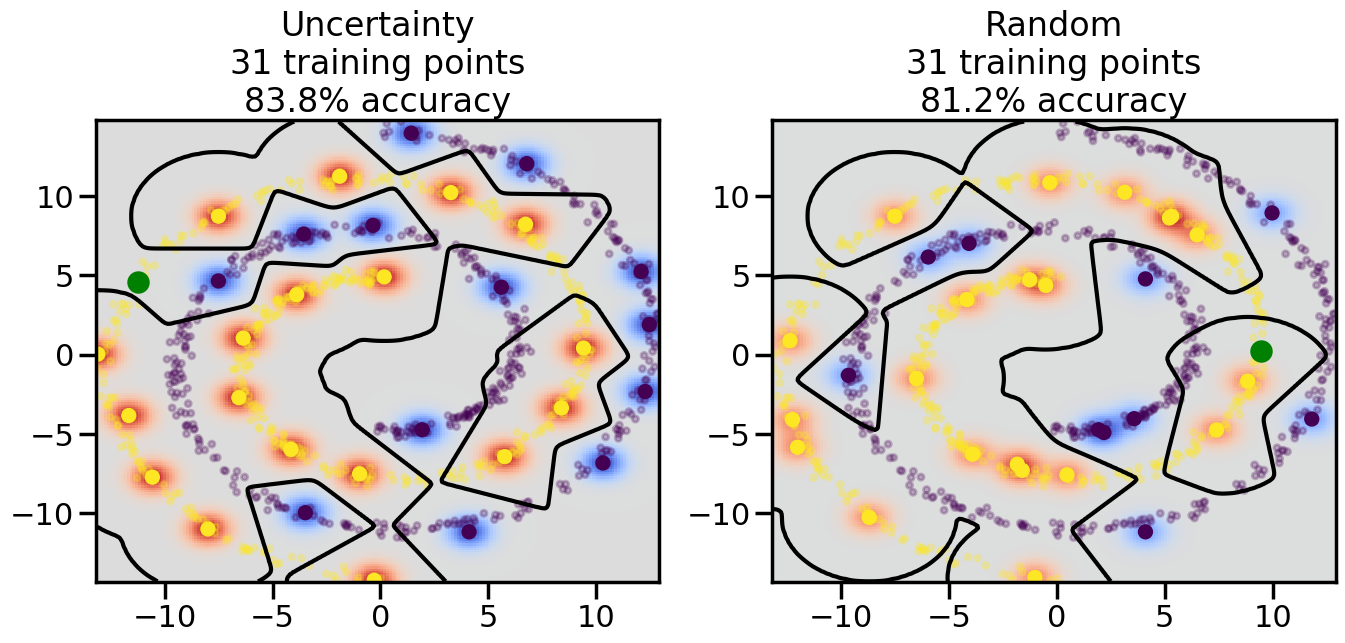 # ------- Try changing the below -------gamma =0.7# e.g. between 0.1 and 5# --------------------------------------#np.random.seed(3)# Now, ready to begin learning:train_ind ={'Uncertainty': np.zeros(len(X),dtype=bool),'Random':np.zeros(len(X),dtype=bool)}options = train_ind.keys()possible_points = np.array(list(range(len(X))))# Initialization options# 1. Select different points randomlyfor i inrange(3): ind = np.random.choice(possible_points[y==i%2])for o in options: train_ind[o][ind] =True# Trying different classifiers#clf = svm.SVC(kernel='rbf',gamma=gamma)clf = GaussianProcessClassifier(1.0* RBF(length_scale=gamma),optimizer=None)# How much data should we collect?num_total_samples =50# Let's store the errors for the models:errors = {'Uncertainty':np.zeros(num_total_samples),'Random':np.zeros(num_total_samples)}for i inrange(num_total_samples):# As i increases, we increase the number of points plt.figure(figsize=(16,6))for j,o inenumerate(options): plt.subplot(1,2,j+1) # Get data on original model (before we select next point) n_train = np.count_nonzero(train_ind[o]) clf.fit(X[train_ind[o],:],y[train_ind[o]]) accuracy = clf.score(X[~train_ind[o],:],y[~train_ind[o]])# Plot the decision function x_min = X[:, 0].min() x_max = X[:, 0].max() y_min = X[:, 1].min() y_max = X[:, 1].max() XX, YY = np.mgrid[x_min:x_max:200j, y_min:y_max:200j]#Z = clf.decision_function(np.c_[XX.ravel(), YY.ravel()]) Z = clf.predict_proba(np.c_[XX.ravel(), YY.ravel()])[:,1] -0.5# Put the result into a color plot Z = Z.reshape(XX.shape) plt.pcolormesh(XX, YY, Z, cmap=plt.get_cmap('coolwarm'),shading='auto') plt.contour(XX, YY, Z, colors=['k', 'k', 'k'], linestyles=['--', '-', '--'], levels=[-.5, 0, .5])# Plot the training points plt.scatter(X[:,0],X[:,1],c=y,s=20,alpha=0.25) plt.scatter(X[train_ind[o],0],X[train_ind[o],1], c=y[train_ind[o]],s=100,lw=1)#clf.fit(X[train_ind[o],:],y[train_ind[o]])#yp,MSE = clf.predict(X[~train_ind[o],:])# Calculate distance to decision boundary# (We're less certain at the boundary)#dists = clf.decision_function(X[~train_ind[o],:]) dists = clf.predict_proba(X[~train_ind[o],:])[:,1] -0.5 dists = np.abs(dists) # Want absolute distance from boundaryif o =='Uncertainty':# Basic Uncertainty sampling# Compute closest points and then pick randomly among# the closet points closest_points = np.argwhere(dists == np.amin(dists)).ravel() ind = np.random.choice(closest_points) next_point = X[~train_ind[o],:][ind,:].flatten() next_ind = np.argwhere(X == next_point.flatten())[0,0]elif o =='Random': next_ind = np.random.choice(possible_points[~train_ind[o]],1)elif o =='Density':# Multiply distances by similarity score# TBDpasselse:raise Error train_ind[o][next_ind] =True# Plot the selected point in green plt.scatter(X[next_ind,0],X[next_ind,1],c='g',s=200) errors[o][i]=accuracy plt.title("%s\n%d training points\n%.1f%% accuracy"%(o,n_train,accuracy*100)) plt.show()