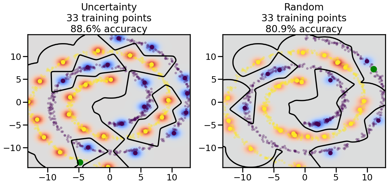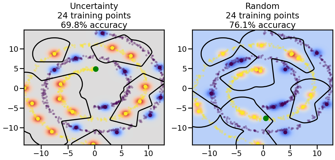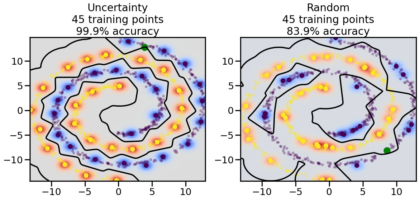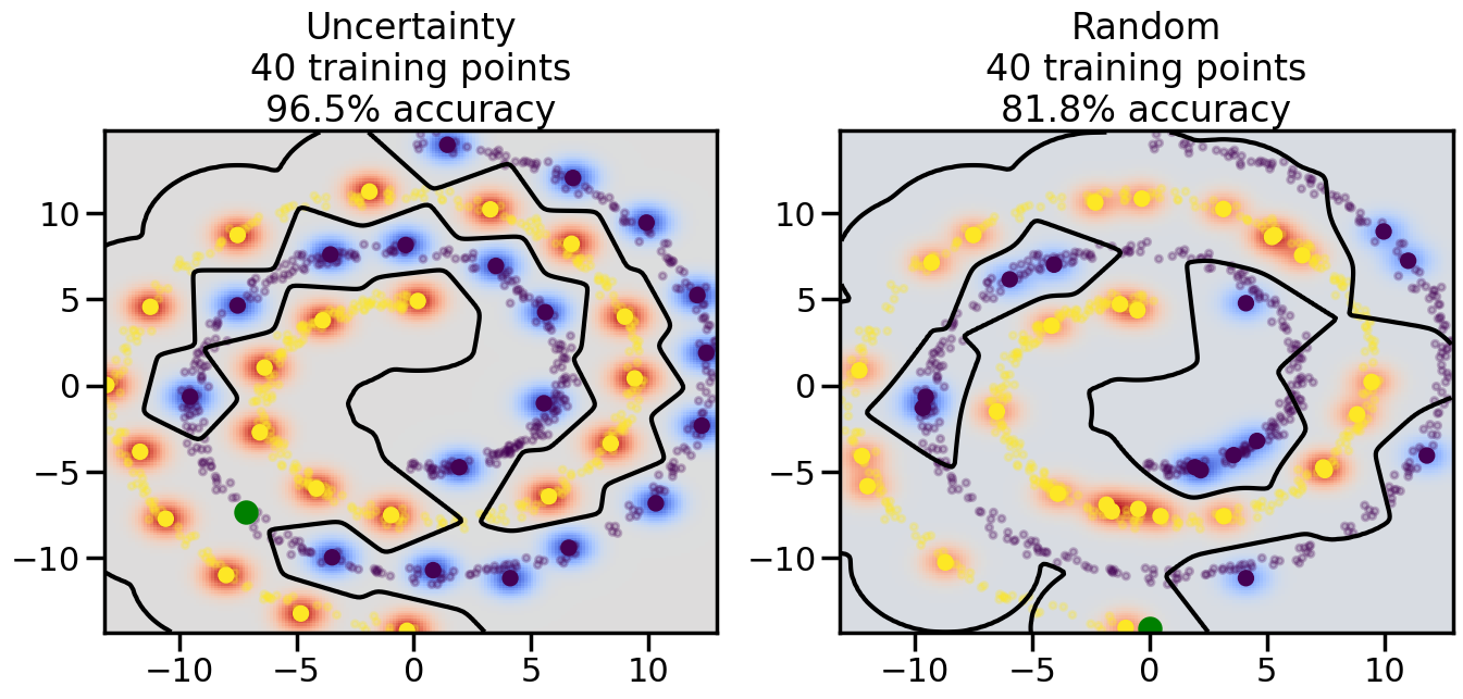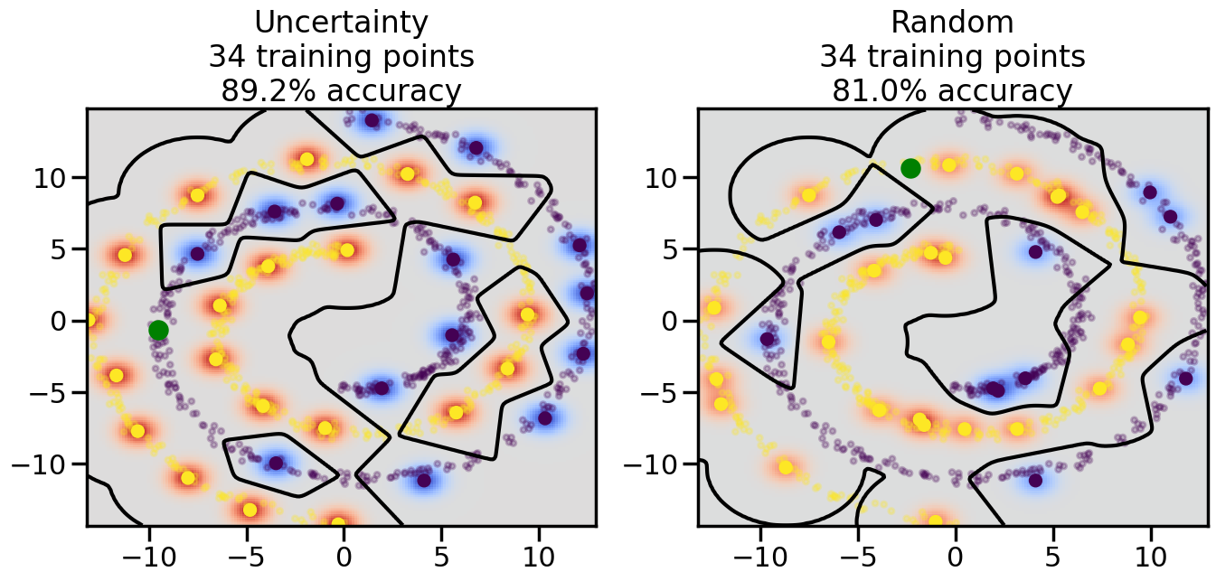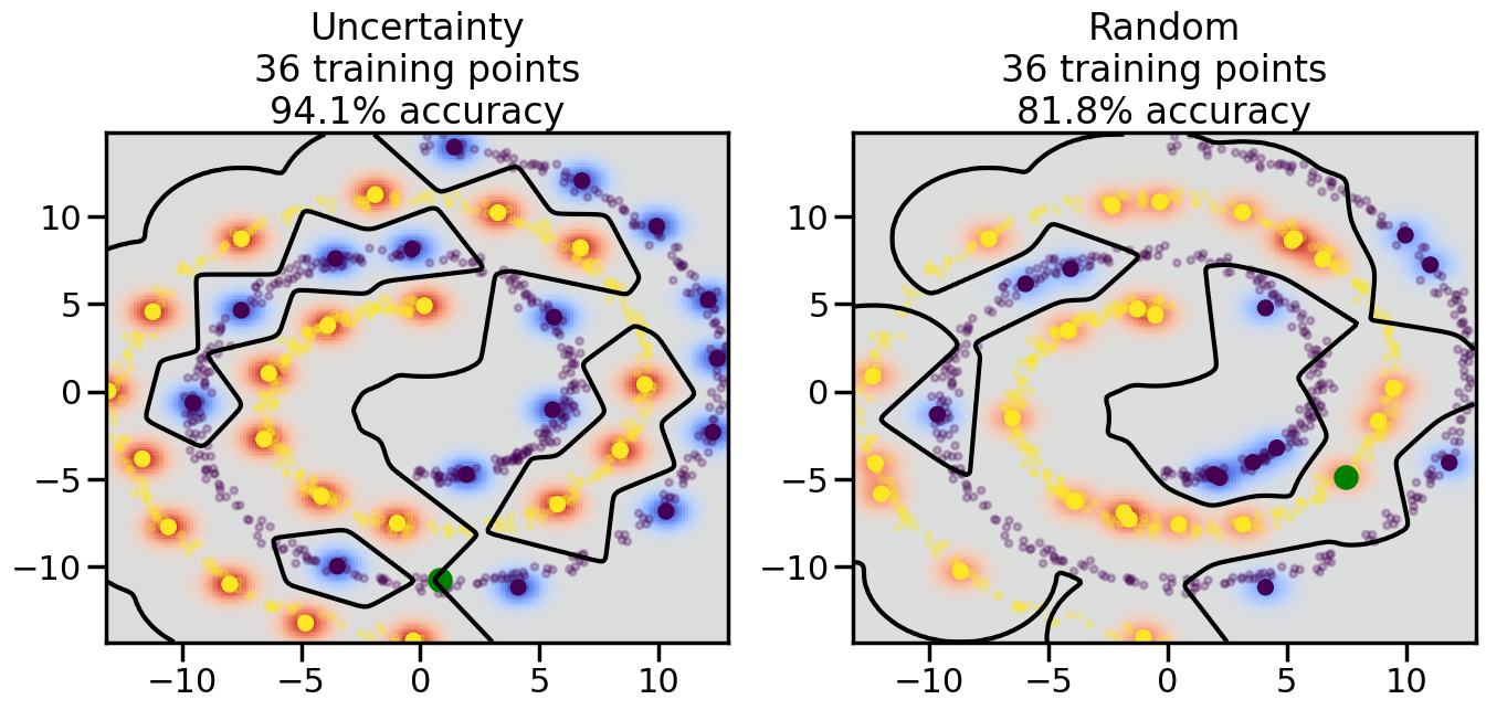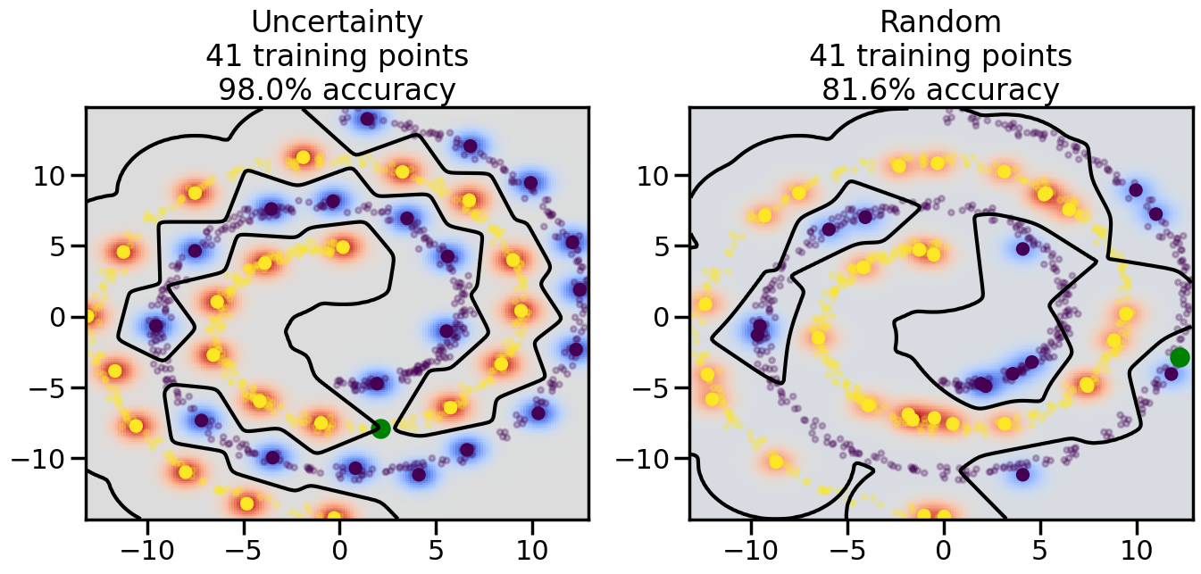 # ------- Try changing the below -------gamma =0.7# e.g. between 0.1 and 5# --------------------------------------#np.random.seed(3)# Now, ready to begin learning:train_ind ={'Uncertainty': np.zeros(len(X),dtype=bool),'Random':np.zeros(len(X),dtype=bool)}options = train_ind.keys()possible_points = np.array(list(range(len(X))))# Initialization options# 1. Select different points randomlyfor i inrange(3): ind = np.random.choice(possible_points[y==i%2])for o in options: train_ind[o][ind] =True# Trying different classifiers#clf = svm.SVC(kernel='rbf',gamma=gamma)clf = GaussianProcessClassifier(1.0* RBF(length_scale=gamma),optimizer=None)# How much data should we collect?num_total_samples =50# Let's store the errors for the models:errors = {'Uncertainty':np.zeros(num_total_samples),'Random':np.zeros(num_total_samples)}for i inrange(num_total_samples):# As i increases, we increase the number of points plt.figure(figsize=(16,6))for j,o inenumerate(options): plt.subplot(1,2,j+1) # Get data on original model (before we select next point) n_train = np.count_nonzero(train_ind[o]) clf.fit(X[train_ind[o],:],y[train_ind[o]]) accuracy = clf.score(X[~train_ind[o],:],y[~train_ind[o]])# Plot the decision function x_min = X[:, 0].min() x_max = X[:, 0].max() y_min = X[:, 1].min() y_max = X[:, 1].max() XX, YY = np.mgrid[x_min:x_max:200j, y_min:y_max:200j]#Z = clf.decision_function(np.c_[XX.ravel(), YY.ravel()]) Z = clf.predict_proba(np.c_[XX.ravel(), YY.ravel()])[:,1] -0.5# Put the result into a color plot Z = Z.reshape(XX.shape) plt.pcolormesh(XX, YY, Z, cmap=plt.get_cmap('coolwarm'),shading='auto') plt.contour(XX, YY, Z, colors=['k', 'k', 'k'], linestyles=['--', '-', '--'], levels=[-.5, 0, .5])# Plot the training points plt.scatter(X[:,0],X[:,1],c=y,s=20,alpha=0.25) plt.scatter(X[train_ind[o],0],X[train_ind[o],1], c=y[train_ind[o]],s=100,lw=1)#clf.fit(X[train_ind[o],:],y[train_ind[o]])#yp,MSE = clf.predict(X[~train_ind[o],:])# Calculate distance to decision boundary# (We're less certain at the boundary)#dists = clf.decision_function(X[~train_ind[o],:]) dists = clf.predict_proba(X[~train_ind[o],:])[:,1] -0.5 dists = np.abs(dists) # Want absolute distance from boundaryif o =='Uncertainty':# Basic Uncertainty sampling# Compute closest points and then pick randomly among# the closet points closest_points = np.argwhere(dists == np.amin(dists)).ravel() ind = np.random.choice(closest_points) next_point = X[~train_ind[o],:][ind,:].flatten() next_ind = np.argwhere(X == next_point.flatten())[0,0]elif o =='Random': next_ind = np.random.choice(possible_points[~train_ind[o]],1)elif o =='Density':# Multiply distances by similarity score# TBDpasselse:raise Error train_ind[o][next_ind] =True# Plot the selected point in green plt.scatter(X[next_ind,0],X[next_ind,1],c='g',s=200) errors[o][i]=accuracy plt.title("%s\n%d training points\n%.1f%% accuracy"%(o,n_train,accuracy*100)) plt.show()