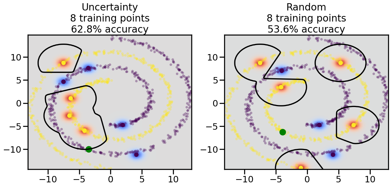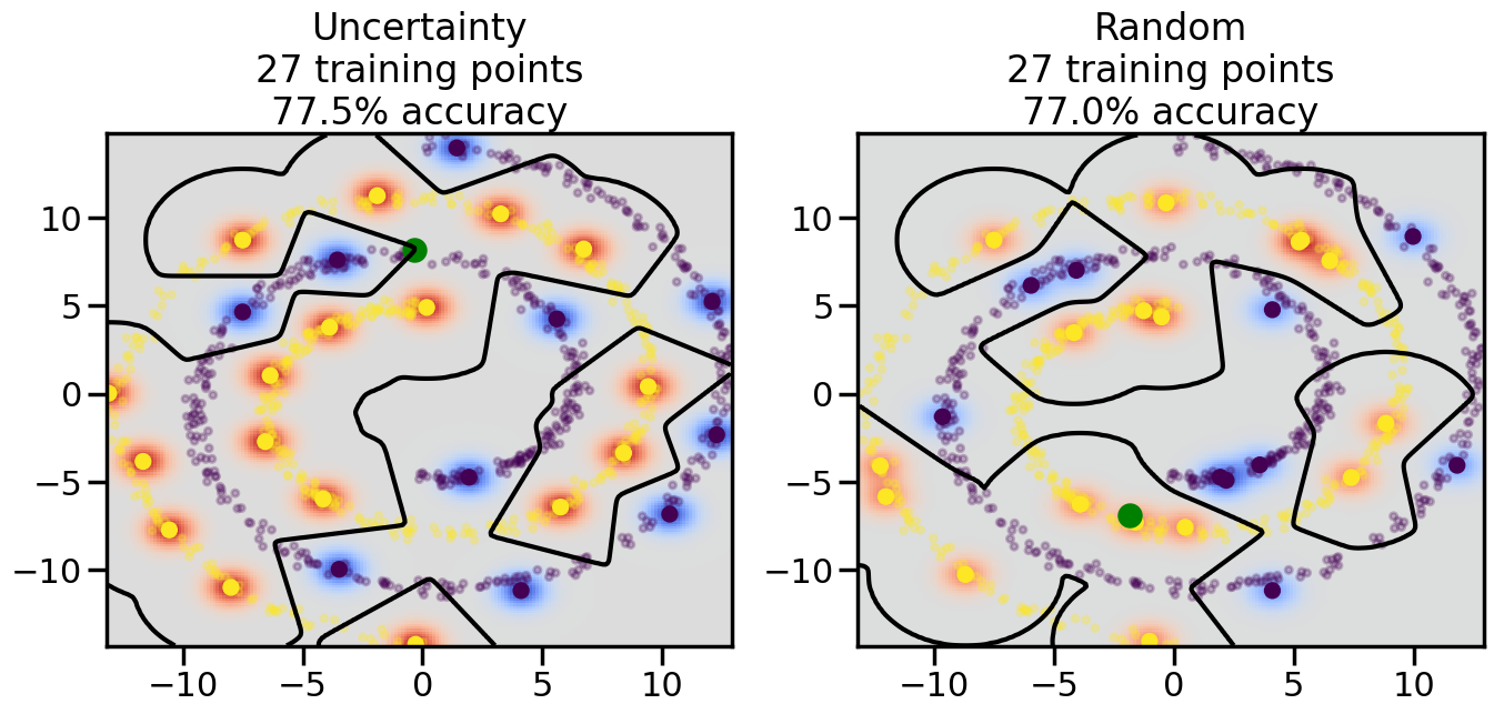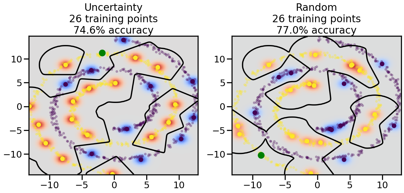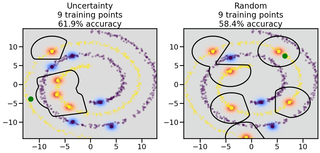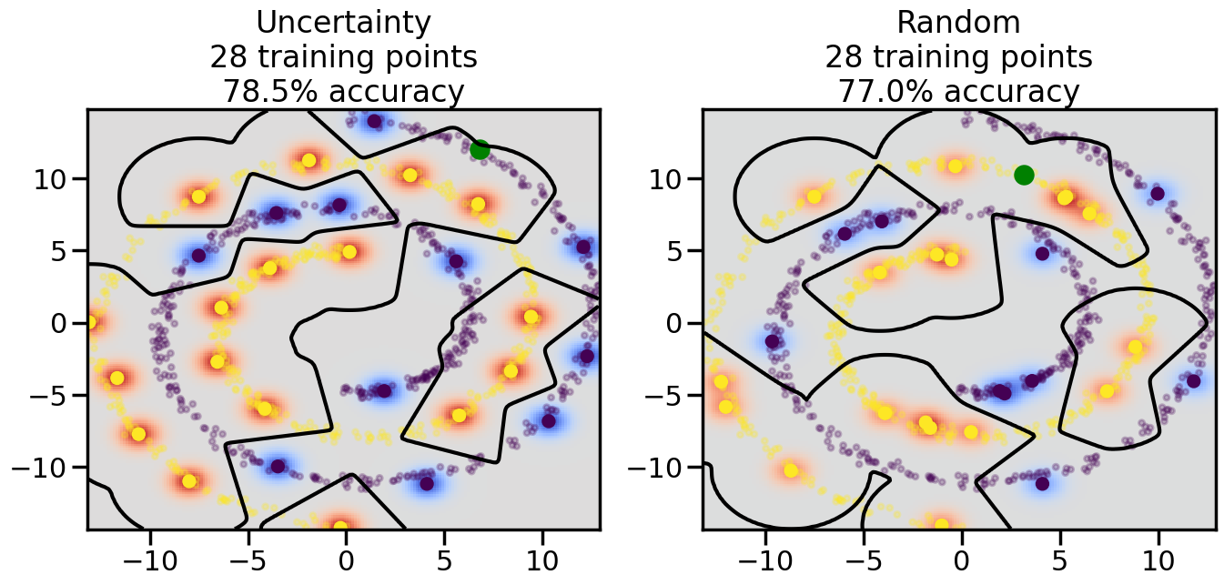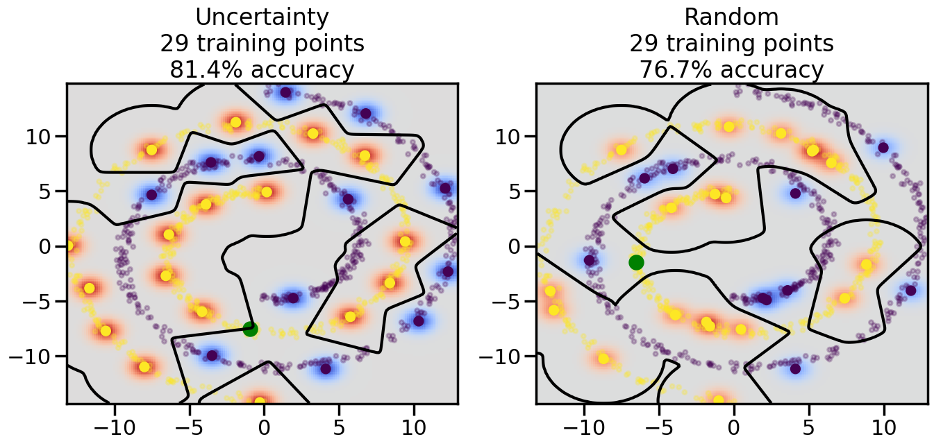 # ------- Try changing the below -------gamma =0.7# e.g. between 0.1 and 5# --------------------------------------#np.random.seed(3)# Now, ready to begin learning:train_ind ={'Uncertainty': np.zeros(len(X),dtype=bool),'Random':np.zeros(len(X),dtype=bool)}options = train_ind.keys()possible_points = np.array(list(range(len(X))))# Initialization options# 1. Select different points randomlyfor i inrange(3): ind = np.random.choice(possible_points[y==i%2])for o in options: train_ind[o][ind] =True# Trying different classifiers#clf = svm.SVC(kernel='rbf',gamma=gamma)clf = GaussianProcessClassifier(1.0* RBF(length_scale=gamma),optimizer=None)# How much data should we collect?num_total_samples =50# Let's store the errors for the models:errors = {'Uncertainty':np.zeros(num_total_samples),'Random':np.zeros(num_total_samples)}for i inrange(num_total_samples):# As i increases, we increase the number of points plt.figure(figsize=(16,6))for j,o inenumerate(options): plt.subplot(1,2,j+1) # Get data on original model (before we select next point) n_train = np.count_nonzero(train_ind[o]) clf.fit(X[train_ind[o],:],y[train_ind[o]]) accuracy = clf.score(X[~train_ind[o],:],y[~train_ind[o]])# Plot the decision function x_min = X[:, 0].min() x_max = X[:, 0].max() y_min = X[:, 1].min() y_max = X[:, 1].max() XX, YY = np.mgrid[x_min:x_max:200j, y_min:y_max:200j]#Z = clf.decision_function(np.c_[XX.ravel(), YY.ravel()]) Z = clf.predict_proba(np.c_[XX.ravel(), YY.ravel()])[:,1] -0.5# Put the result into a color plot Z = Z.reshape(XX.shape) plt.pcolormesh(XX, YY, Z, cmap=plt.get_cmap('coolwarm'),shading='auto') plt.contour(XX, YY, Z, colors=['k', 'k', 'k'], linestyles=['--', '-', '--'], levels=[-.5, 0, .5])# Plot the training points plt.scatter(X[:,0],X[:,1],c=y,s=20,alpha=0.25) plt.scatter(X[train_ind[o],0],X[train_ind[o],1], c=y[train_ind[o]],s=100,lw=1)#clf.fit(X[train_ind[o],:],y[train_ind[o]])#yp,MSE = clf.predict(X[~train_ind[o],:])# Calculate distance to decision boundary# (We're less certain at the boundary)#dists = clf.decision_function(X[~train_ind[o],:]) dists = clf.predict_proba(X[~train_ind[o],:])[:,1] -0.5 dists = np.abs(dists) # Want absolute distance from boundaryif o =='Uncertainty':# Basic Uncertainty sampling# Compute closest points and then pick randomly among# the closet points closest_points = np.argwhere(dists == np.amin(dists)).ravel() ind = np.random.choice(closest_points) next_point = X[~train_ind[o],:][ind,:].flatten() next_ind = np.argwhere(X == next_point.flatten())[0,0]elif o =='Random': next_ind = np.random.choice(possible_points[~train_ind[o]],1)elif o =='Density':# Multiply distances by similarity score# TBDpasselse:raise Error train_ind[o][next_ind] =True# Plot the selected point in green plt.scatter(X[next_ind,0],X[next_ind,1],c='g',s=200) errors[o][i]=accuracy plt.title("%s\n%d training points\n%.1f%% accuracy"%(o,n_train,accuracy*100)) plt.show()