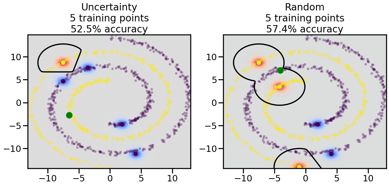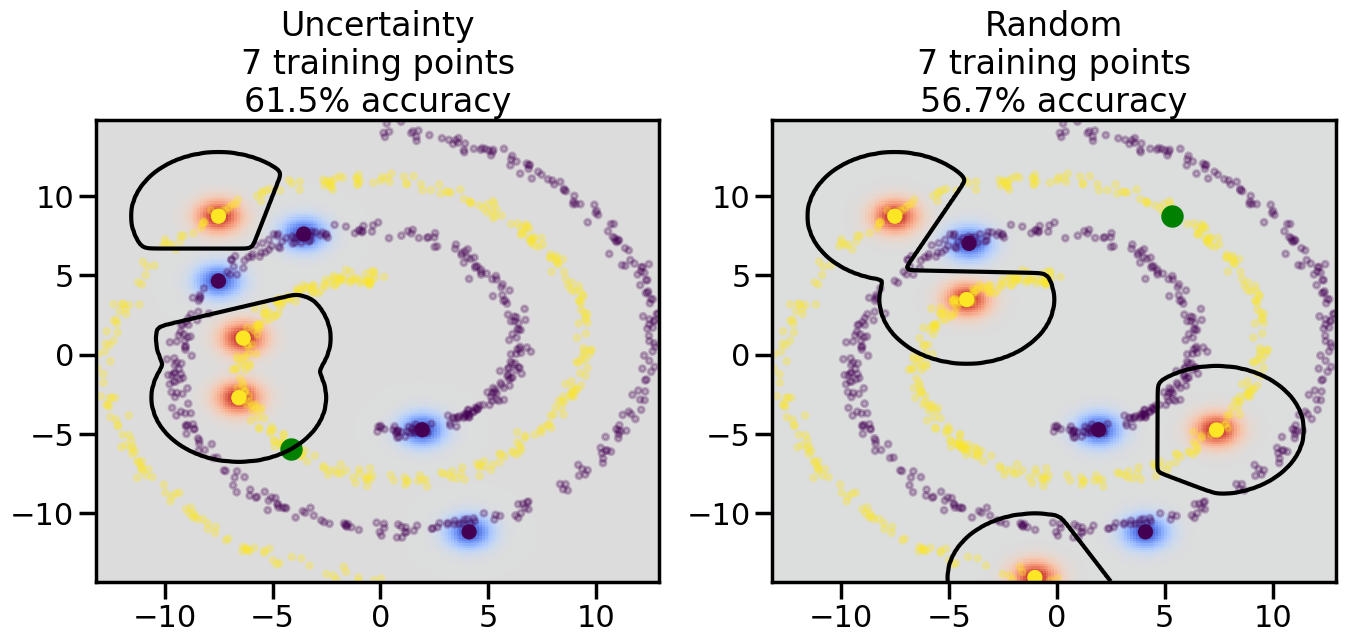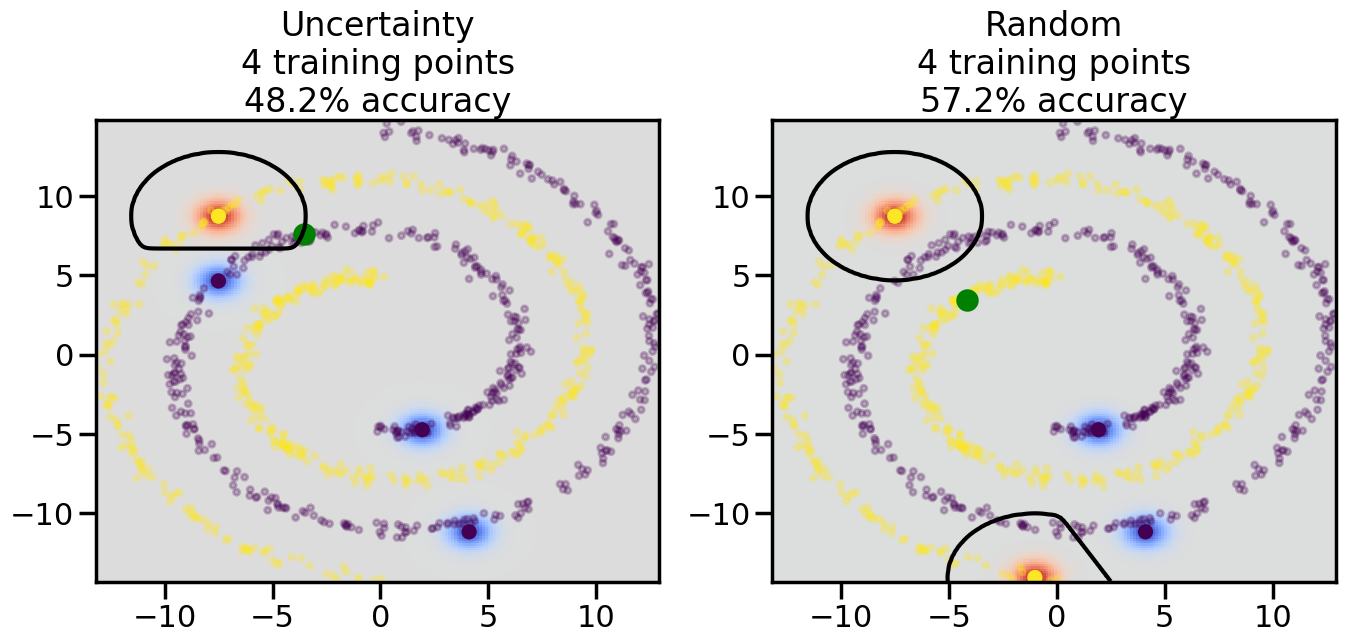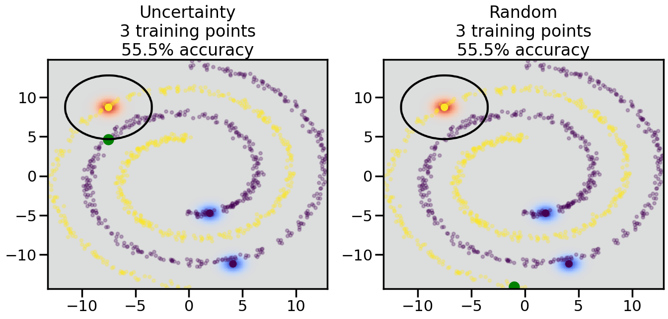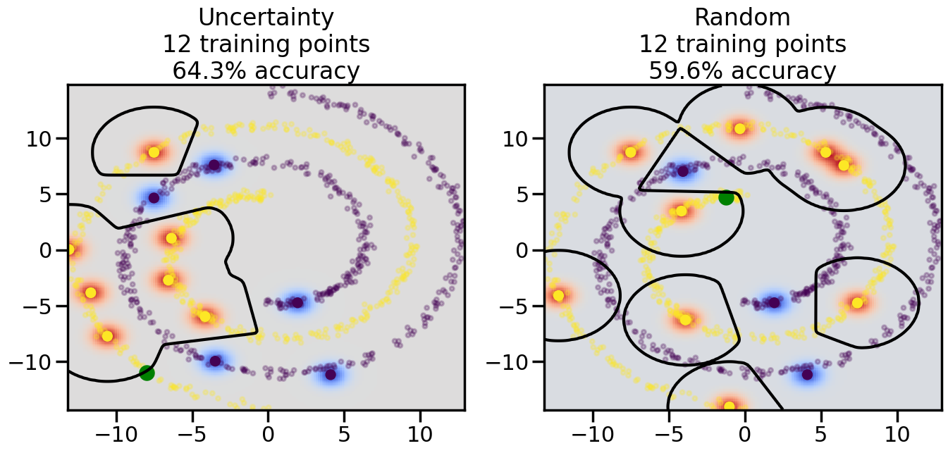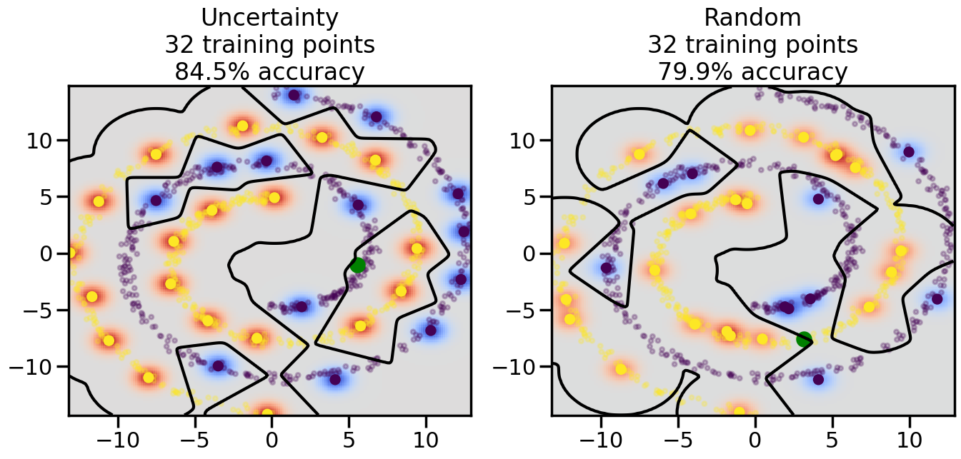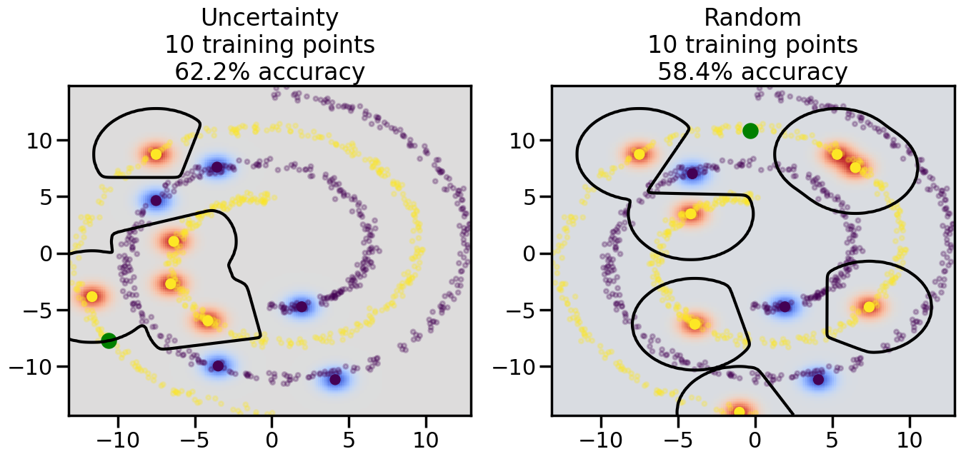 # ------- Try changing the below -------gamma =0.7# e.g. between 0.1 and 5# --------------------------------------#np.random.seed(3)# Now, ready to begin learning:train_ind ={'Uncertainty': np.zeros(len(X),dtype=bool),'Random':np.zeros(len(X),dtype=bool)}options = train_ind.keys()possible_points = np.array(list(range(len(X))))# Initialization options# 1. Select different points randomlyfor i inrange(3): ind = np.random.choice(possible_points[y==i%2])for o in options: train_ind[o][ind] =True# Trying different classifiers#clf = svm.SVC(kernel='rbf',gamma=gamma)clf = GaussianProcessClassifier(1.0* RBF(length_scale=gamma),optimizer=None)# How much data should we collect?num_total_samples =50# Let's store the errors for the models:errors = {'Uncertainty':np.zeros(num_total_samples),'Random':np.zeros(num_total_samples)}for i inrange(num_total_samples):# As i increases, we increase the number of points plt.figure(figsize=(16,6))for j,o inenumerate(options): plt.subplot(1,2,j+1) # Get data on original model (before we select next point) n_train = np.count_nonzero(train_ind[o]) clf.fit(X[train_ind[o],:],y[train_ind[o]]) accuracy = clf.score(X[~train_ind[o],:],y[~train_ind[o]])# Plot the decision function x_min = X[:, 0].min() x_max = X[:, 0].max() y_min = X[:, 1].min() y_max = X[:, 1].max() XX, YY = np.mgrid[x_min:x_max:200j, y_min:y_max:200j]#Z = clf.decision_function(np.c_[XX.ravel(), YY.ravel()]) Z = clf.predict_proba(np.c_[XX.ravel(), YY.ravel()])[:,1] -0.5# Put the result into a color plot Z = Z.reshape(XX.shape) plt.pcolormesh(XX, YY, Z, cmap=plt.get_cmap('coolwarm'),shading='auto') plt.contour(XX, YY, Z, colors=['k', 'k', 'k'], linestyles=['--', '-', '--'], levels=[-.5, 0, .5])# Plot the training points plt.scatter(X[:,0],X[:,1],c=y,s=20,alpha=0.25) plt.scatter(X[train_ind[o],0],X[train_ind[o],1], c=y[train_ind[o]],s=100,lw=1)#clf.fit(X[train_ind[o],:],y[train_ind[o]])#yp,MSE = clf.predict(X[~train_ind[o],:])# Calculate distance to decision boundary# (We're less certain at the boundary)#dists = clf.decision_function(X[~train_ind[o],:]) dists = clf.predict_proba(X[~train_ind[o],:])[:,1] -0.5 dists = np.abs(dists) # Want absolute distance from boundaryif o =='Uncertainty':# Basic Uncertainty sampling# Compute closest points and then pick randomly among# the closet points closest_points = np.argwhere(dists == np.amin(dists)).ravel() ind = np.random.choice(closest_points) next_point = X[~train_ind[o],:][ind,:].flatten() next_ind = np.argwhere(X == next_point.flatten())[0,0]elif o =='Random': next_ind = np.random.choice(possible_points[~train_ind[o]],1)elif o =='Density':# Multiply distances by similarity score# TBDpasselse:raise Error train_ind[o][next_ind] =True# Plot the selected point in green plt.scatter(X[next_ind,0],X[next_ind,1],c='g',s=200) errors[o][i]=accuracy plt.title("%s\n%d training points\n%.1f%% accuracy"%(o,n_train,accuracy*100)) plt.show()
