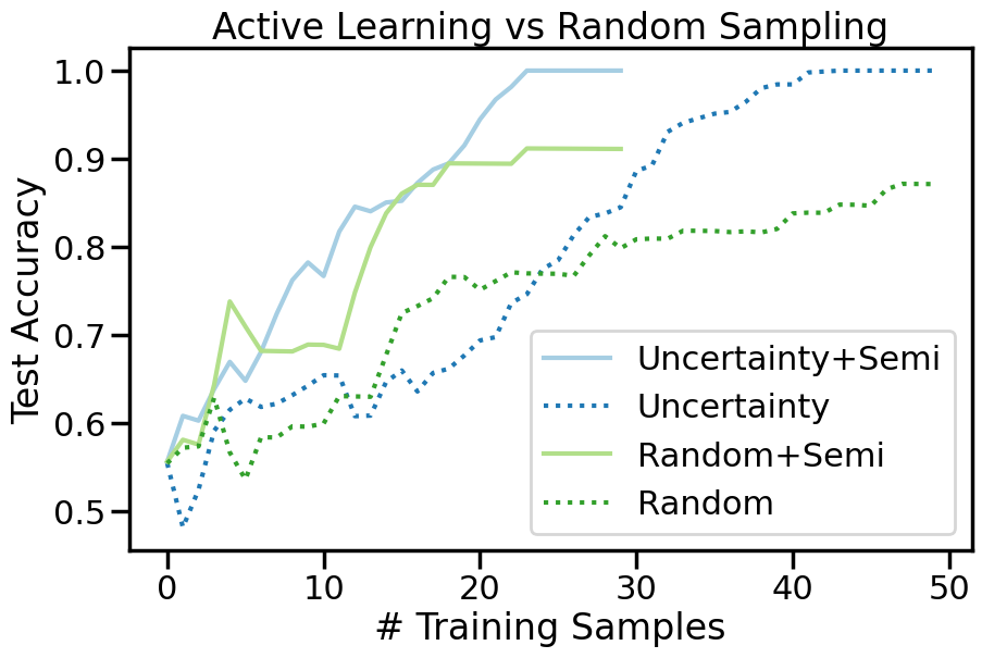 Now we can re-run our above Active Learning experiments, but this time we can also include Label Spreading to “extend the reach” of the samples we collect. Let’s take a look at how incorporating both Active Learning and Semi-Supervised Learning can improve our classification performance compared to using either method alone or neither method at all.