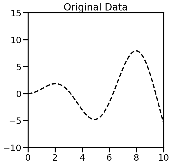 import numpy as npimport matplotlib.pyplot as pltimport seaborn as snssns.set_context('poster')from sklearn.gaussian_process import GaussianProcessRegressor, GaussianProcessClassifierfrom sklearn.gaussian_process.kernels import RBF, WhiteKernel, RationalQuadratic, ExpSineSquared, Maternfrom sklearn.semi_supervised import LabelSpreadingnp.random.seed(0) # Set random seed so that we see the same thing# Define a function to generate samples# Feel free to add your own or change thingsdef f(x):"""The function to predict."""return x * np.sin(x)# Try others!#return 5 * np.sinc(x)#return x# This generates points we will pick from during the active learningX = np.atleast_2d(np.linspace(0, 10, 200)).T# Observations at each of the possible points# (We will only observe a subset of these)y = f(X).ravel()# Generate points for plotting the predicted functionx = np.atleast_2d(np.linspace(0, 10, 1000)).Tplt.figure(figsize=(6,6))# Plot the original functionplt.plot(x,f(x),'k--',alpha=1)plt.ylim([-10,15]) # Set the y-axis limitsplt.xlim([0,10]) # Set the x-axis limitsplt.title("Original Data")plt.show()
