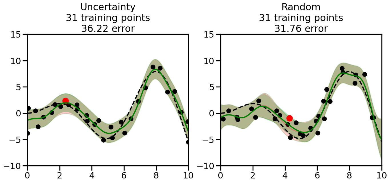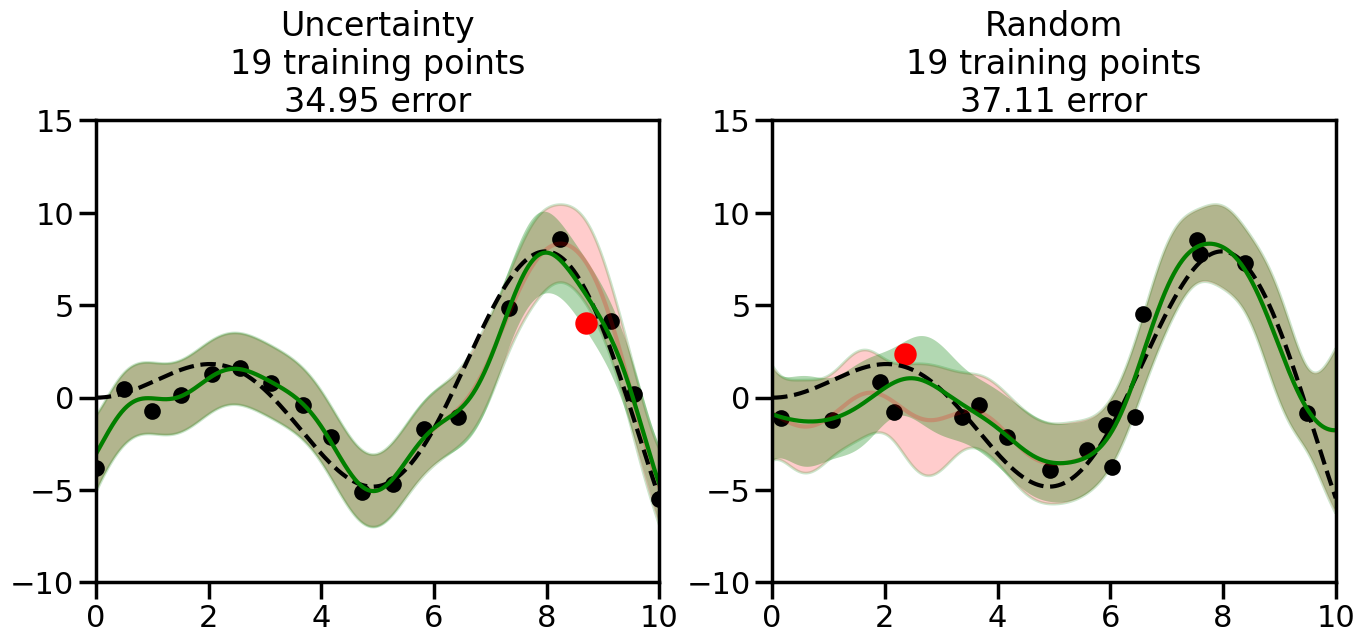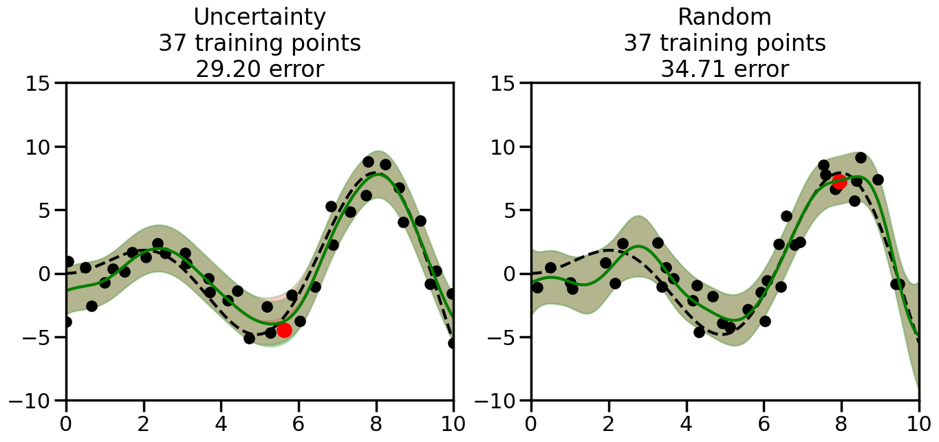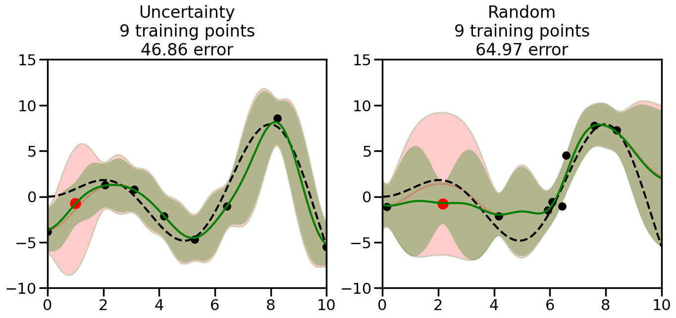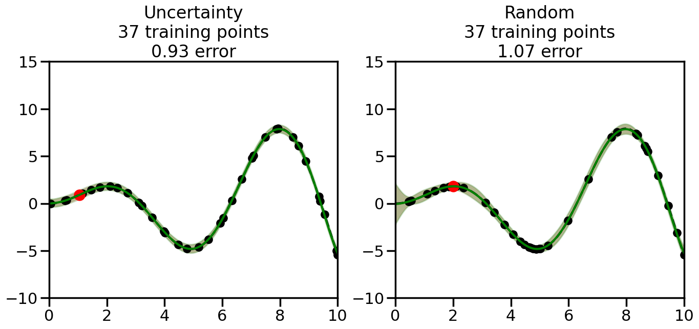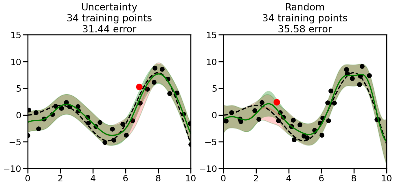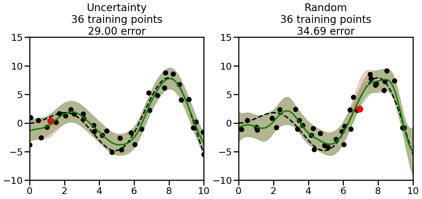 # Create the Gaussian Process model# We can start with a basic RBF kernelkernel = RBF(length_scale=1) #+ WhiteKernel(noise_level=0.01)# You can also experiment with adding noise to the kernel to see how this affects the sampling# kernel = RBF(length_scale=1) + WhiteKernel(noise_level=0.01)gp = GaussianProcessRegressor(kernel=kernel, alpha=0.01, optimizer=None, normalize_y=True, random_state=1)def sample_data_points(X, y, gp, num_points=35):"""Compare Uncertainty Sampling vs Random Sampling for Active Learning."""# Now, we are ready to begin learning!# We will have two different models that we'll test out:# 1) Uncertainty Sampling: Pick points where we are most uncertain# 2) Random Sampling: Pick points randomly# train_ind holds the indices of what training samples we'll use train_ind ={'Uncertainty': np.zeros(len(X),dtype=bool),'Random': np.zeros(len(X),dtype=bool) } options = train_ind.keys()# We can now initialize the first few training points. possible_points = np.array(list(range(len(X))))# Possible Initialization options# 1. Start with the same two randomly selected pointsfor ind in np.random.choice(possible_points,2):for o in options: train_ind[o][ind] =True# Or# 2. Start with end-points#for o in options:# train_ind[o][0] = True# train_ind[o][-1] = True# How much data should we collect? num_total_samples =35# Let's store the errors for the models: errors = {'Uncertainty':np.zeros(num_total_samples),'Random':np.zeros(num_total_samples)}# Let's select an increasing number of new points to try:for i inrange(num_total_samples):# As i increases, we increase the number of points plt.figure(figsize=(16,6))for j,o inenumerate(options): # For each sampling option plt.subplot(1,2,j+1) # Create different subplot# Fit the original GP Model (without the new point): gp.fit(X[train_ind[o],:],y[train_ind[o]])# Plot the original model's bounds (just for comparison sake) yp,sigma = gp.predict(x, return_std=True) plt.fill(np.concatenate([x, x[::-1]]), np.concatenate([yp -1.9600* sigma, (yp +1.9600* sigma)[::-1]]),'r', alpha=0.2, ec='g', label='95% confidence interval')# Plot the predicted function plt.plot(x,yp,'r-',alpha=0.2)######## Now do the Active Learning part####### # Here is Uncertainty Sampling:if o =='Uncertainty':# First, we need to predict the MSE (uncertainty) at# each of the non-training points: yp,sigma = gp.predict(X[~train_ind[o],:], return_std=True)# The points that we'll choose from are the points that have the# maximum mean square error in the GP (highest uncertainty) candidates = np.extract(sigma == np.amax(sigma),X[~train_ind[o],:])# Side note:# If you wanted to turn Uncertainty Sampling into Global Bayesian# Optimization instead, then uncomment the below two lines, which implements# Upper Confidence Bound (UCB) sampling:# ucb = yp + 1.96*sigma# candidates = np.extract(ucb == np.amax(ucb),X[~train_ind[o],:])# Choose the next sampling point randomly from the max candidates# (It is unlikely that len(candidates)>1, but you never know) next_point = np.random.choice(candidates.flatten())# Find the training sample index corresponding to the next sample next_ind = np.argwhere(X.flatten() == next_point)# Here is Random Sampling:elif o =='Random':# Just pick the point randomly from the points that we # haven't chosen already (i.e., ~train_ind[o]) next_ind = np.random.choice(possible_points[~train_ind[o]],1)# Add the selected point to the training samples train_ind[o][next_ind] =True######## Done with Active Learning part####### # Fit the GP again, this time with the added training point: gp.fit(X[train_ind[o],:],y[train_ind[o]])# Now plot the updated model so we can see the difference: yp,sigma = gp.predict(x, return_std=True)# Draw the 95% Confidence Interval plt.fill(np.concatenate([x, x[::-1]]), np.concatenate([yp -1.9600* sigma, (yp +1.9600* sigma)[::-1]]),'g', alpha=0.3, ec='None', label='95% confidence interval')# Plot the original function plt.plot(x,f(x),'k--',alpha=1)# Plot the predicted function plt.plot(x,yp,'g-',alpha=1)# Plot the original training points plt.scatter(X[train_ind[o],:],y[train_ind[o]],color='k',s=100)# Highlight the point we just added plt.scatter(X[next_ind,:].flatten(),y[next_ind].flatten(),color='r',s=200) plt.ylim([-10,15]) # Set the y-axis limits plt.xlim([0,10]) # Set the x-axis limits# Label the figure title with the number of total training points# and the total error between the predicted and actual curves n_train = np.count_nonzero(train_ind[o]) error = np.linalg.norm(yp-f(x).flatten()) errors[o][i]=error plt.title("%s\n%d training points\n%.2f error"%(o,n_train,error)) plt.show()return errorserrors = sample_data_points(X, y, gp, num_points=35)