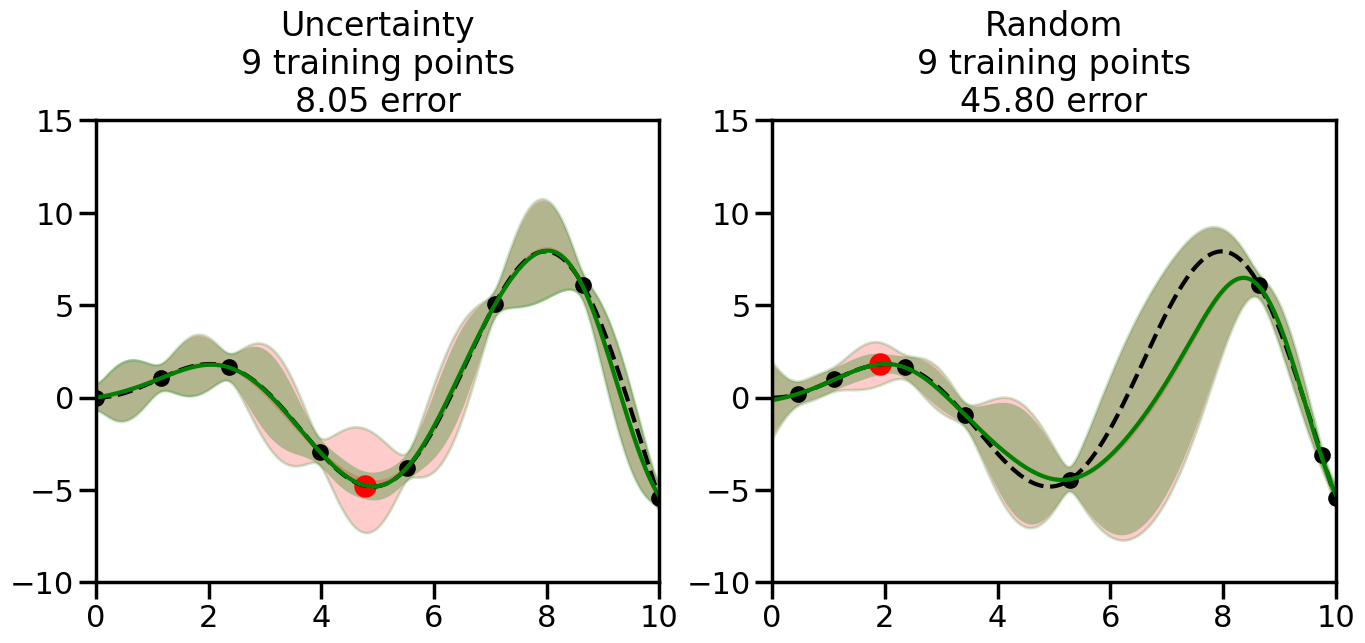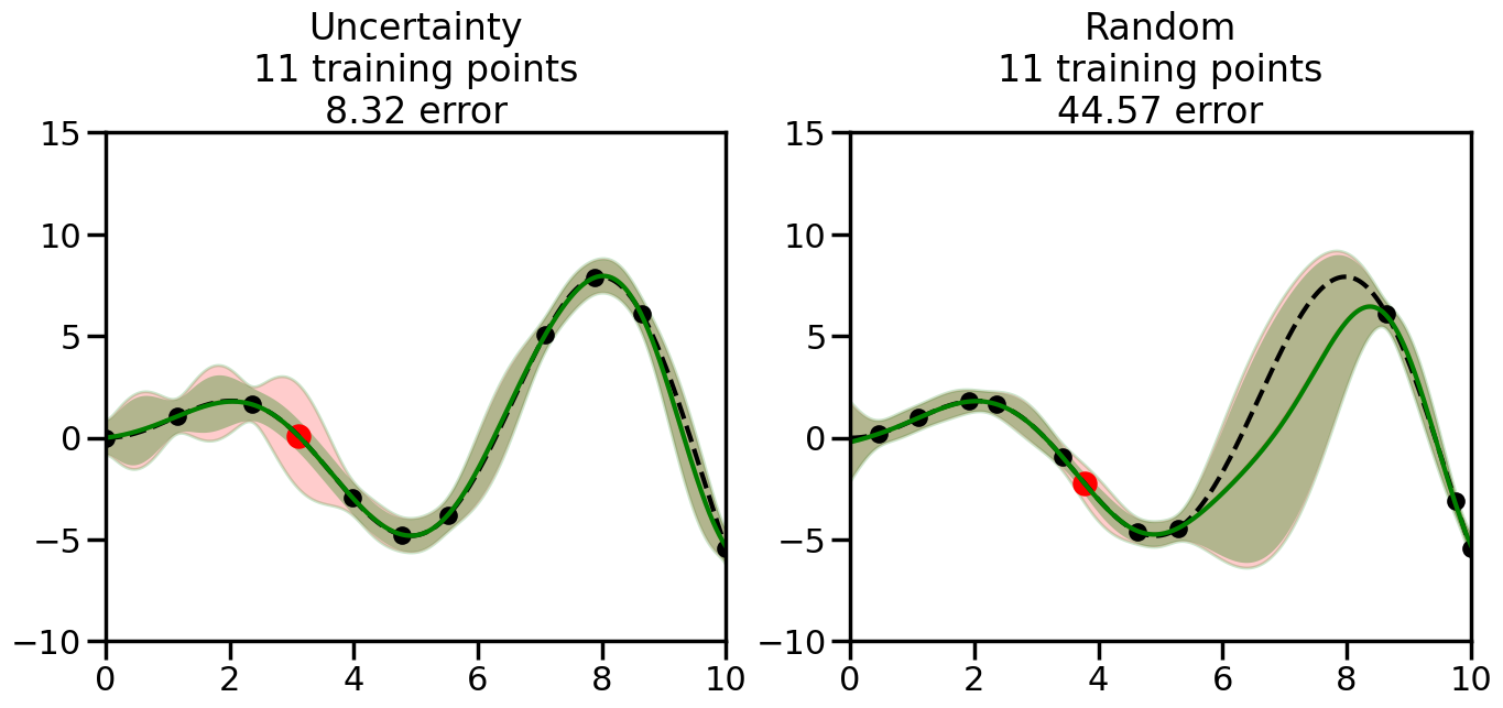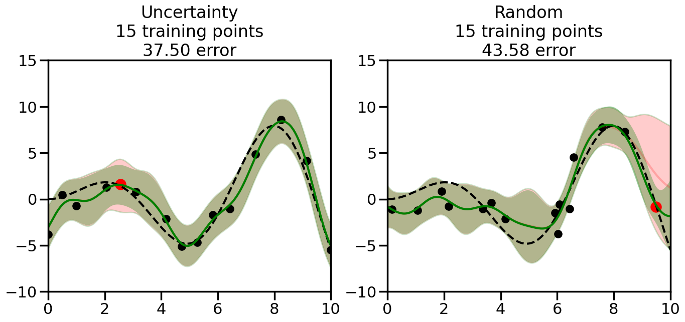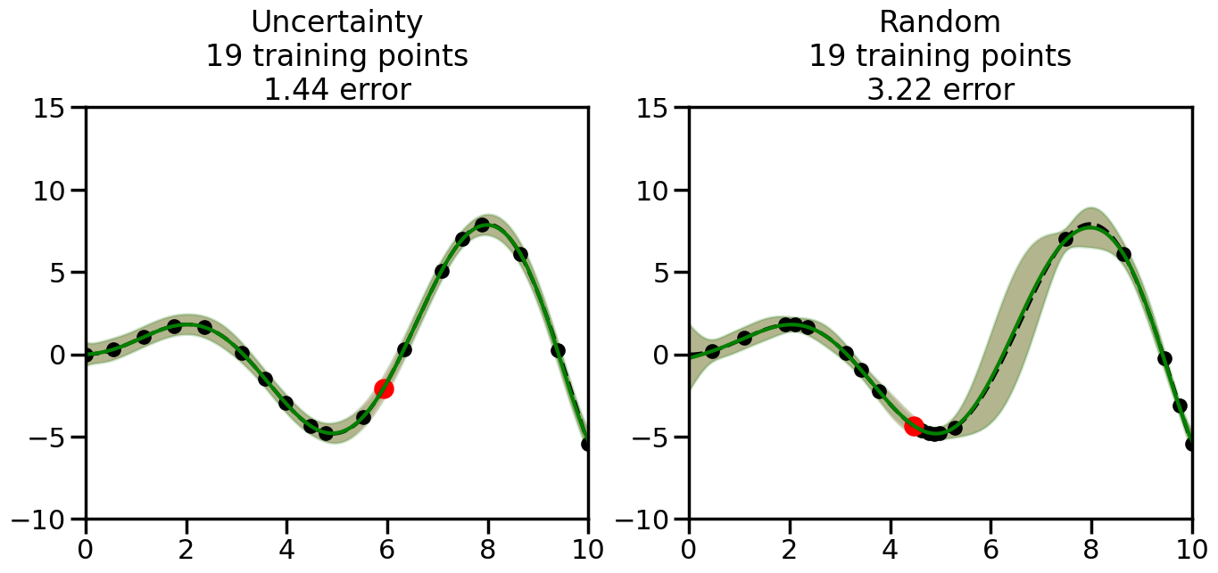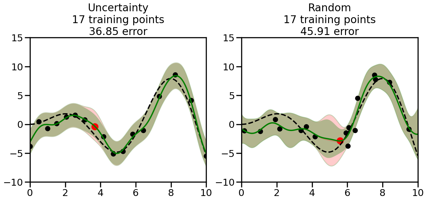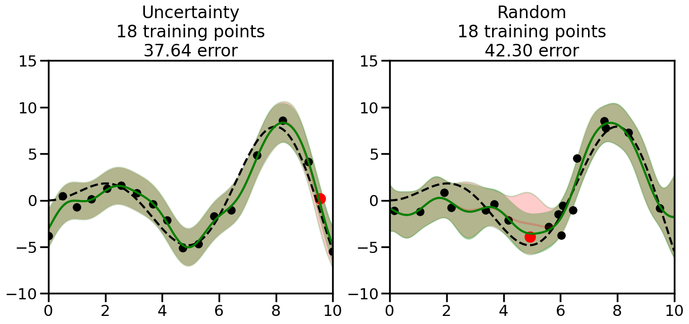 # Create the Gaussian Process model# We can start with a basic RBF kernelkernel = RBF(length_scale=1) #+ WhiteKernel(noise_level=0.01)# You can also experiment with adding noise to the kernel to see how this affects the sampling# kernel = RBF(length_scale=1) + WhiteKernel(noise_level=0.01)gp = GaussianProcessRegressor(kernel=kernel, alpha=0.01, optimizer=None, normalize_y=True, random_state=1)def sample_data_points(X, y, gp, num_points=35):"""Compare Uncertainty Sampling vs Random Sampling for Active Learning."""# Now, we are ready to begin learning!# We will have two different models that we'll test out:# 1) Uncertainty Sampling: Pick points where we are most uncertain# 2) Random Sampling: Pick points randomly# train_ind holds the indices of what training samples we'll use train_ind ={'Uncertainty': np.zeros(len(X),dtype=bool),'Random': np.zeros(len(X),dtype=bool) } options = train_ind.keys()# We can now initialize the first few training points. possible_points = np.array(list(range(len(X))))# Possible Initialization options# 1. Start with the same two randomly selected pointsfor ind in np.random.choice(possible_points,2):for o in options: train_ind[o][ind] =True# Or# 2. Start with end-points#for o in options:# train_ind[o][0] = True# train_ind[o][-1] = True# How much data should we collect? num_total_samples =35# Let's store the errors for the models: errors = {'Uncertainty':np.zeros(num_total_samples),'Random':np.zeros(num_total_samples)}# Let's select an increasing number of new points to try:for i inrange(num_total_samples):# As i increases, we increase the number of points plt.figure(figsize=(16,6))for j,o inenumerate(options): # For each sampling option plt.subplot(1,2,j+1) # Create different subplot# Fit the original GP Model (without the new point): gp.fit(X[train_ind[o],:],y[train_ind[o]])# Plot the original model's bounds (just for comparison sake) yp,sigma = gp.predict(x, return_std=True) plt.fill(np.concatenate([x, x[::-1]]), np.concatenate([yp -1.9600* sigma, (yp +1.9600* sigma)[::-1]]),'r', alpha=0.2, ec='g', label='95% confidence interval')# Plot the predicted function plt.plot(x,yp,'r-',alpha=0.2)######## Now do the Active Learning part####### # Here is Uncertainty Sampling:if o =='Uncertainty':# First, we need to predict the MSE (uncertainty) at# each of the non-training points: yp,sigma = gp.predict(X[~train_ind[o],:], return_std=True)# The points that we'll choose from are the points that have the# maximum mean square error in the GP (highest uncertainty) candidates = np.extract(sigma == np.amax(sigma),X[~train_ind[o],:])# Side note:# If you wanted to turn Uncertainty Sampling into Global Bayesian# Optimization instead, then uncomment the below two lines, which implements# Upper Confidence Bound (UCB) sampling:# ucb = yp + 1.96*sigma# candidates = np.extract(ucb == np.amax(ucb),X[~train_ind[o],:])# Choose the next sampling point randomly from the max candidates# (It is unlikely that len(candidates)>1, but you never know) next_point = np.random.choice(candidates.flatten())# Find the training sample index corresponding to the next sample next_ind = np.argwhere(X.flatten() == next_point)# Here is Random Sampling:elif o =='Random':# Just pick the point randomly from the points that we # haven't chosen already (i.e., ~train_ind[o]) next_ind = np.random.choice(possible_points[~train_ind[o]],1)# Add the selected point to the training samples train_ind[o][next_ind] =True######## Done with Active Learning part####### # Fit the GP again, this time with the added training point: gp.fit(X[train_ind[o],:],y[train_ind[o]])# Now plot the updated model so we can see the difference: yp,sigma = gp.predict(x, return_std=True)# Draw the 95% Confidence Interval plt.fill(np.concatenate([x, x[::-1]]), np.concatenate([yp -1.9600* sigma, (yp +1.9600* sigma)[::-1]]),'g', alpha=0.3, ec='None', label='95% confidence interval')# Plot the original function plt.plot(x,f(x),'k--',alpha=1)# Plot the predicted function plt.plot(x,yp,'g-',alpha=1)# Plot the original training points plt.scatter(X[train_ind[o],:],y[train_ind[o]],color='k',s=100)# Highlight the point we just added plt.scatter(X[next_ind,:].flatten(),y[next_ind].flatten(),color='r',s=200) plt.ylim([-10,15]) # Set the y-axis limits plt.xlim([0,10]) # Set the x-axis limits# Label the figure title with the number of total training points# and the total error between the predicted and actual curves n_train = np.count_nonzero(train_ind[o]) error = np.linalg.norm(yp-f(x).flatten()) errors[o][i]=error plt.title("%s\n%d training points\n%.2f error"%(o,n_train,error)) plt.show()return errorserrors = sample_data_points(X, y, gp, num_points=35)