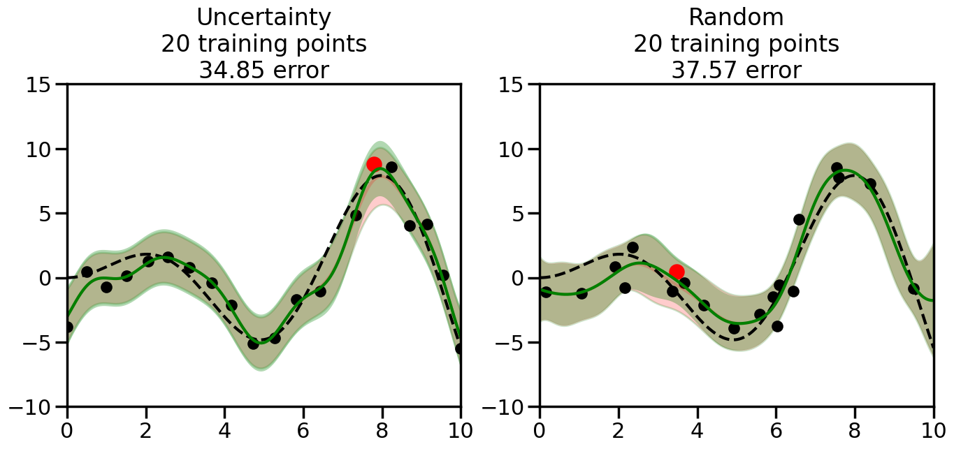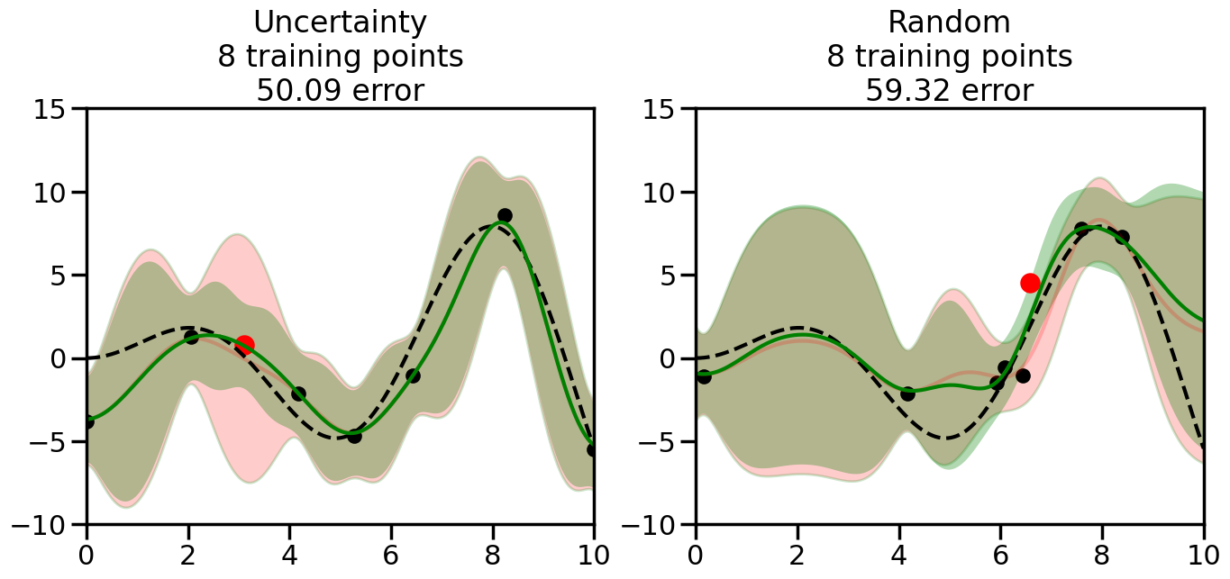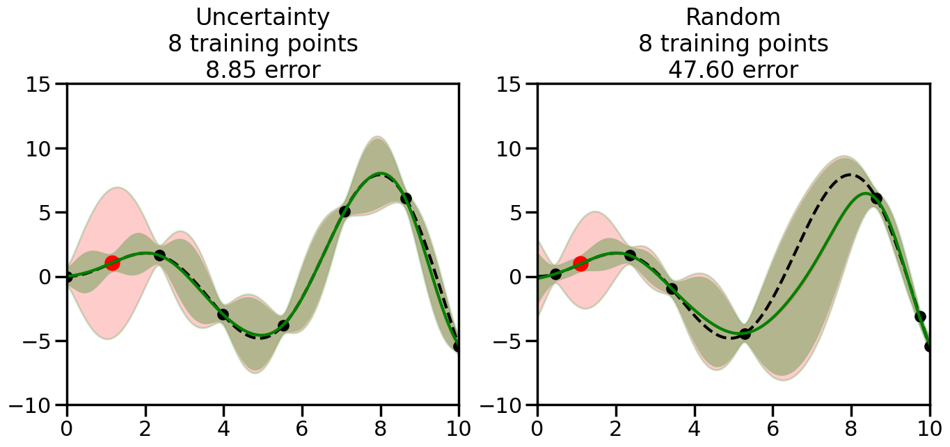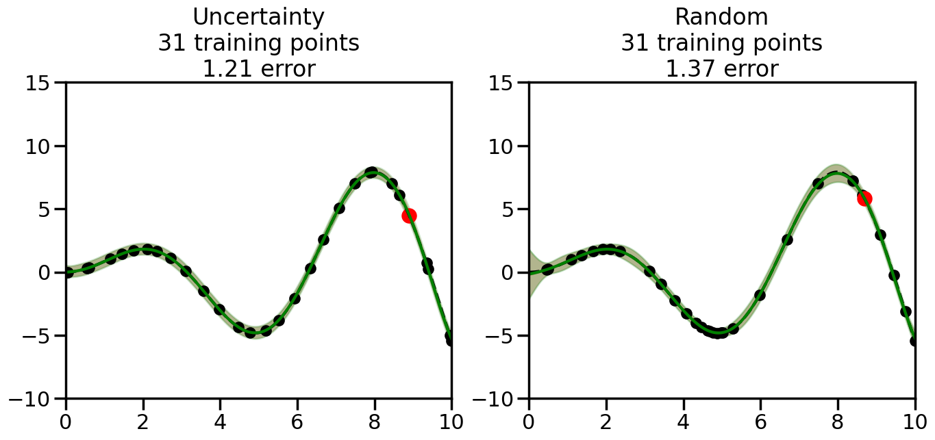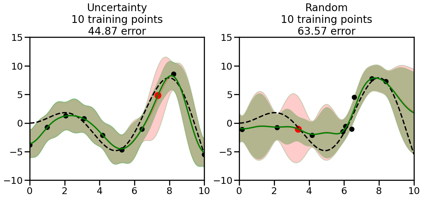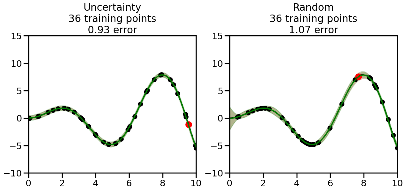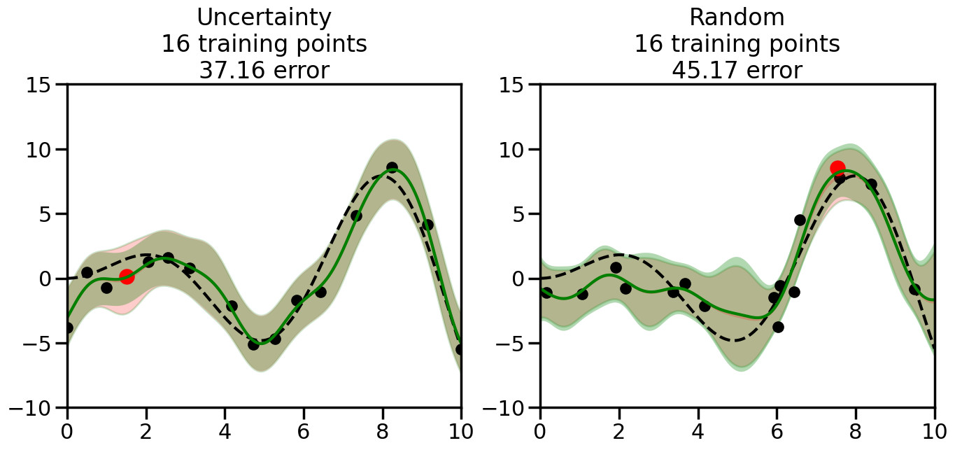 # Create the Gaussian Process model# We can start with a basic RBF kernelkernel = RBF(length_scale=1) #+ WhiteKernel(noise_level=0.01)# You can also experiment with adding noise to the kernel to see how this affects the sampling# kernel = RBF(length_scale=1) + WhiteKernel(noise_level=0.01)gp = GaussianProcessRegressor(kernel=kernel, alpha=0.01, optimizer=None, normalize_y=True, random_state=1)def sample_data_points(X, y, gp, num_points=35):"""Compare Uncertainty Sampling vs Random Sampling for Active Learning."""# Now, we are ready to begin learning!# We will have two different models that we'll test out:# 1) Uncertainty Sampling: Pick points where we are most uncertain# 2) Random Sampling: Pick points randomly# train_ind holds the indices of what training samples we'll use train_ind ={'Uncertainty': np.zeros(len(X),dtype=bool),'Random': np.zeros(len(X),dtype=bool) } options = train_ind.keys()# We can now initialize the first few training points. possible_points = np.array(list(range(len(X))))# Possible Initialization options# 1. Start with the same two randomly selected pointsfor ind in np.random.choice(possible_points,2):for o in options: train_ind[o][ind] =True# Or# 2. Start with end-points#for o in options:# train_ind[o][0] = True# train_ind[o][-1] = True# How much data should we collect? num_total_samples =35# Let's store the errors for the models: errors = {'Uncertainty':np.zeros(num_total_samples),'Random':np.zeros(num_total_samples)}# Let's select an increasing number of new points to try:for i inrange(num_total_samples):# As i increases, we increase the number of points plt.figure(figsize=(16,6))for j,o inenumerate(options): # For each sampling option plt.subplot(1,2,j+1) # Create different subplot# Fit the original GP Model (without the new point): gp.fit(X[train_ind[o],:],y[train_ind[o]])# Plot the original model's bounds (just for comparison sake) yp,sigma = gp.predict(x, return_std=True) plt.fill(np.concatenate([x, x[::-1]]), np.concatenate([yp -1.9600* sigma, (yp +1.9600* sigma)[::-1]]),'r', alpha=0.2, ec='g', label='95% confidence interval')# Plot the predicted function plt.plot(x,yp,'r-',alpha=0.2)######## Now do the Active Learning part####### # Here is Uncertainty Sampling:if o =='Uncertainty':# First, we need to predict the MSE (uncertainty) at# each of the non-training points: yp,sigma = gp.predict(X[~train_ind[o],:], return_std=True)# The points that we'll choose from are the points that have the# maximum mean square error in the GP (highest uncertainty) candidates = np.extract(sigma == np.amax(sigma),X[~train_ind[o],:])# Side note:# If you wanted to turn Uncertainty Sampling into Global Bayesian# Optimization instead, then uncomment the below two lines, which implements# Upper Confidence Bound (UCB) sampling:# ucb = yp + 1.96*sigma# candidates = np.extract(ucb == np.amax(ucb),X[~train_ind[o],:])# Choose the next sampling point randomly from the max candidates# (It is unlikely that len(candidates)>1, but you never know) next_point = np.random.choice(candidates.flatten())# Find the training sample index corresponding to the next sample next_ind = np.argwhere(X.flatten() == next_point)# Here is Random Sampling:elif o =='Random':# Just pick the point randomly from the points that we # haven't chosen already (i.e., ~train_ind[o]) next_ind = np.random.choice(possible_points[~train_ind[o]],1)# Add the selected point to the training samples train_ind[o][next_ind] =True######## Done with Active Learning part####### # Fit the GP again, this time with the added training point: gp.fit(X[train_ind[o],:],y[train_ind[o]])# Now plot the updated model so we can see the difference: yp,sigma = gp.predict(x, return_std=True)# Draw the 95% Confidence Interval plt.fill(np.concatenate([x, x[::-1]]), np.concatenate([yp -1.9600* sigma, (yp +1.9600* sigma)[::-1]]),'g', alpha=0.3, ec='None', label='95% confidence interval')# Plot the original function plt.plot(x,f(x),'k--',alpha=1)# Plot the predicted function plt.plot(x,yp,'g-',alpha=1)# Plot the original training points plt.scatter(X[train_ind[o],:],y[train_ind[o]],color='k',s=100)# Highlight the point we just added plt.scatter(X[next_ind,:].flatten(),y[next_ind].flatten(),color='r',s=200) plt.ylim([-10,15]) # Set the y-axis limits plt.xlim([0,10]) # Set the x-axis limits# Label the figure title with the number of total training points# and the total error between the predicted and actual curves n_train = np.count_nonzero(train_ind[o]) error = np.linalg.norm(yp-f(x).flatten()) errors[o][i]=error plt.title("%s\n%d training points\n%.2f error"%(o,n_train,error)) plt.show()return errorserrors = sample_data_points(X, y, gp, num_points=35)