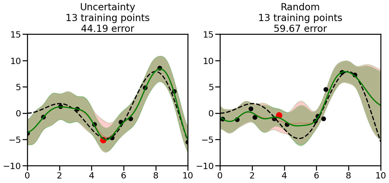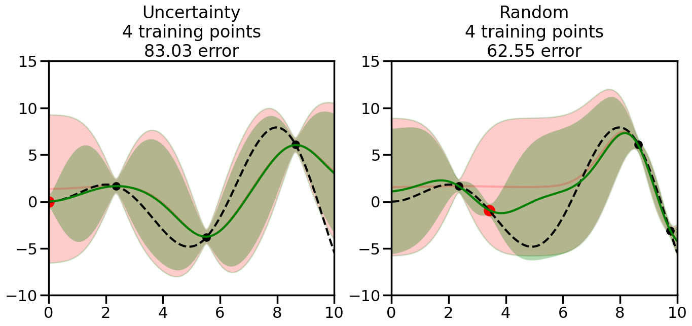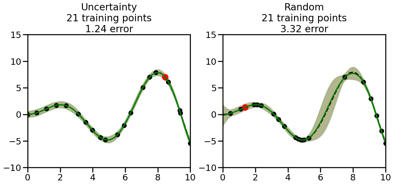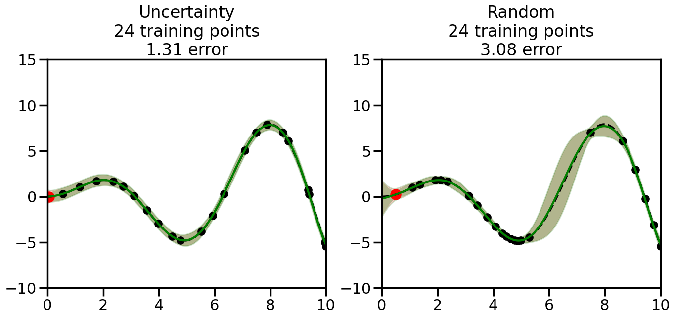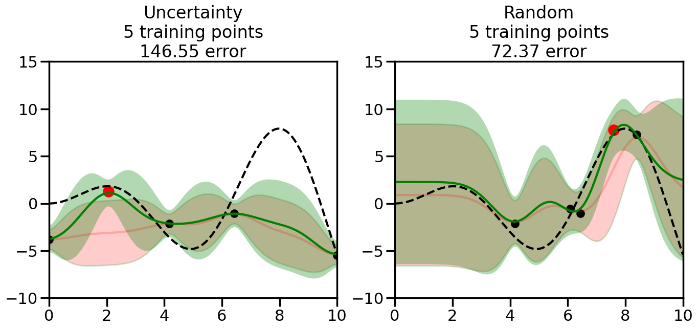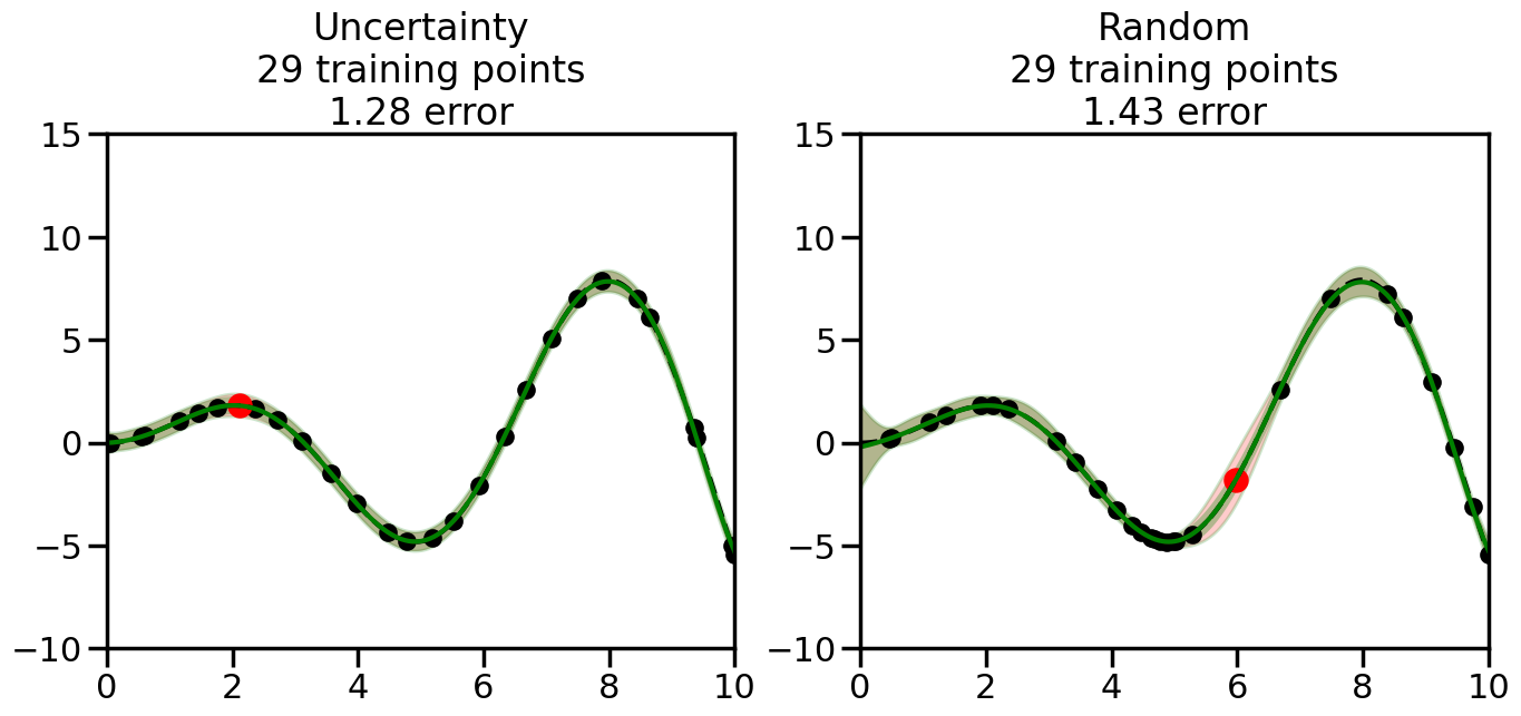# Create the Gaussian Process model# We can start with a basic RBF kernelkernel = RBF(length_scale=1) #+ WhiteKernel(noise_level=0.01)# You can also experiment with adding noise to the kernel to see how this affects the sampling# kernel = RBF(length_scale=1) + WhiteKernel(noise_level=0.01)gp = GaussianProcessRegressor(kernel=kernel, alpha=0.01, optimizer=None, normalize_y=True, random_state=1)def sample_data_points(X, y, gp, num_points=35):"""Compare Uncertainty Sampling vs Random Sampling for Active Learning."""# Now, we are ready to begin learning!# We will have two different models that we'll test out:# 1) Uncertainty Sampling: Pick points where we are most uncertain# 2) Random Sampling: Pick points randomly# train_ind holds the indices of what training samples we'll use train_ind ={'Uncertainty': np.zeros(len(X),dtype=bool),'Random': np.zeros(len(X),dtype=bool) } options = train_ind.keys()# We can now initialize the first few training points. possible_points = np.array(list(range(len(X))))# Possible Initialization options# 1. Start with the same two randomly selected pointsfor ind in np.random.choice(possible_points,2):for o in options: train_ind[o][ind] =True# Or# 2. Start with end-points#for o in options:# train_ind[o][0] = True# train_ind[o][-1] = True# How much data should we collect? num_total_samples =35# Let's store the errors for the models: errors = {'Uncertainty':np.zeros(num_total_samples),'Random':np.zeros(num_total_samples)}# Let's select an increasing number of new points to try:for i inrange(num_total_samples):# As i increases, we increase the number of points plt.figure(figsize=(16,6))for j,o inenumerate(options): # For each sampling option plt.subplot(1,2,j+1) # Create different subplot# Fit the original GP Model (without the new point): gp.fit(X[train_ind[o],:],y[train_ind[o]])# Plot the original model's bounds (just for comparison sake) yp,sigma = gp.predict(x, return_std=True) plt.fill(np.concatenate([x, x[::-1]]), np.concatenate([yp -1.9600* sigma, (yp +1.9600* sigma)[::-1]]),'r', alpha=0.2, ec='g', label='95% confidence interval')# Plot the predicted function plt.plot(x,yp,'r-',alpha=0.2)######## Now do the Active Learning part####### # Here is Uncertainty Sampling:if o =='Uncertainty':# First, we need to predict the MSE (uncertainty) at# each of the non-training points: yp,sigma = gp.predict(X[~train_ind[o],:], return_std=True)# The points that we'll choose from are the points that have the# maximum mean square error in the GP (highest uncertainty) candidates = np.extract(sigma == np.amax(sigma),X[~train_ind[o],:])# Side note:# If you wanted to turn Uncertainty Sampling into Global Bayesian# Optimization instead, then uncomment the below two lines, which implements# Upper Confidence Bound (UCB) sampling:# ucb = yp + 1.96*sigma# candidates = np.extract(ucb == np.amax(ucb),X[~train_ind[o],:])# Choose the next sampling point randomly from the max candidates# (It is unlikely that len(candidates)>1, but you never know) next_point = np.random.choice(candidates.flatten())# Find the training sample index corresponding to the next sample next_ind = np.argwhere(X.flatten() == next_point)# Here is Random Sampling:elif o =='Random':# Just pick the point randomly from the points that we # haven't chosen already (i.e., ~train_ind[o]) next_ind = np.random.choice(possible_points[~train_ind[o]],1)# Add the selected point to the training samples train_ind[o][next_ind] =True######## Done with Active Learning part####### # Fit the GP again, this time with the added training point: gp.fit(X[train_ind[o],:],y[train_ind[o]])# Now plot the updated model so we can see the difference: yp,sigma = gp.predict(x, return_std=True)# Draw the 95% Confidence Interval plt.fill(np.concatenate([x, x[::-1]]), np.concatenate([yp -1.9600* sigma, (yp +1.9600* sigma)[::-1]]),'g', alpha=0.3, ec='None', label='95% confidence interval')# Plot the original function plt.plot(x,f(x),'k--',alpha=1)# Plot the predicted function plt.plot(x,yp,'g-',alpha=1)# Plot the original training points plt.scatter(X[train_ind[o],:],y[train_ind[o]],color='k',s=100)# Highlight the point we just added plt.scatter(X[next_ind,:].flatten(),y[next_ind].flatten(),color='r',s=200) plt.ylim([-10,15]) # Set the y-axis limits plt.xlim([0,10]) # Set the x-axis limits# Label the figure title with the number of total training points# and the total error between the predicted and actual curves n_train = np.count_nonzero(train_ind[o]) error = np.linalg.norm(yp-f(x).flatten()) errors[o][i]=error plt.title("%s\n%d training points\n%.2f error"%(o,n_train,error)) plt.show()return errorserrors = sample_data_points(X, y, gp, num_points=35)