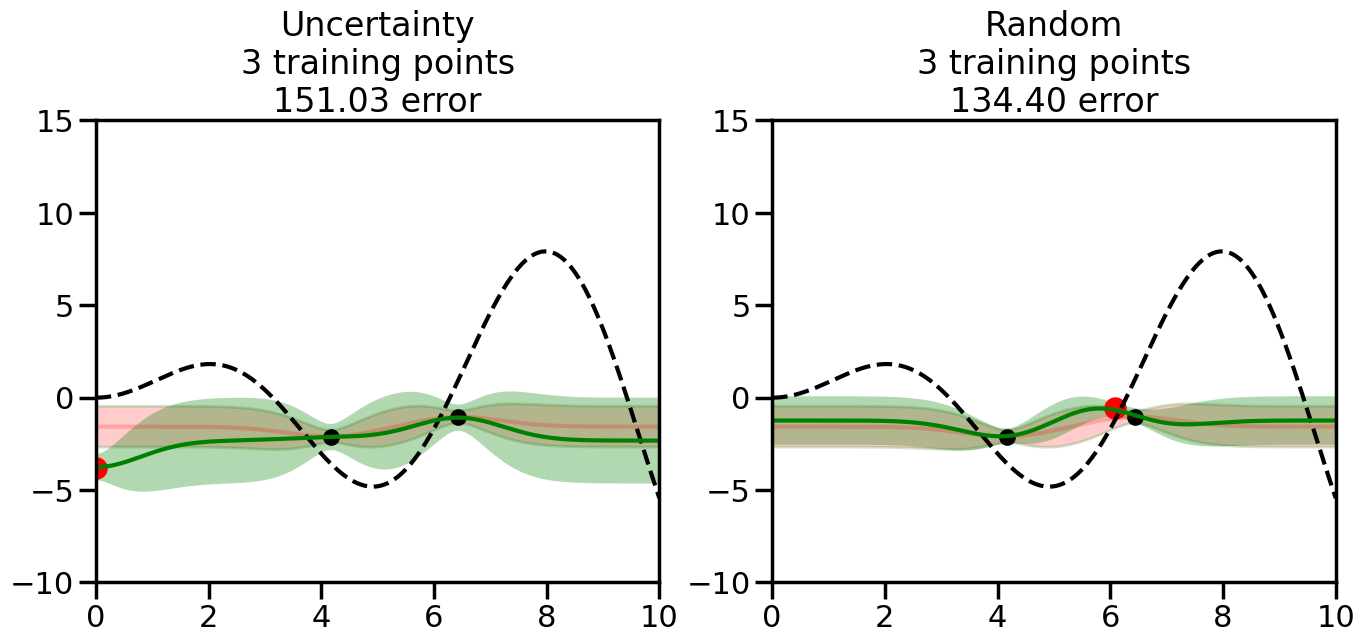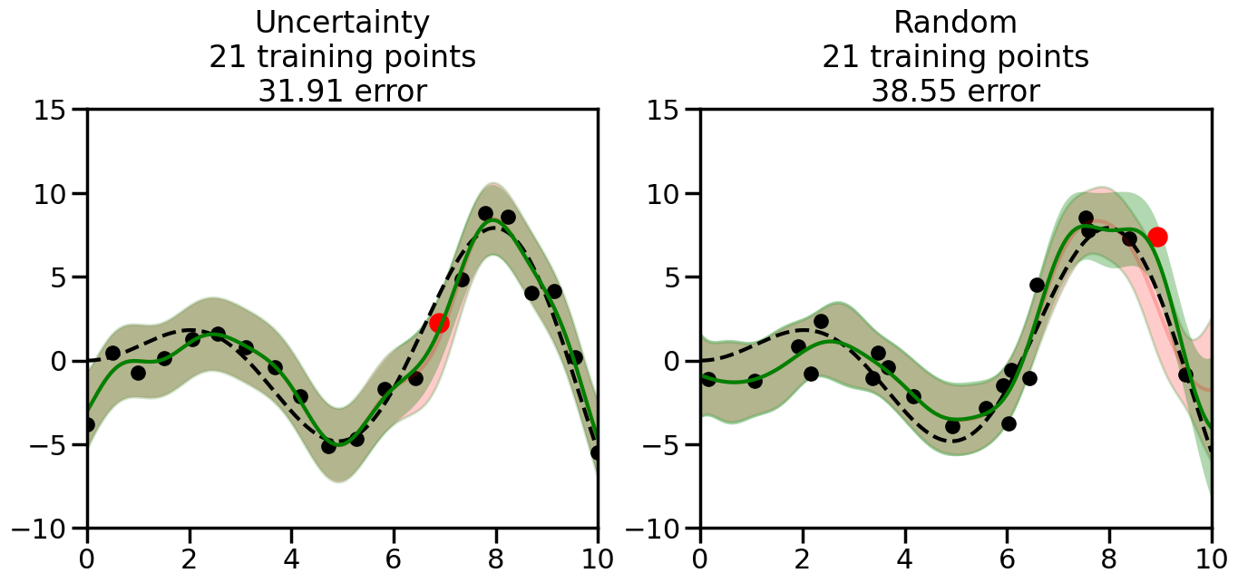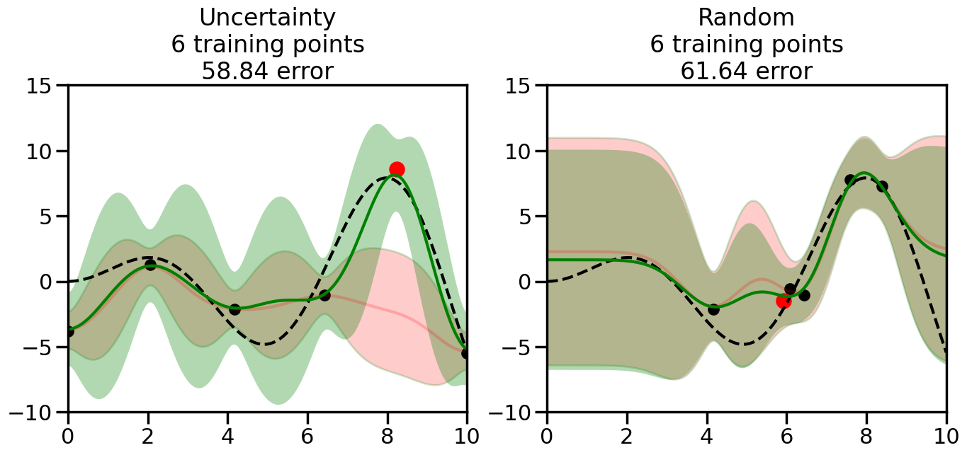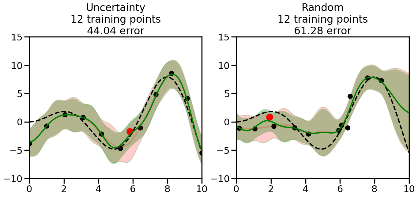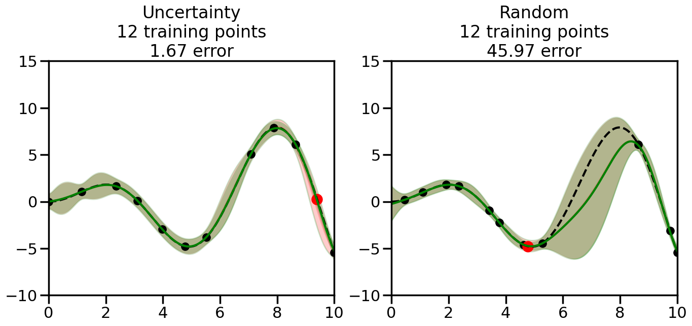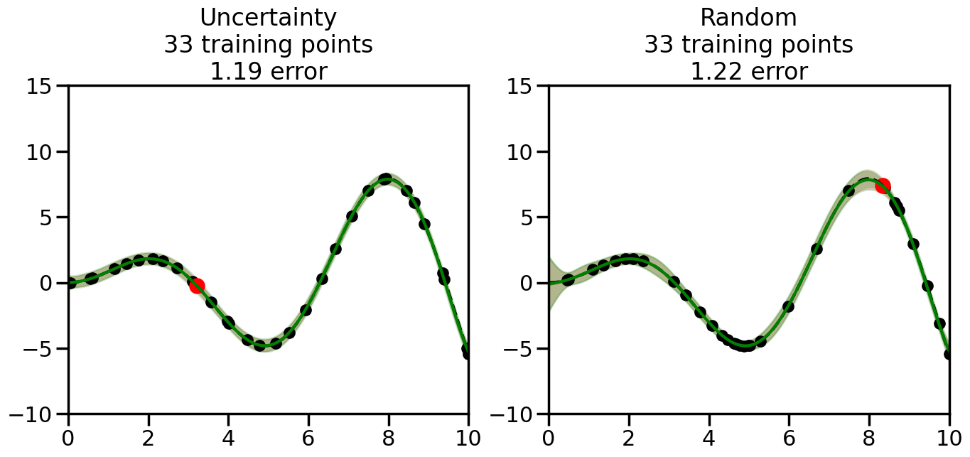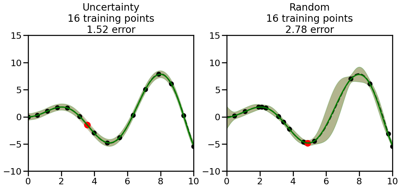 # Create the Gaussian Process model# We can start with a basic RBF kernelkernel = RBF(length_scale=1) #+ WhiteKernel(noise_level=0.01)# You can also experiment with adding noise to the kernel to see how this affects the sampling# kernel = RBF(length_scale=1) + WhiteKernel(noise_level=0.01)gp = GaussianProcessRegressor(kernel=kernel, alpha=0.01, optimizer=None, normalize_y=True, random_state=1)def sample_data_points(X, y, gp, num_points=35):"""Compare Uncertainty Sampling vs Random Sampling for Active Learning."""# Now, we are ready to begin learning!# We will have two different models that we'll test out:# 1) Uncertainty Sampling: Pick points where we are most uncertain# 2) Random Sampling: Pick points randomly# train_ind holds the indices of what training samples we'll use train_ind ={'Uncertainty': np.zeros(len(X),dtype=bool),'Random': np.zeros(len(X),dtype=bool) } options = train_ind.keys()# We can now initialize the first few training points. possible_points = np.array(list(range(len(X))))# Possible Initialization options# 1. Start with the same two randomly selected pointsfor ind in np.random.choice(possible_points,2):for o in options: train_ind[o][ind] =True# Or# 2. Start with end-points#for o in options:# train_ind[o][0] = True# train_ind[o][-1] = True# How much data should we collect? num_total_samples =35# Let's store the errors for the models: errors = {'Uncertainty':np.zeros(num_total_samples),'Random':np.zeros(num_total_samples)}# Let's select an increasing number of new points to try:for i inrange(num_total_samples):# As i increases, we increase the number of points plt.figure(figsize=(16,6))for j,o inenumerate(options): # For each sampling option plt.subplot(1,2,j+1) # Create different subplot# Fit the original GP Model (without the new point): gp.fit(X[train_ind[o],:],y[train_ind[o]])# Plot the original model's bounds (just for comparison sake) yp,sigma = gp.predict(x, return_std=True) plt.fill(np.concatenate([x, x[::-1]]), np.concatenate([yp -1.9600* sigma, (yp +1.9600* sigma)[::-1]]),'r', alpha=0.2, ec='g', label='95% confidence interval')# Plot the predicted function plt.plot(x,yp,'r-',alpha=0.2)######## Now do the Active Learning part####### # Here is Uncertainty Sampling:if o =='Uncertainty':# First, we need to predict the MSE (uncertainty) at# each of the non-training points: yp,sigma = gp.predict(X[~train_ind[o],:], return_std=True)# The points that we'll choose from are the points that have the# maximum mean square error in the GP (highest uncertainty) candidates = np.extract(sigma == np.amax(sigma),X[~train_ind[o],:])# Side note:# If you wanted to turn Uncertainty Sampling into Global Bayesian# Optimization instead, then uncomment the below two lines, which implements# Upper Confidence Bound (UCB) sampling:# ucb = yp + 1.96*sigma# candidates = np.extract(ucb == np.amax(ucb),X[~train_ind[o],:])# Choose the next sampling point randomly from the max candidates# (It is unlikely that len(candidates)>1, but you never know) next_point = np.random.choice(candidates.flatten())# Find the training sample index corresponding to the next sample next_ind = np.argwhere(X.flatten() == next_point)# Here is Random Sampling:elif o =='Random':# Just pick the point randomly from the points that we # haven't chosen already (i.e., ~train_ind[o]) next_ind = np.random.choice(possible_points[~train_ind[o]],1)# Add the selected point to the training samples train_ind[o][next_ind] =True######## Done with Active Learning part####### # Fit the GP again, this time with the added training point: gp.fit(X[train_ind[o],:],y[train_ind[o]])# Now plot the updated model so we can see the difference: yp,sigma = gp.predict(x, return_std=True)# Draw the 95% Confidence Interval plt.fill(np.concatenate([x, x[::-1]]), np.concatenate([yp -1.9600* sigma, (yp +1.9600* sigma)[::-1]]),'g', alpha=0.3, ec='None', label='95% confidence interval')# Plot the original function plt.plot(x,f(x),'k--',alpha=1)# Plot the predicted function plt.plot(x,yp,'g-',alpha=1)# Plot the original training points plt.scatter(X[train_ind[o],:],y[train_ind[o]],color='k',s=100)# Highlight the point we just added plt.scatter(X[next_ind,:].flatten(),y[next_ind].flatten(),color='r',s=200) plt.ylim([-10,15]) # Set the y-axis limits plt.xlim([0,10]) # Set the x-axis limits# Label the figure title with the number of total training points# and the total error between the predicted and actual curves n_train = np.count_nonzero(train_ind[o]) error = np.linalg.norm(yp-f(x).flatten()) errors[o][i]=error plt.title("%s\n%d training points\n%.2f error"%(o,n_train,error)) plt.show()return errorserrors = sample_data_points(X, y, gp, num_points=35)