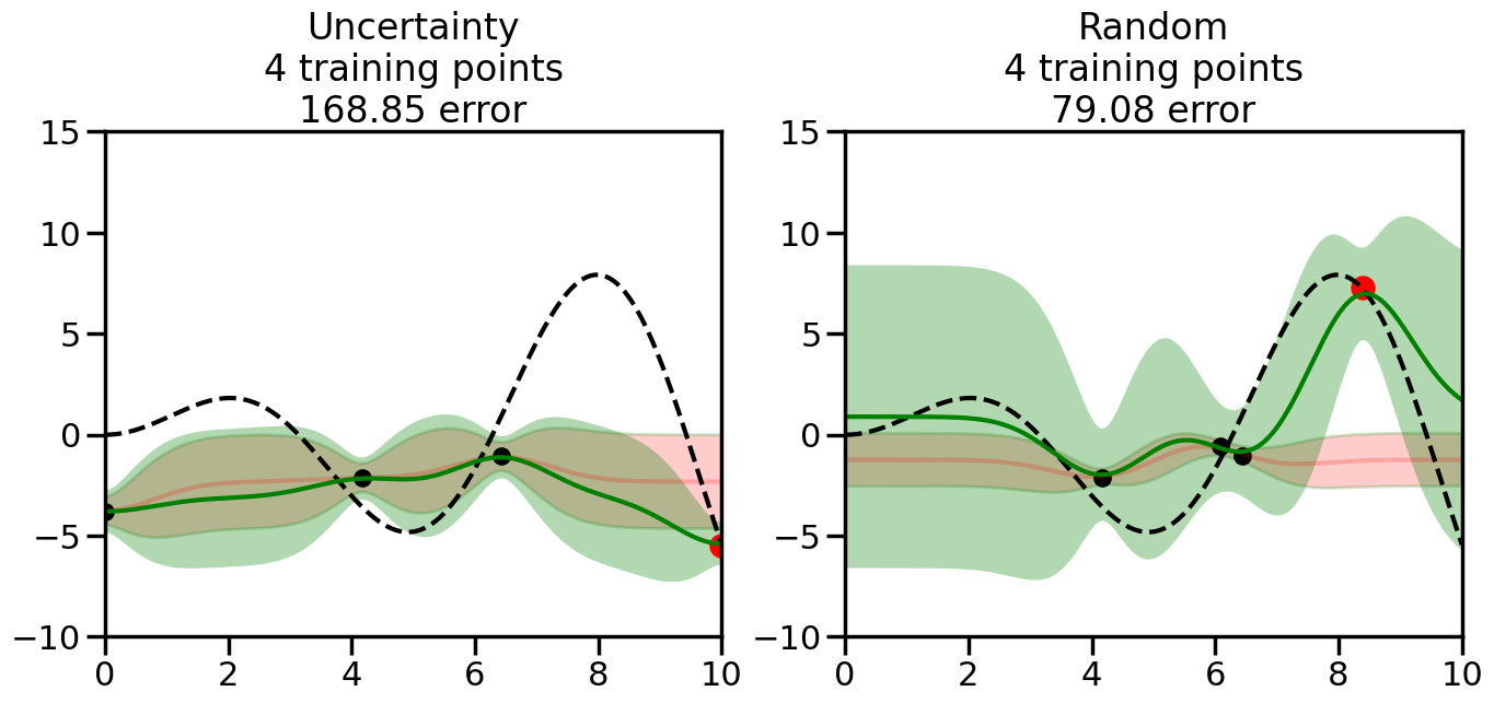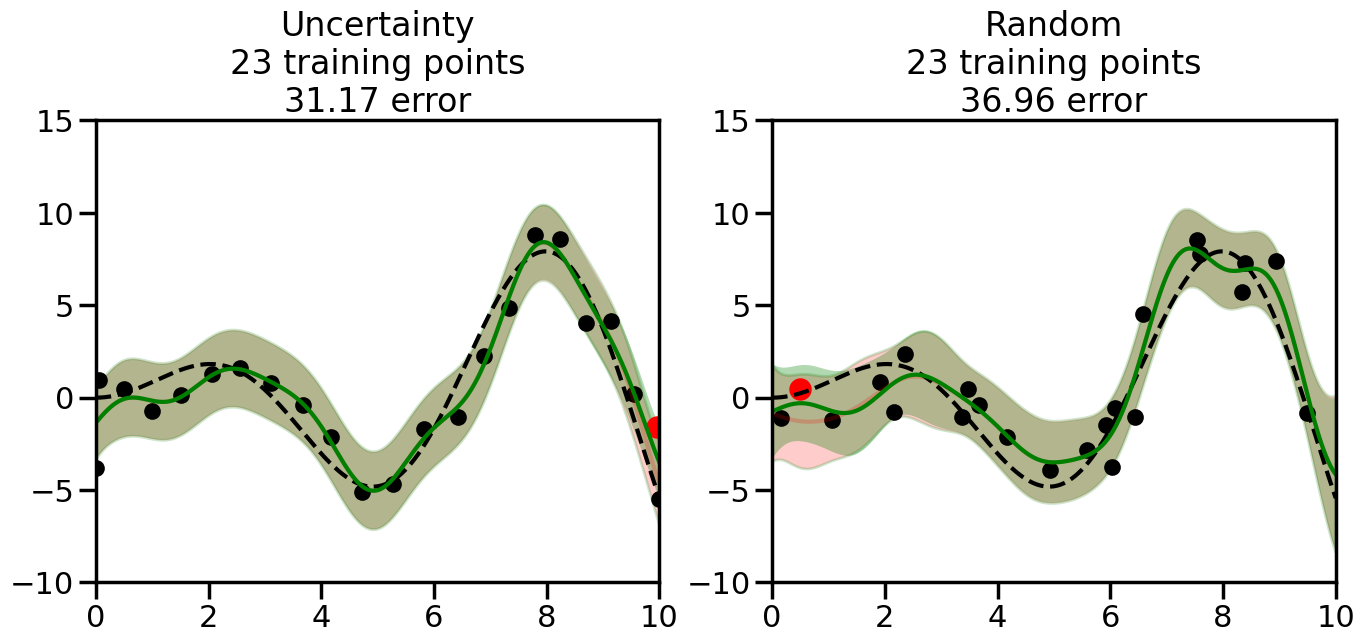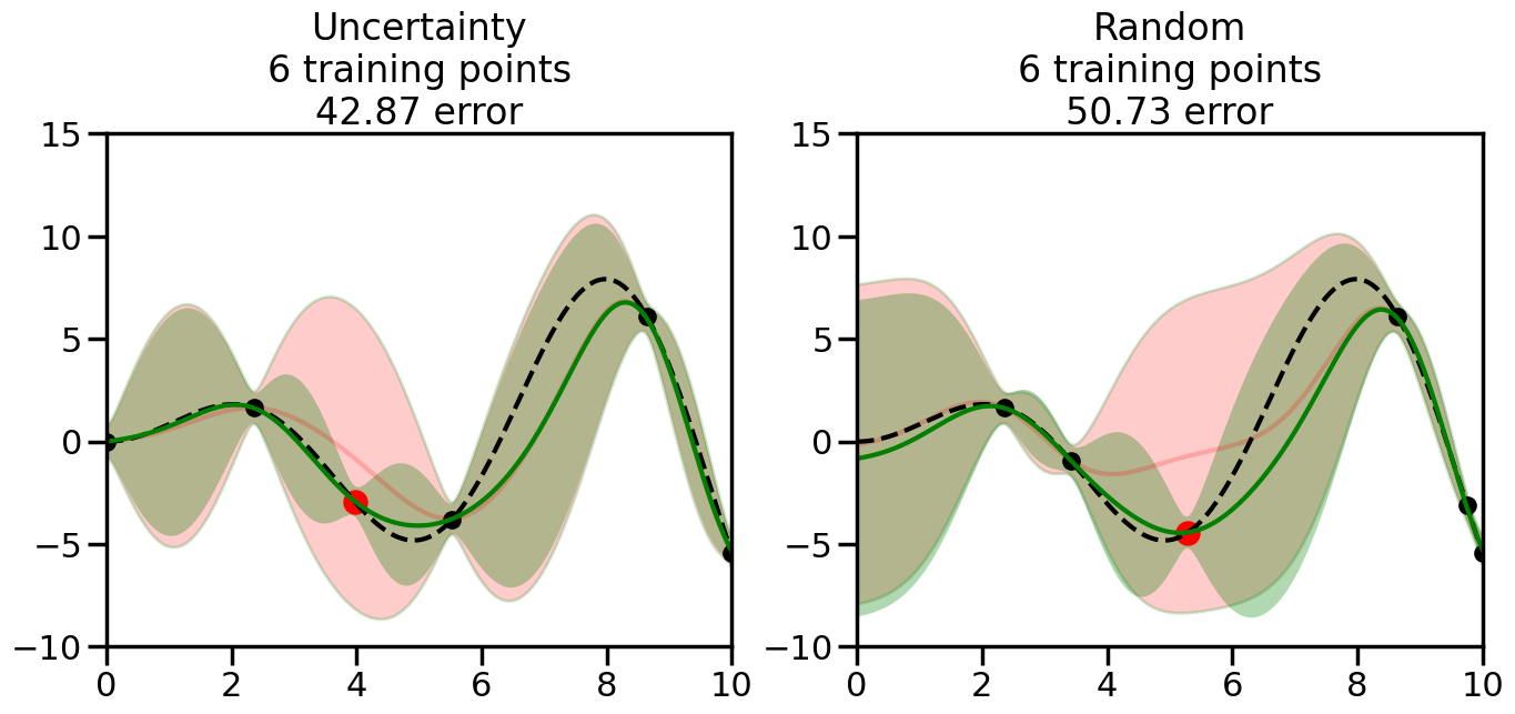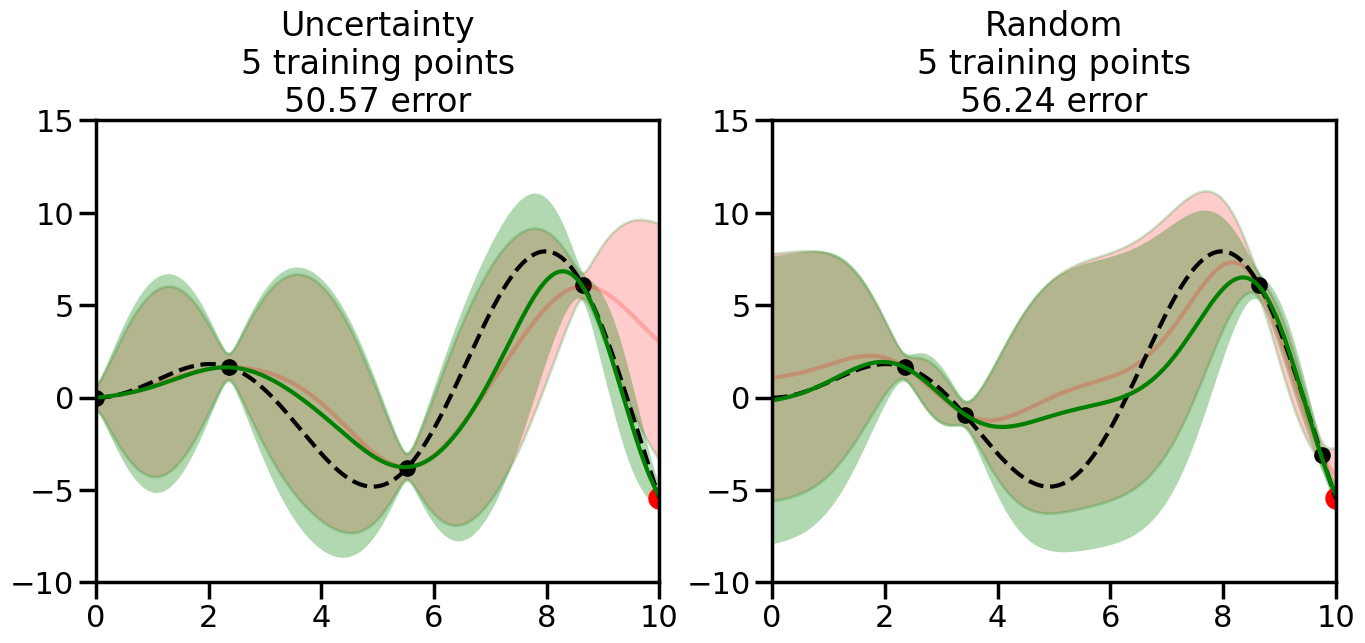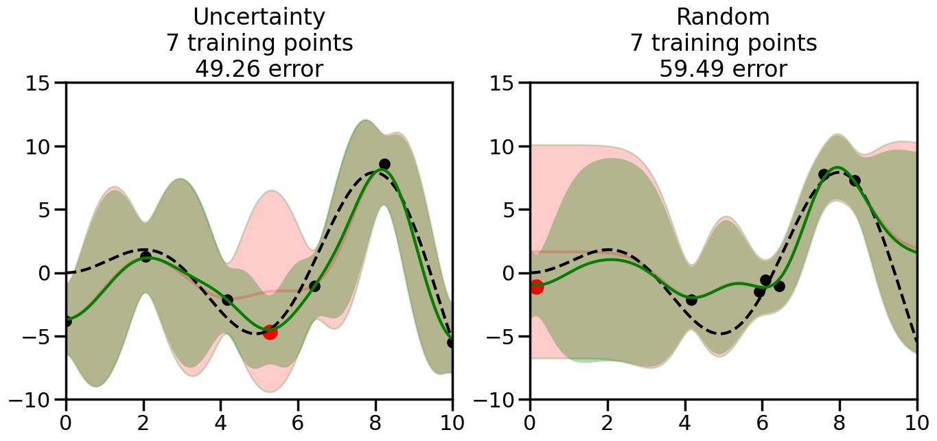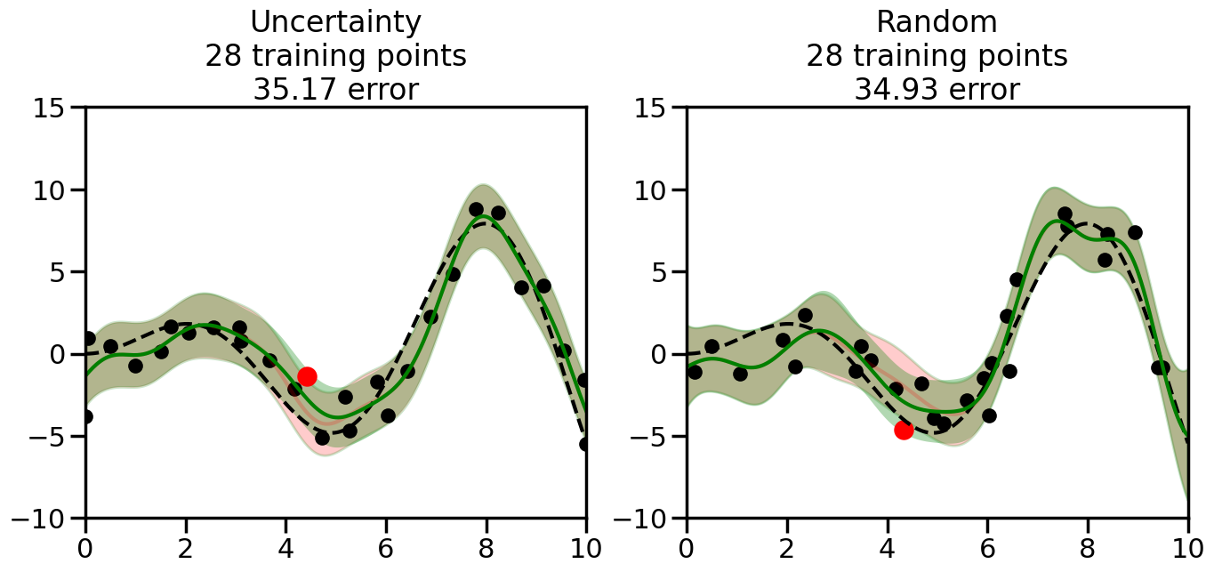 # Create the Gaussian Process model# We can start with a basic RBF kernelkernel = RBF(length_scale=1) #+ WhiteKernel(noise_level=0.01)# You can also experiment with adding noise to the kernel to see how this affects the sampling# kernel = RBF(length_scale=1) + WhiteKernel(noise_level=0.01)gp = GaussianProcessRegressor(kernel=kernel, alpha=0.01, optimizer=None, normalize_y=True, random_state=1)def sample_data_points(X, y, gp, num_points=35):"""Compare Uncertainty Sampling vs Random Sampling for Active Learning."""# Now, we are ready to begin learning!# We will have two different models that we'll test out:# 1) Uncertainty Sampling: Pick points where we are most uncertain# 2) Random Sampling: Pick points randomly# train_ind holds the indices of what training samples we'll use train_ind ={'Uncertainty': np.zeros(len(X),dtype=bool),'Random': np.zeros(len(X),dtype=bool) } options = train_ind.keys()# We can now initialize the first few training points. possible_points = np.array(list(range(len(X))))# Possible Initialization options# 1. Start with the same two randomly selected pointsfor ind in np.random.choice(possible_points,2):for o in options: train_ind[o][ind] =True# Or# 2. Start with end-points#for o in options:# train_ind[o][0] = True# train_ind[o][-1] = True# How much data should we collect? num_total_samples =35# Let's store the errors for the models: errors = {'Uncertainty':np.zeros(num_total_samples),'Random':np.zeros(num_total_samples)}# Let's select an increasing number of new points to try:for i inrange(num_total_samples):# As i increases, we increase the number of points plt.figure(figsize=(16,6))for j,o inenumerate(options): # For each sampling option plt.subplot(1,2,j+1) # Create different subplot# Fit the original GP Model (without the new point): gp.fit(X[train_ind[o],:],y[train_ind[o]])# Plot the original model's bounds (just for comparison sake) yp,sigma = gp.predict(x, return_std=True) plt.fill(np.concatenate([x, x[::-1]]), np.concatenate([yp -1.9600* sigma, (yp +1.9600* sigma)[::-1]]),'r', alpha=0.2, ec='g', label='95% confidence interval')# Plot the predicted function plt.plot(x,yp,'r-',alpha=0.2)######## Now do the Active Learning part####### # Here is Uncertainty Sampling:if o =='Uncertainty':# First, we need to predict the MSE (uncertainty) at# each of the non-training points: yp,sigma = gp.predict(X[~train_ind[o],:], return_std=True)# The points that we'll choose from are the points that have the# maximum mean square error in the GP (highest uncertainty) candidates = np.extract(sigma == np.amax(sigma),X[~train_ind[o],:])# Side note:# If you wanted to turn Uncertainty Sampling into Global Bayesian# Optimization instead, then uncomment the below two lines, which implements# Upper Confidence Bound (UCB) sampling:# ucb = yp + 1.96*sigma# candidates = np.extract(ucb == np.amax(ucb),X[~train_ind[o],:])# Choose the next sampling point randomly from the max candidates# (It is unlikely that len(candidates)>1, but you never know) next_point = np.random.choice(candidates.flatten())# Find the training sample index corresponding to the next sample next_ind = np.argwhere(X.flatten() == next_point)# Here is Random Sampling:elif o =='Random':# Just pick the point randomly from the points that we # haven't chosen already (i.e., ~train_ind[o]) next_ind = np.random.choice(possible_points[~train_ind[o]],1)# Add the selected point to the training samples train_ind[o][next_ind] =True######## Done with Active Learning part####### # Fit the GP again, this time with the added training point: gp.fit(X[train_ind[o],:],y[train_ind[o]])# Now plot the updated model so we can see the difference: yp,sigma = gp.predict(x, return_std=True)# Draw the 95% Confidence Interval plt.fill(np.concatenate([x, x[::-1]]), np.concatenate([yp -1.9600* sigma, (yp +1.9600* sigma)[::-1]]),'g', alpha=0.3, ec='None', label='95% confidence interval')# Plot the original function plt.plot(x,f(x),'k--',alpha=1)# Plot the predicted function plt.plot(x,yp,'g-',alpha=1)# Plot the original training points plt.scatter(X[train_ind[o],:],y[train_ind[o]],color='k',s=100)# Highlight the point we just added plt.scatter(X[next_ind,:].flatten(),y[next_ind].flatten(),color='r',s=200) plt.ylim([-10,15]) # Set the y-axis limits plt.xlim([0,10]) # Set the x-axis limits# Label the figure title with the number of total training points# and the total error between the predicted and actual curves n_train = np.count_nonzero(train_ind[o]) error = np.linalg.norm(yp-f(x).flatten()) errors[o][i]=error plt.title("%s\n%d training points\n%.2f error"%(o,n_train,error)) plt.show()return errorserrors = sample_data_points(X, y, gp, num_points=35)