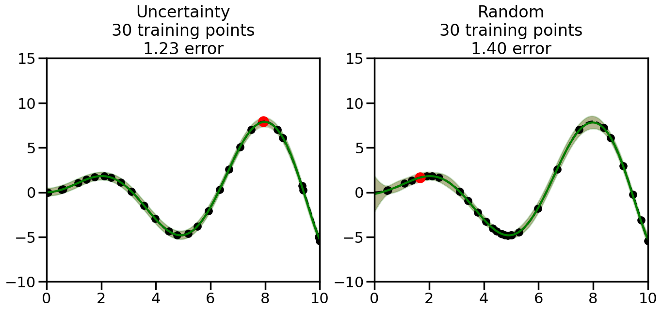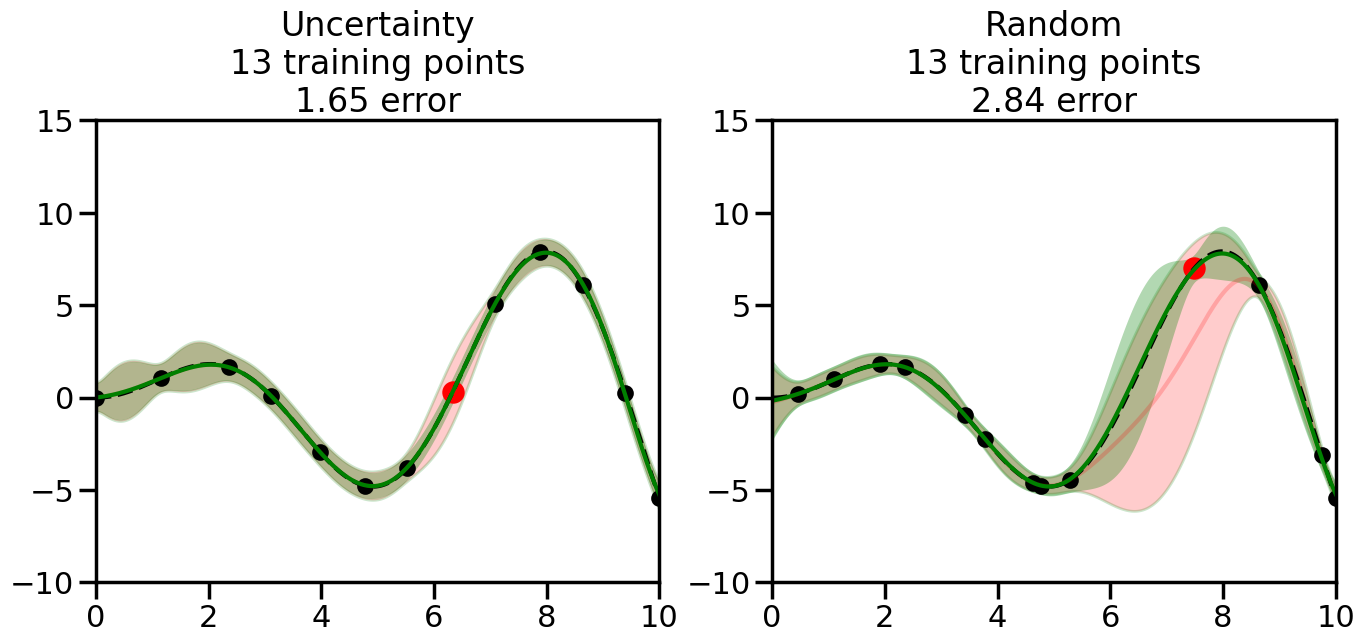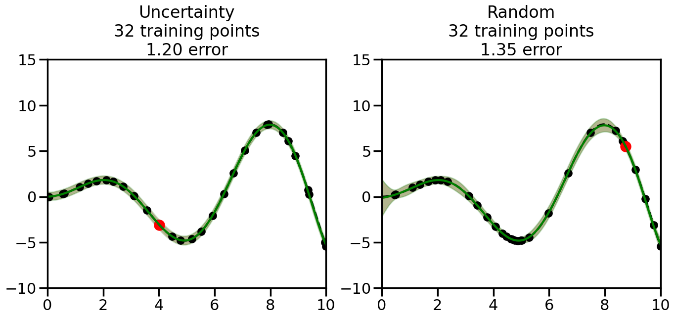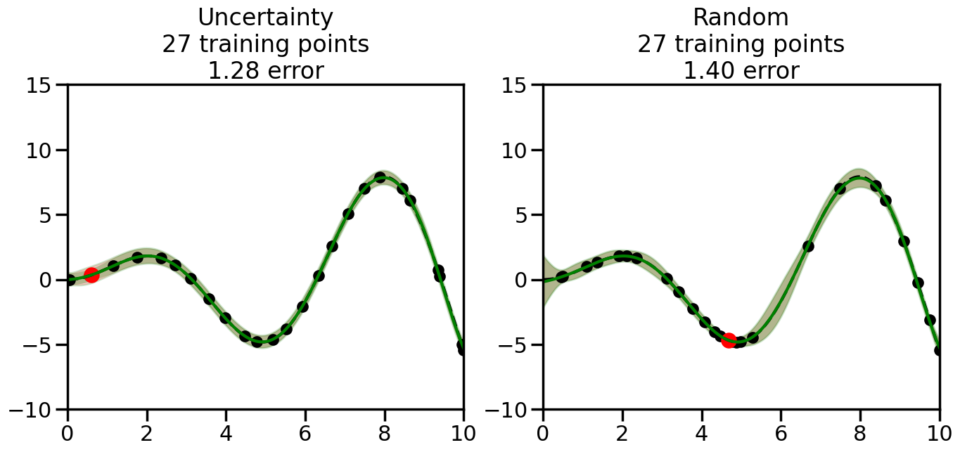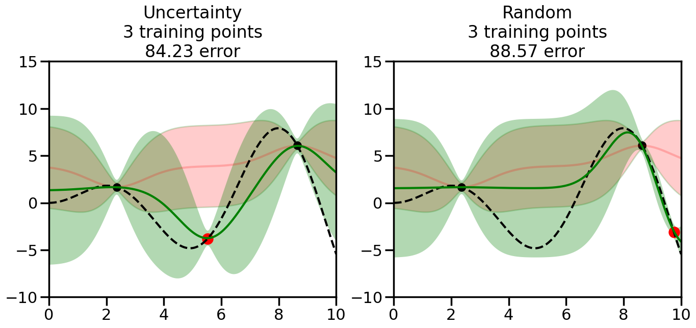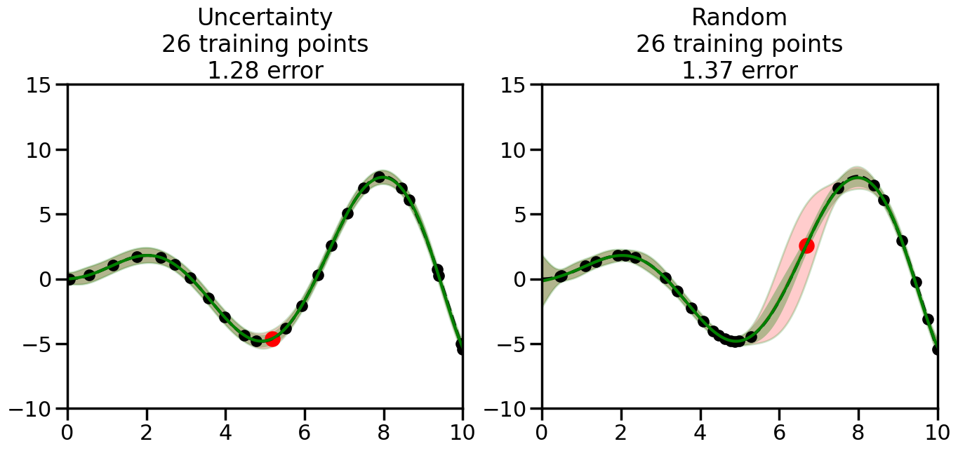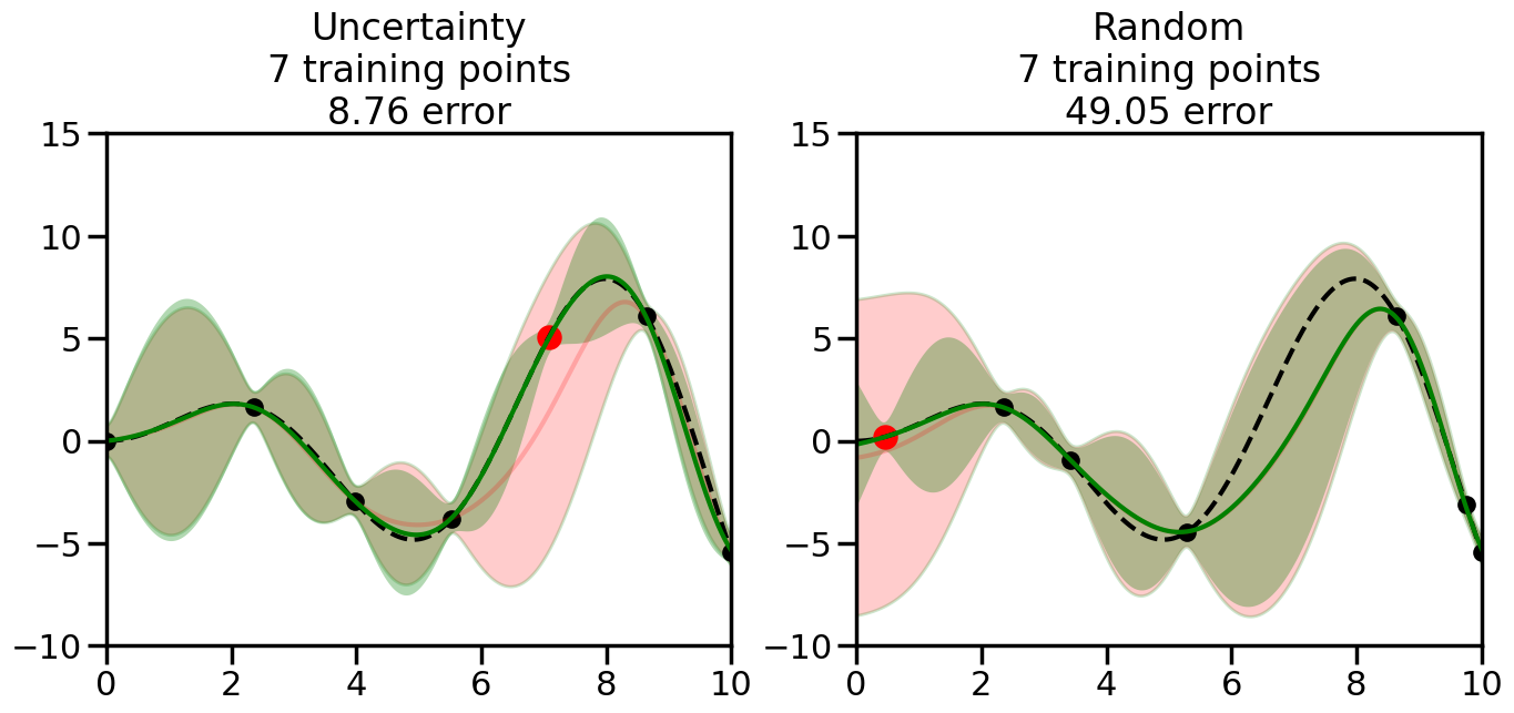 # Create the Gaussian Process model# We can start with a basic RBF kernelkernel = RBF(length_scale=1) #+ WhiteKernel(noise_level=0.01)# You can also experiment with adding noise to the kernel to see how this affects the sampling# kernel = RBF(length_scale=1) + WhiteKernel(noise_level=0.01)gp = GaussianProcessRegressor(kernel=kernel, alpha=0.01, optimizer=None, normalize_y=True, random_state=1)def sample_data_points(X, y, gp, num_points=35):"""Compare Uncertainty Sampling vs Random Sampling for Active Learning."""# Now, we are ready to begin learning!# We will have two different models that we'll test out:# 1) Uncertainty Sampling: Pick points where we are most uncertain# 2) Random Sampling: Pick points randomly# train_ind holds the indices of what training samples we'll use train_ind ={'Uncertainty': np.zeros(len(X),dtype=bool),'Random': np.zeros(len(X),dtype=bool) } options = train_ind.keys()# We can now initialize the first few training points. possible_points = np.array(list(range(len(X))))# Possible Initialization options# 1. Start with the same two randomly selected pointsfor ind in np.random.choice(possible_points,2):for o in options: train_ind[o][ind] =True# Or# 2. Start with end-points#for o in options:# train_ind[o][0] = True# train_ind[o][-1] = True# How much data should we collect? num_total_samples =35# Let's store the errors for the models: errors = {'Uncertainty':np.zeros(num_total_samples),'Random':np.zeros(num_total_samples)}# Let's select an increasing number of new points to try:for i inrange(num_total_samples):# As i increases, we increase the number of points plt.figure(figsize=(16,6))for j,o inenumerate(options): # For each sampling option plt.subplot(1,2,j+1) # Create different subplot# Fit the original GP Model (without the new point): gp.fit(X[train_ind[o],:],y[train_ind[o]])# Plot the original model's bounds (just for comparison sake) yp,sigma = gp.predict(x, return_std=True) plt.fill(np.concatenate([x, x[::-1]]), np.concatenate([yp -1.9600* sigma, (yp +1.9600* sigma)[::-1]]),'r', alpha=0.2, ec='g', label='95% confidence interval')# Plot the predicted function plt.plot(x,yp,'r-',alpha=0.2)######## Now do the Active Learning part####### # Here is Uncertainty Sampling:if o =='Uncertainty':# First, we need to predict the MSE (uncertainty) at# each of the non-training points: yp,sigma = gp.predict(X[~train_ind[o],:], return_std=True)# The points that we'll choose from are the points that have the# maximum mean square error in the GP (highest uncertainty) candidates = np.extract(sigma == np.amax(sigma),X[~train_ind[o],:])# Side note:# If you wanted to turn Uncertainty Sampling into Global Bayesian# Optimization instead, then uncomment the below two lines, which implements# Upper Confidence Bound (UCB) sampling:# ucb = yp + 1.96*sigma# candidates = np.extract(ucb == np.amax(ucb),X[~train_ind[o],:])# Choose the next sampling point randomly from the max candidates# (It is unlikely that len(candidates)>1, but you never know) next_point = np.random.choice(candidates.flatten())# Find the training sample index corresponding to the next sample next_ind = np.argwhere(X.flatten() == next_point)# Here is Random Sampling:elif o =='Random':# Just pick the point randomly from the points that we # haven't chosen already (i.e., ~train_ind[o]) next_ind = np.random.choice(possible_points[~train_ind[o]],1)# Add the selected point to the training samples train_ind[o][next_ind] =True######## Done with Active Learning part####### # Fit the GP again, this time with the added training point: gp.fit(X[train_ind[o],:],y[train_ind[o]])# Now plot the updated model so we can see the difference: yp,sigma = gp.predict(x, return_std=True)# Draw the 95% Confidence Interval plt.fill(np.concatenate([x, x[::-1]]), np.concatenate([yp -1.9600* sigma, (yp +1.9600* sigma)[::-1]]),'g', alpha=0.3, ec='None', label='95% confidence interval')# Plot the original function plt.plot(x,f(x),'k--',alpha=1)# Plot the predicted function plt.plot(x,yp,'g-',alpha=1)# Plot the original training points plt.scatter(X[train_ind[o],:],y[train_ind[o]],color='k',s=100)# Highlight the point we just added plt.scatter(X[next_ind,:].flatten(),y[next_ind].flatten(),color='r',s=200) plt.ylim([-10,15]) # Set the y-axis limits plt.xlim([0,10]) # Set the x-axis limits# Label the figure title with the number of total training points# and the total error between the predicted and actual curves n_train = np.count_nonzero(train_ind[o]) error = np.linalg.norm(yp-f(x).flatten()) errors[o][i]=error plt.title("%s\n%d training points\n%.2f error"%(o,n_train,error)) plt.show()return errorserrors = sample_data_points(X, y, gp, num_points=35)