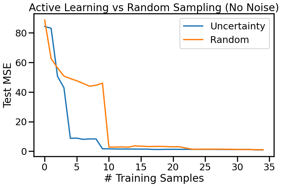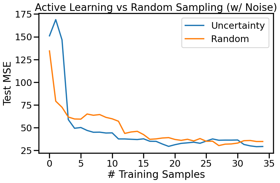 While the above example shows the effectiveness of uncertainty sampling in a noise-free scenario, real-world data is often noisy. To simulate this, we can add Gaussian noise to our observations. This will help us understand how uncertainty sampling performs when the data is not perfectly clean. Intuitively, we expect that uncertainty sampling will still be effective, but the presence of noise may lead to selecting points that are not as informative as in the noise-free case, and that as the noise increases the benefits we accrue from Active Learning may diminish. We can modify the previous example code to include Gaussian noise in the observations and observe how the model’s performance changes with uncertainty sampling compared to random sampling.