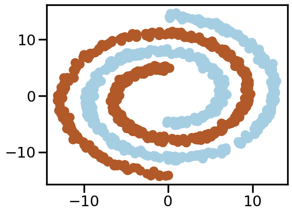 from sklearn.datasets import make_swiss_roll# Make a double roll datasetdef roll_it(n_samples=1000, noise=0.0): X1 = make_swiss_roll(n_samples=int(n_samples/2),noise=noise)[0][:,[0,2]] X2 = make_swiss_roll(n_samples=int(n_samples/2),noise=noise)[0][:,[0,2]] X = np.vstack([X1,-X2]) y = np.hstack([[0]*len(X1),[1]*len(X2)])return X,y